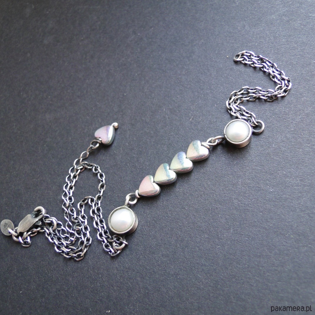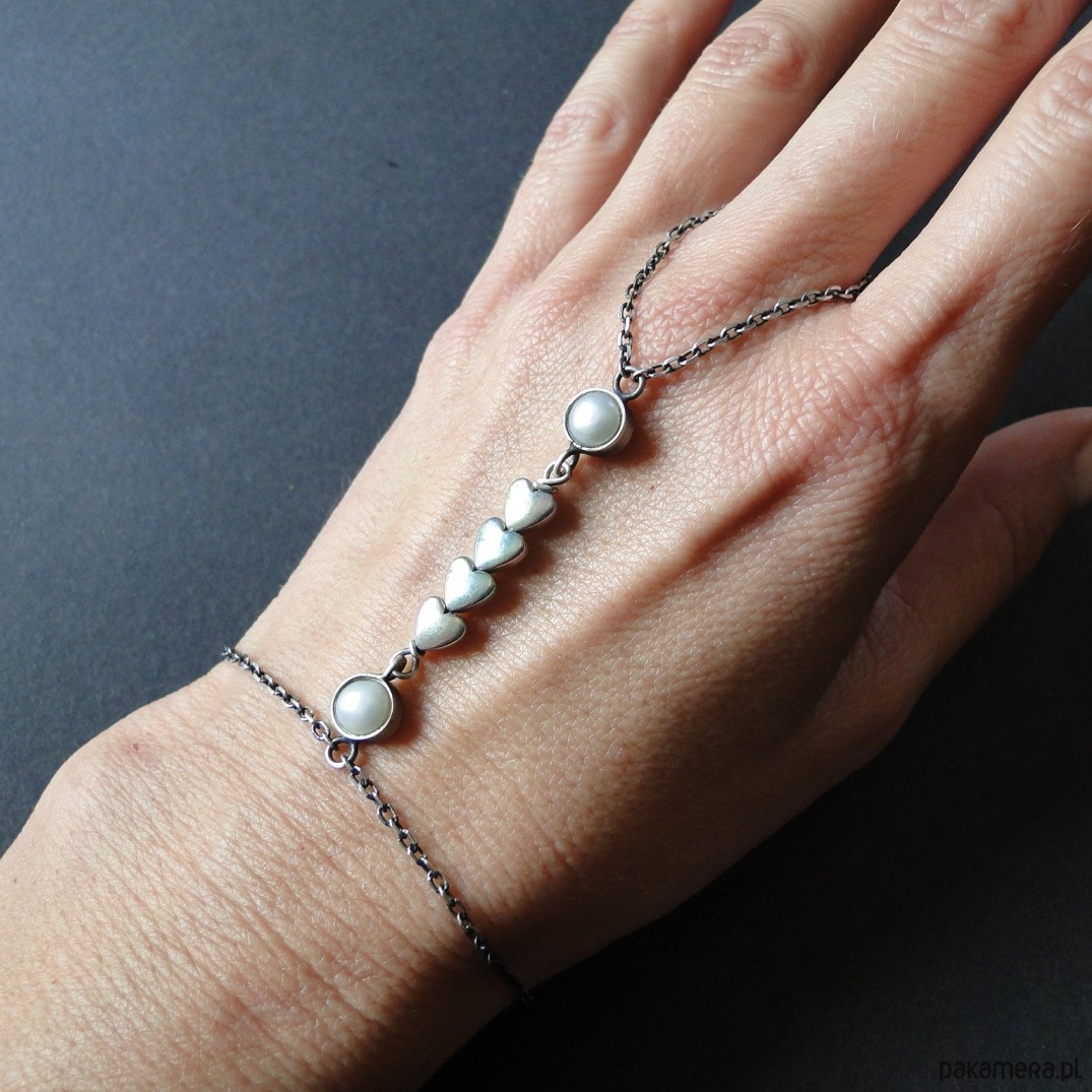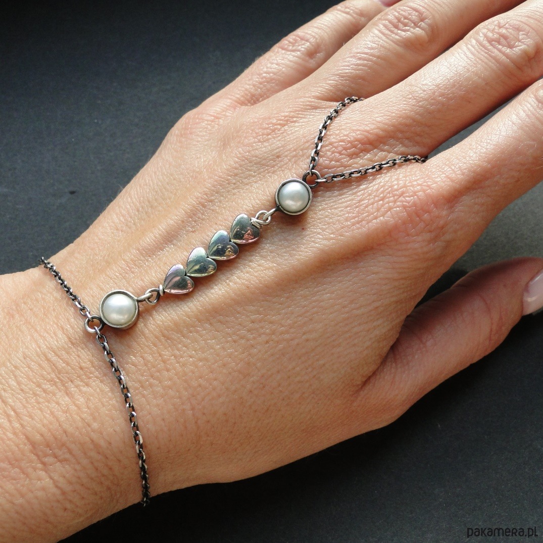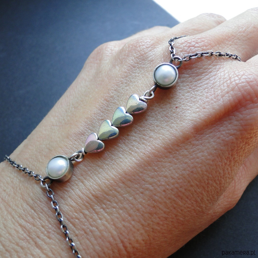 Subtelna, oryginalna bransoleta wykonana własnoręcznie ze srebra 930. Oksydowana i szorowana. Zakładana na palec i nadgarstek, jak na zdjęciu. Naturalne białe perły hodowlane śr. 6mm. Małe serca 6mm z kolorowego hematytu-odcienie zieleni,niebieskiego,różu i fioletu. Perły w ręcznie wykonanej oprawie. Rozmiar regulowany. Na szczupłą rękę polecam zapinać jak najciaśniej w nadgarstku. Do ze stawu można dokupić pierścionek i nausznice (pojedyncze egzemplarze)