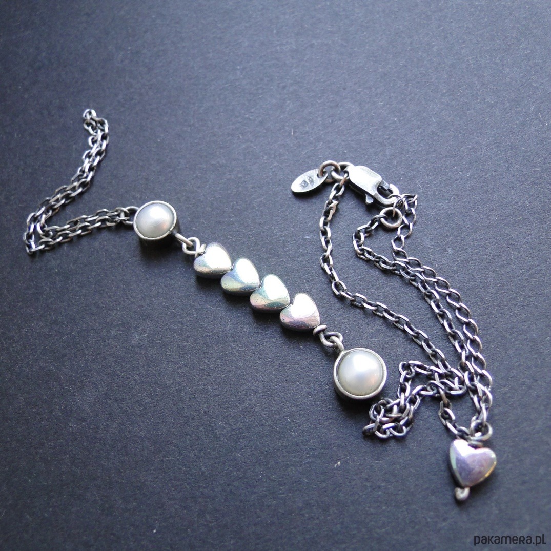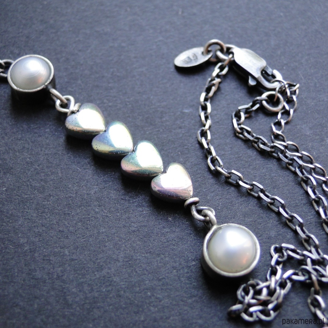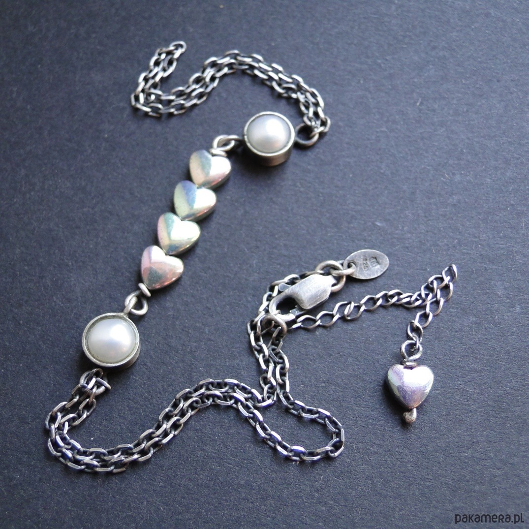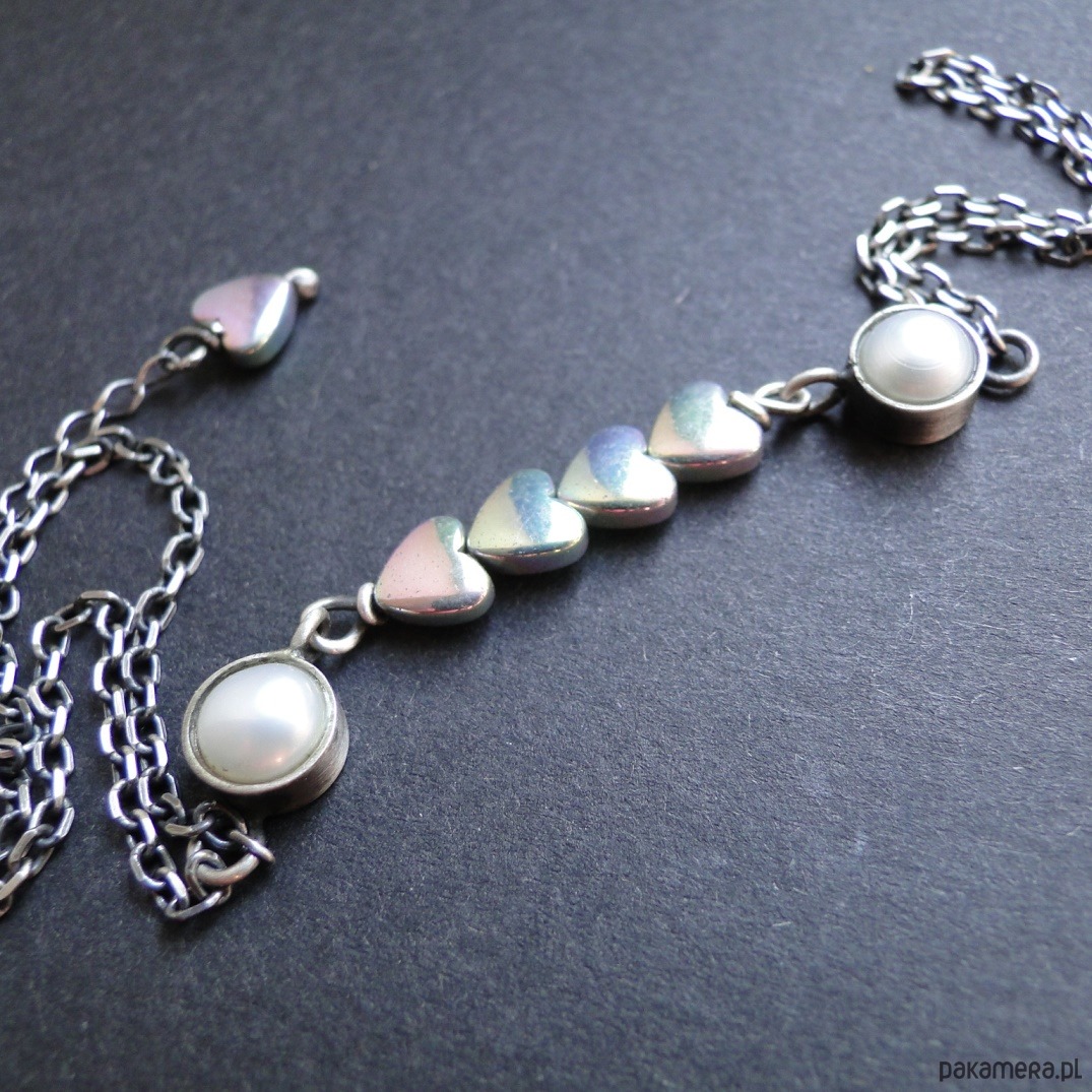 Subtelna, oryginalna bransoleta wykonana własnoręcznie ze srebra 930. Oksydowana i szorowana. Zakładana na palec i nadgarstek, jak na zdjęciu. Naturalne białe perły hodowlane śr. 6mm. Małe serca 6mm z kolorowego hematytu-odcienie zieleni,niebieskiego,różu i fioletu. Perły w ręcznie wykonanej oprawie. Rozmiar regulowany. Na szczupłą rękę polecam zapinać jak najciaśniej w nadgarstku. Do ze stawu można dokupić pierścionek i nausznice (pojedyncze egzemplarze)