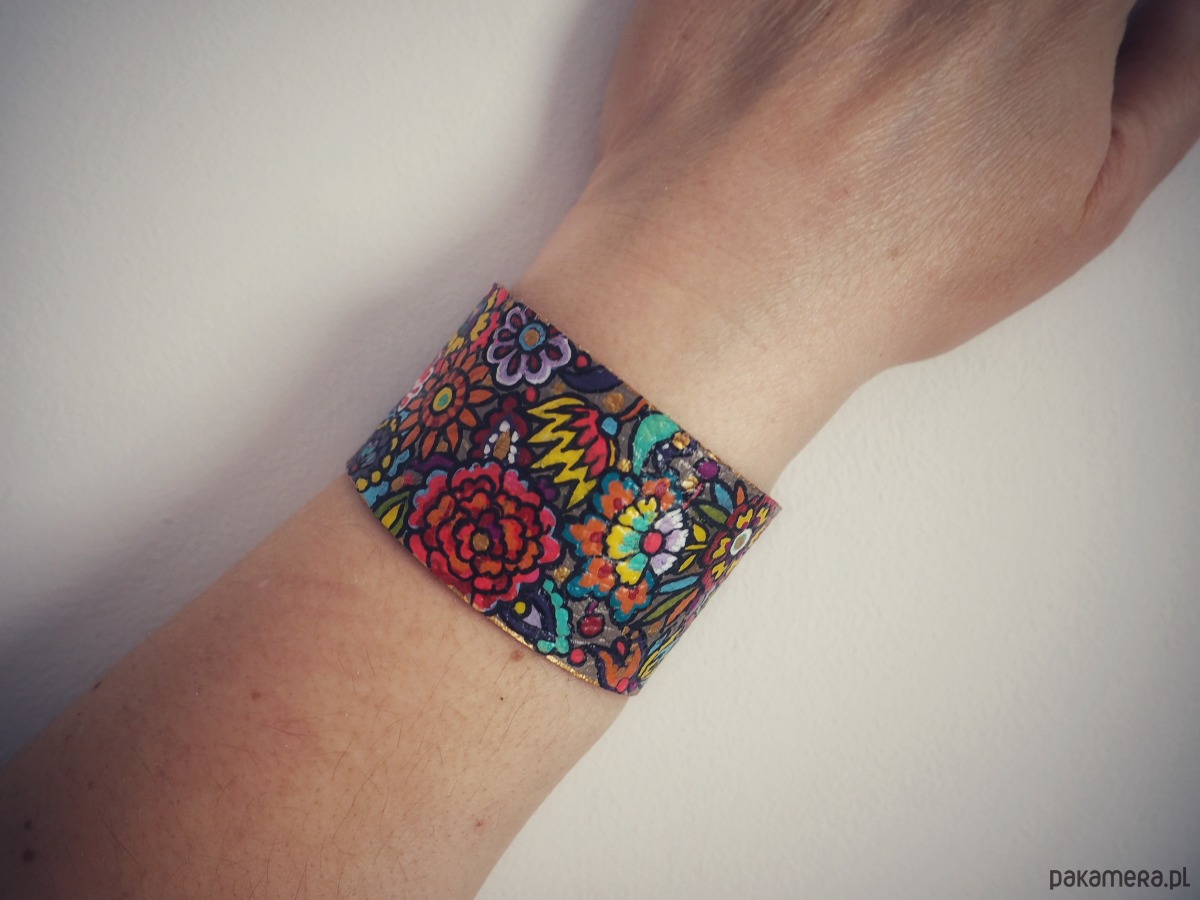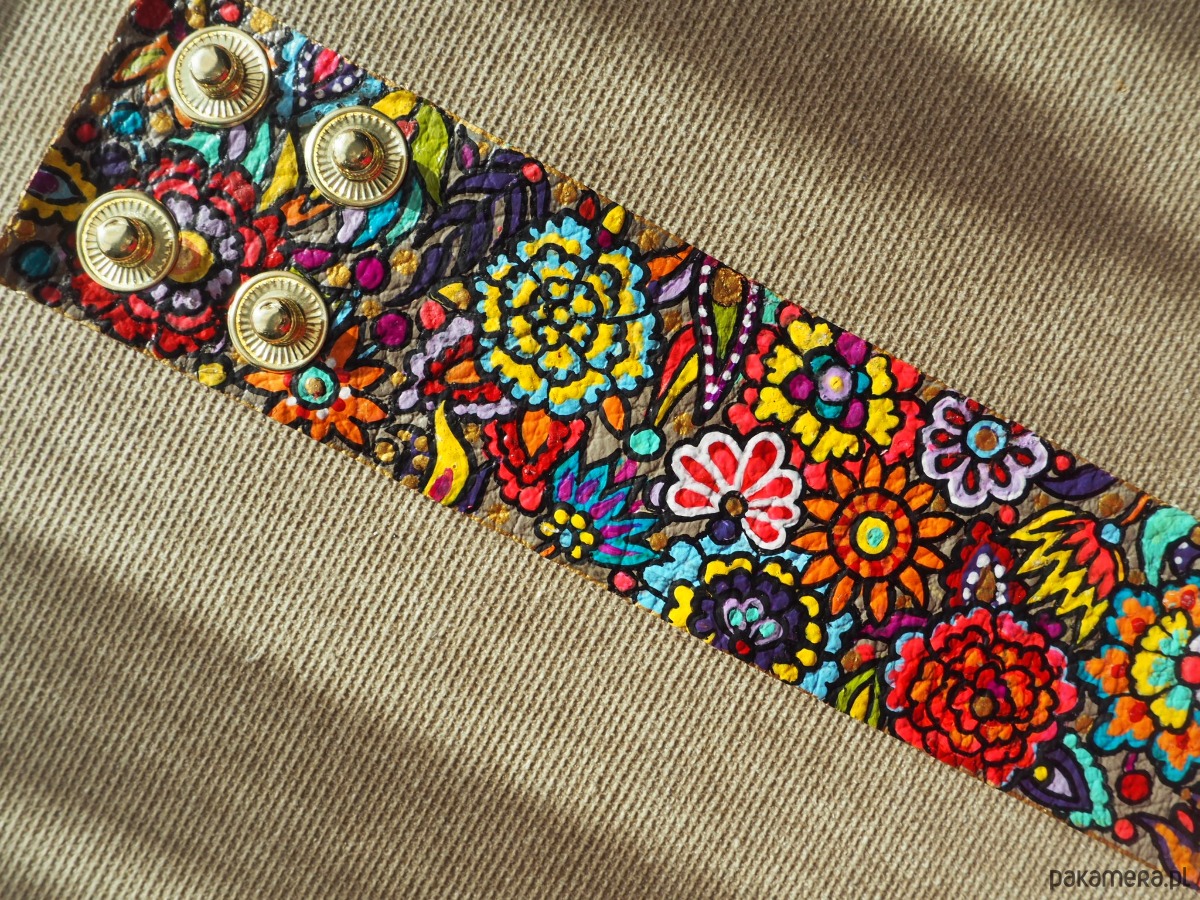 Ta wspaniała barwna skórzana bransoleta będzie doskonałym prezentem dla bliskiej Ci osoby. Wykonana z prawdziwej skóry z recyklingu, z unikalnym wzorem, ręcznie malowana, wygodna w noszeniu.