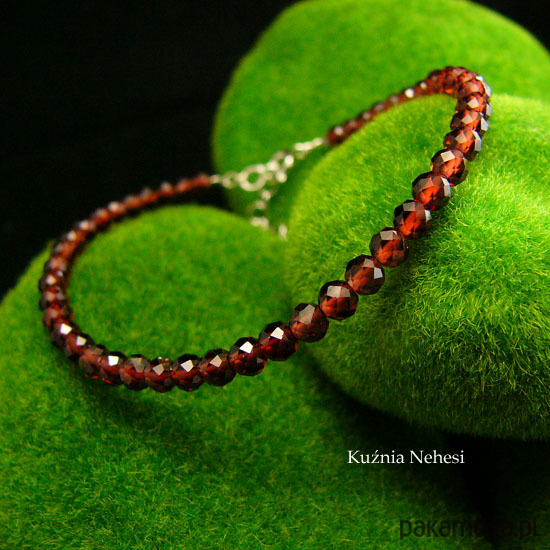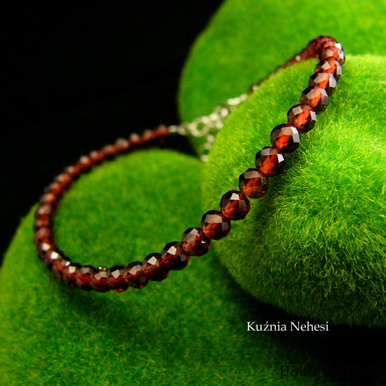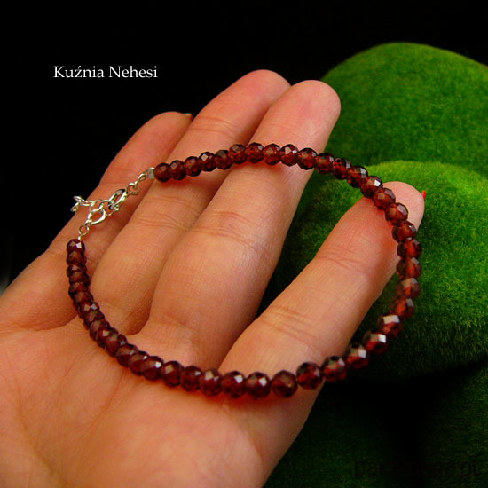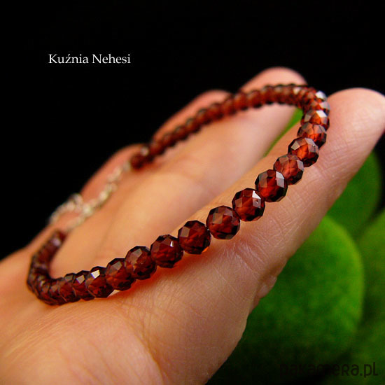 Delikatna bransoleta wykonana ręcznie ze srebra próby 925 oraz przepięknych o idealnym szlifie i klasie AAA, mikrofasetowanych naturalnych Granatów Almandyn. Bransoleta jest z regulacją, więc pasuje na każdy nadgarstek, mogę ją dopasować specjalnie dla Ciebie. Polecam Nehesi