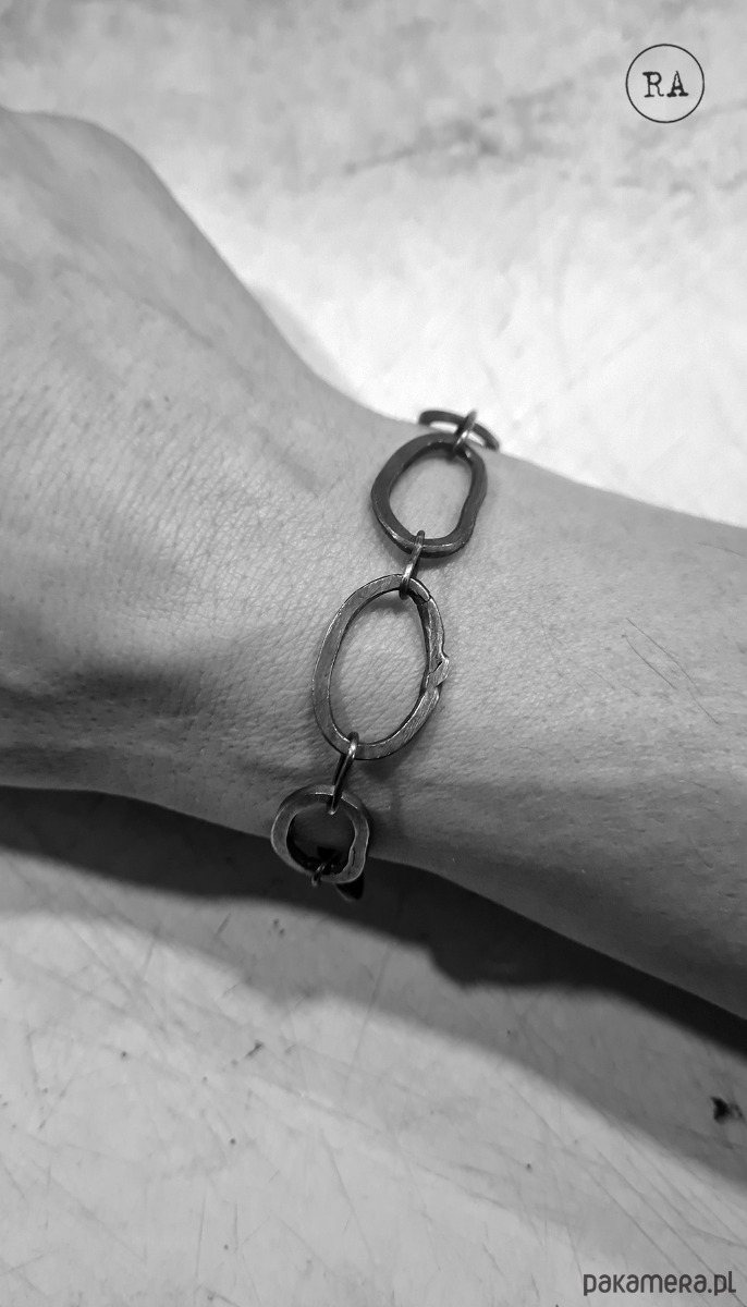 Bransoleta ze srebra, oksydowana, ręcznie kuta. Obwód max. 20,5 cm. Unisex.