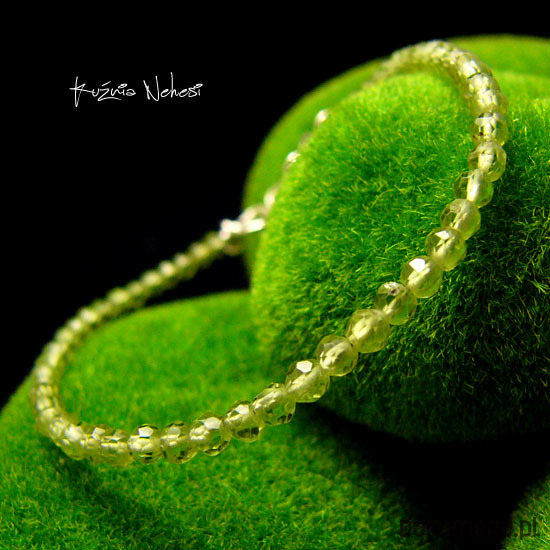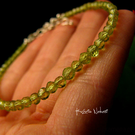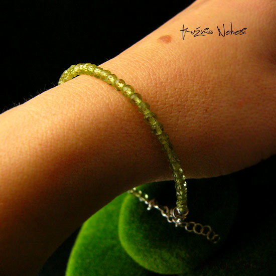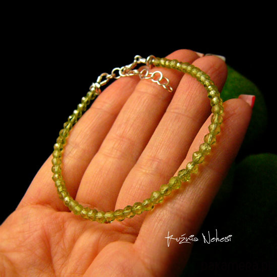 Delikatna bransoleta wykonana ręcznie ze srebra próby 925 oraz przepięknych o idealnym szlifie i klasie AAA, mikrofasetowanych naturalnych zielono jabłuszkowych Oliwinów. Bransoleta jest z regulacją, więc pasuje na każdy nadgarstek, mogę ją dopasować specjalnie dla Ciebie. Polecam Nehesi