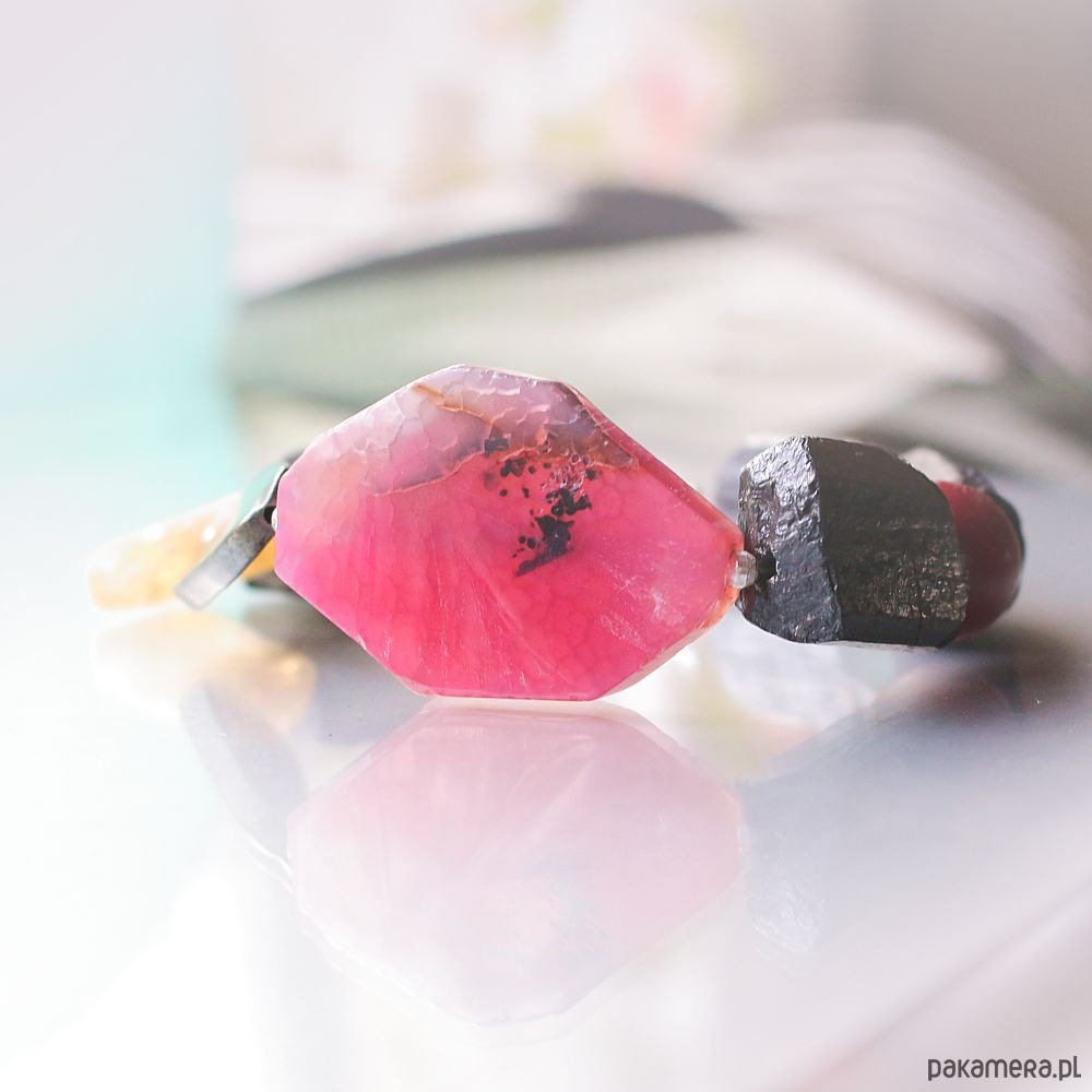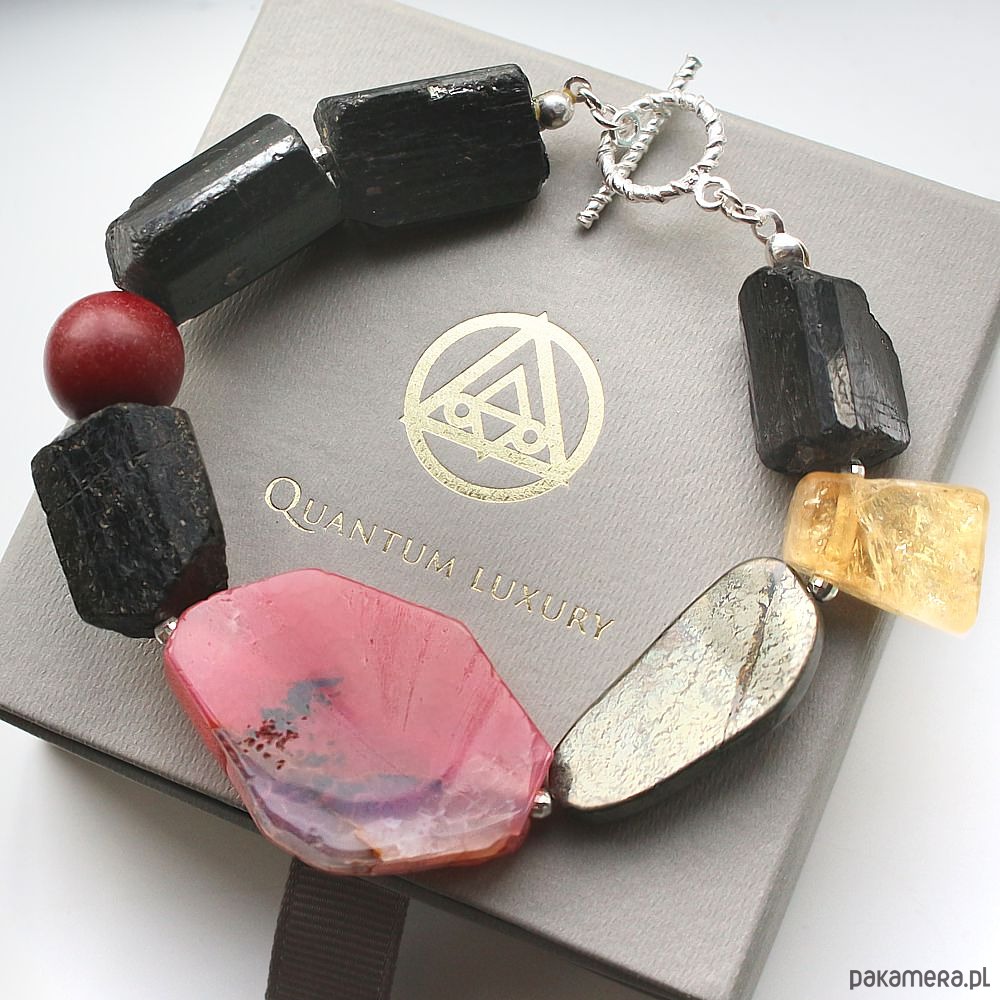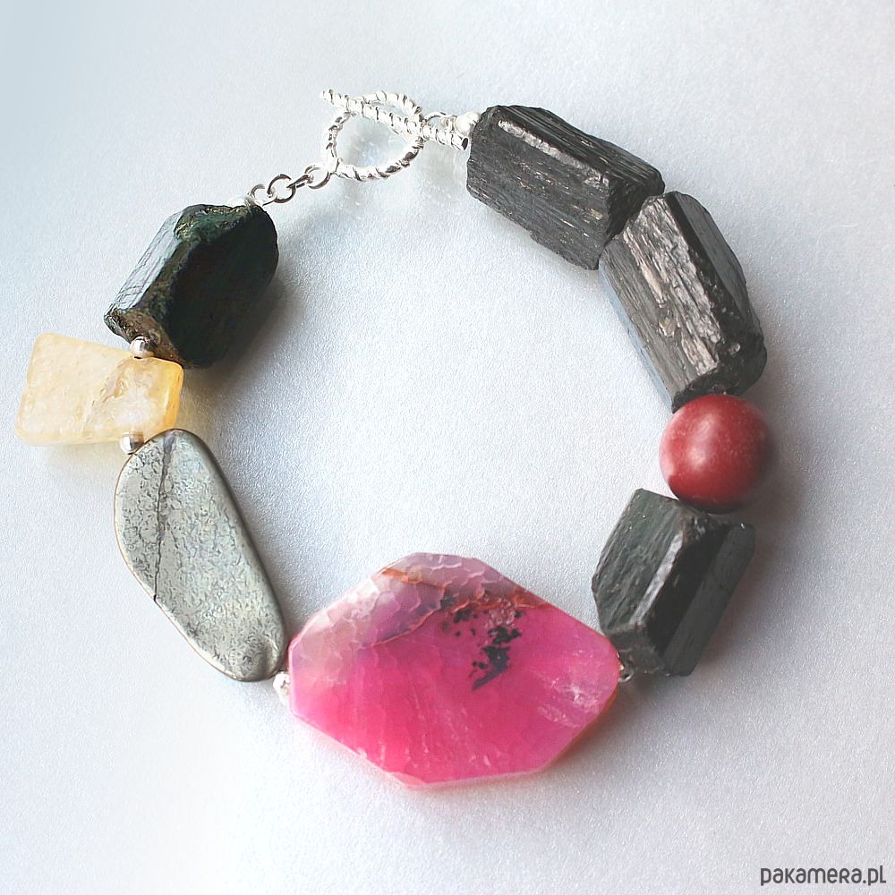 Unikatowa, elegancka, masywna bransoleta energetyczna wykonana ręcznie, z naturalnym surowym turmalinem, cytrynem, pięknym plastrem różowego agatu, pirytem i cynobrem (cinnabar). Efektowna, asymetryczna i unikatowa, z dużym zapięciem toggle ze srebra próby 925.