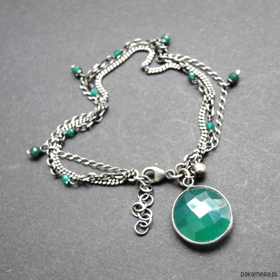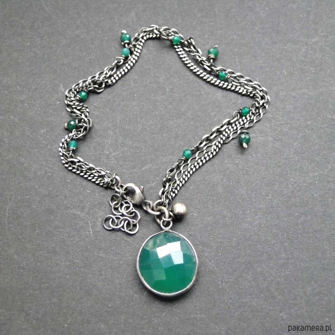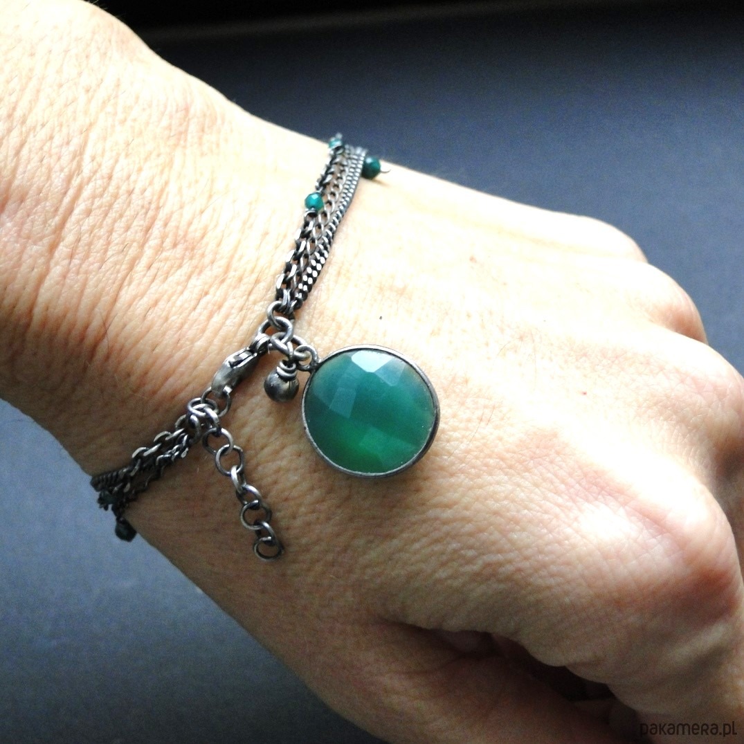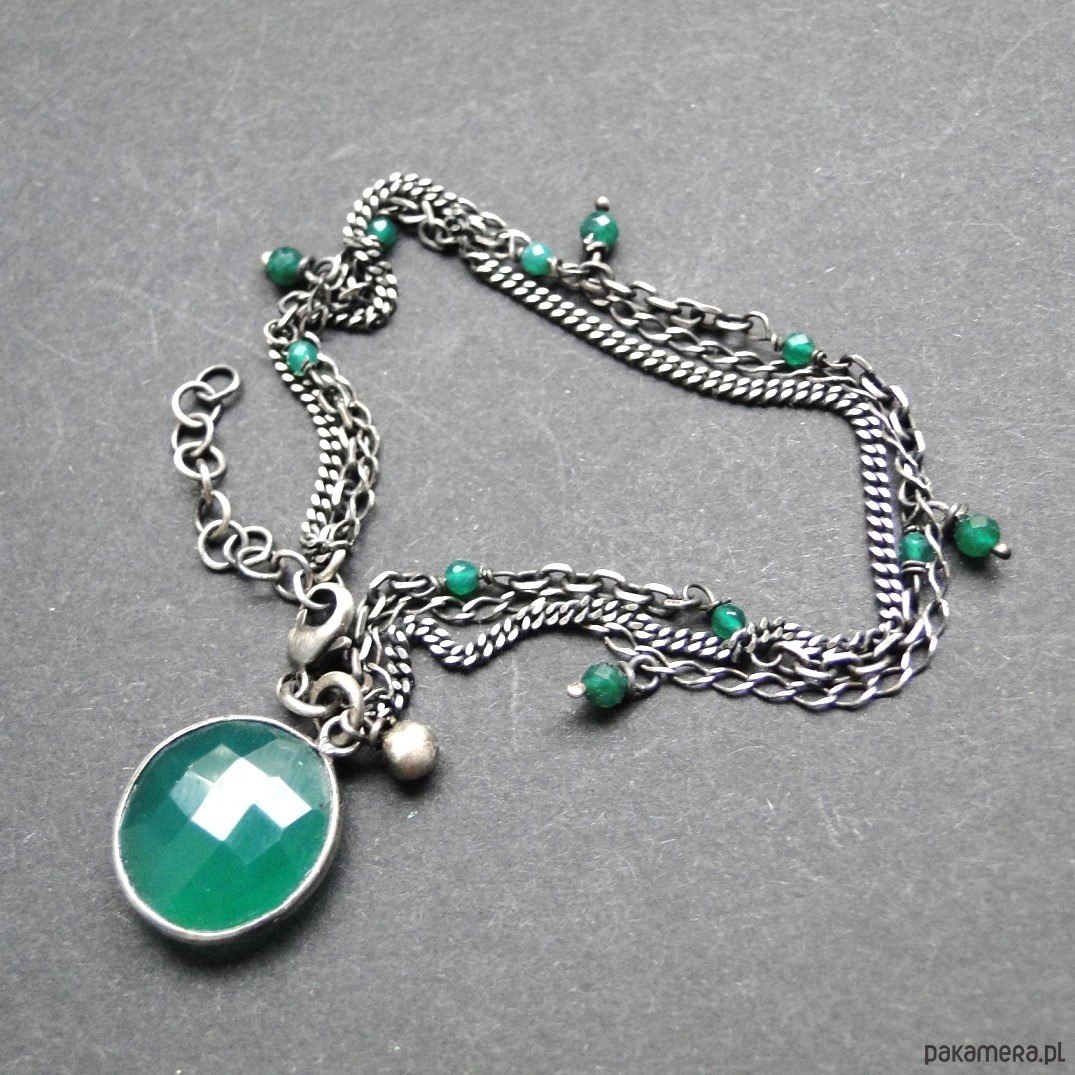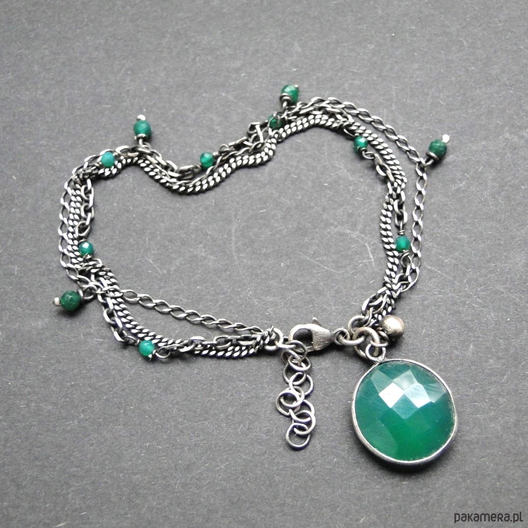 Delikatna bransoleta w szmaragdowym kolorze. Srebro 925,oksydowane i szorowane. Naturalne szmaragdy 3 mm, zielone onyksy kulki oraz zielony onyks w oprawie witrażowej (sama ramka). Bransoleta pasuje na ręke 16-17 cm. Nie moczyć w wodzie.