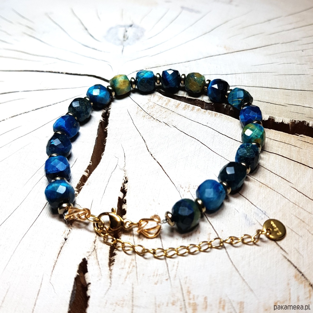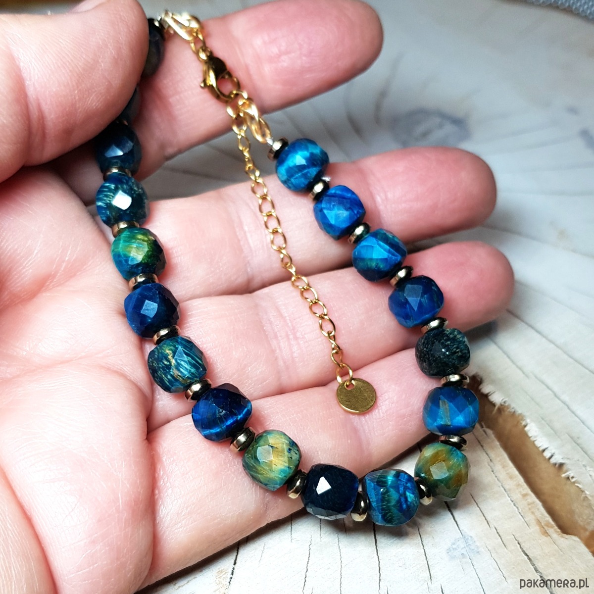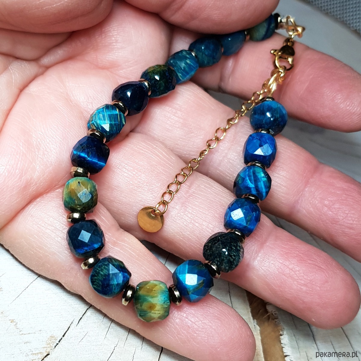 bransoletka wykonana ręcznie z naturalnych fasetowanych kwadratów 8mm tygrysiego oka barwionego na piękny niebieski kolor i przekładek złocistego hematytu. Użyte kostki tygrysiego oka są bardzo wysokiej jakości, pięknie wypolerowane, o dużym połysku . Przedłużka i zapięcie wykonane w stali chirurgicznej pozłacanej 24k złotem. Długość bransoletki wynosi ok. 20 cm plus przedłużka 4,5cm.