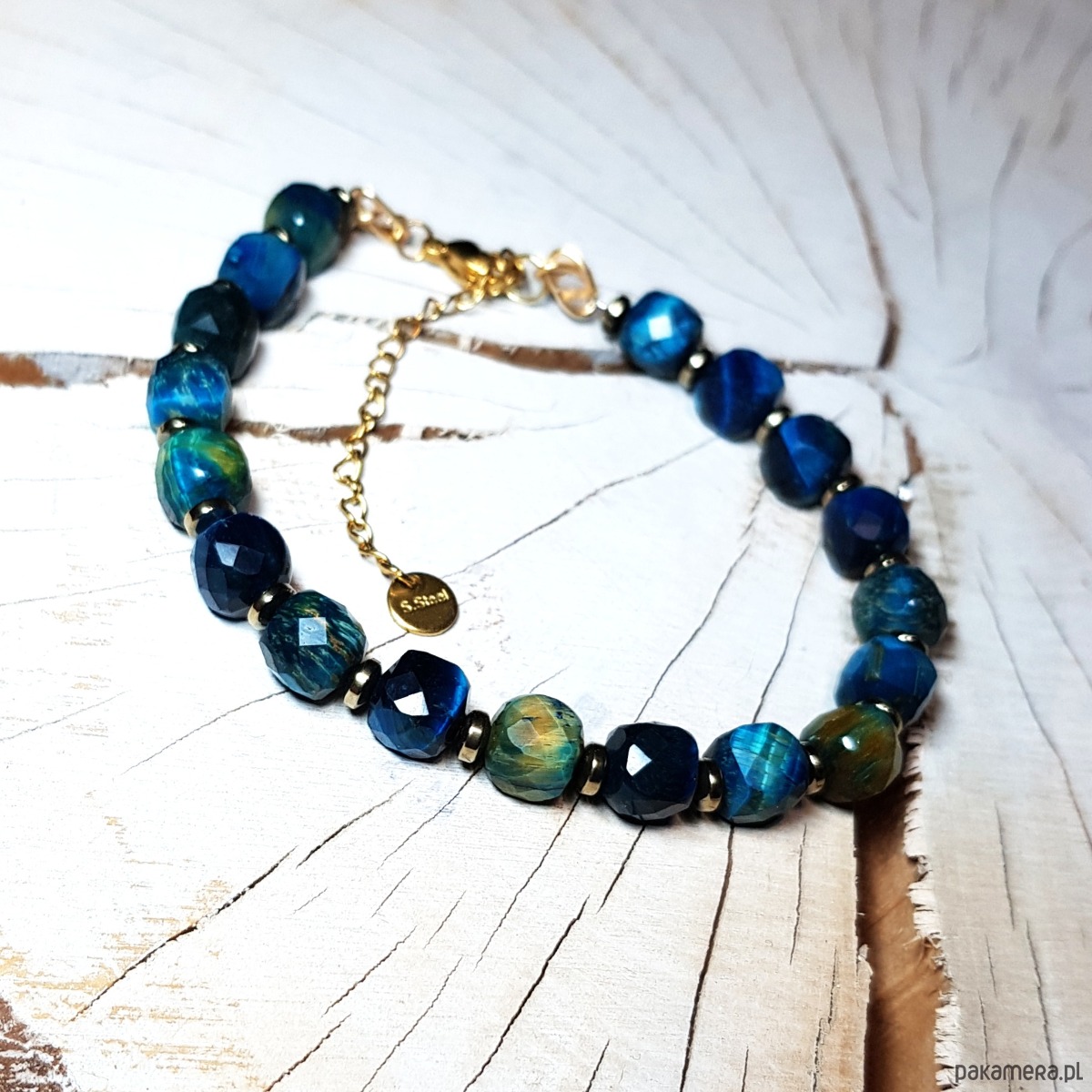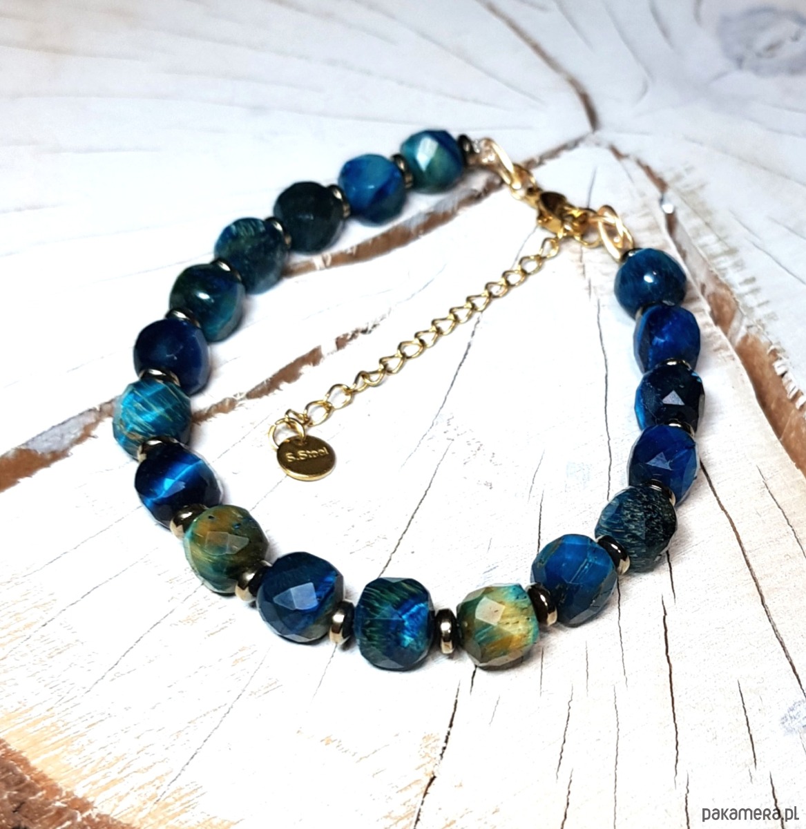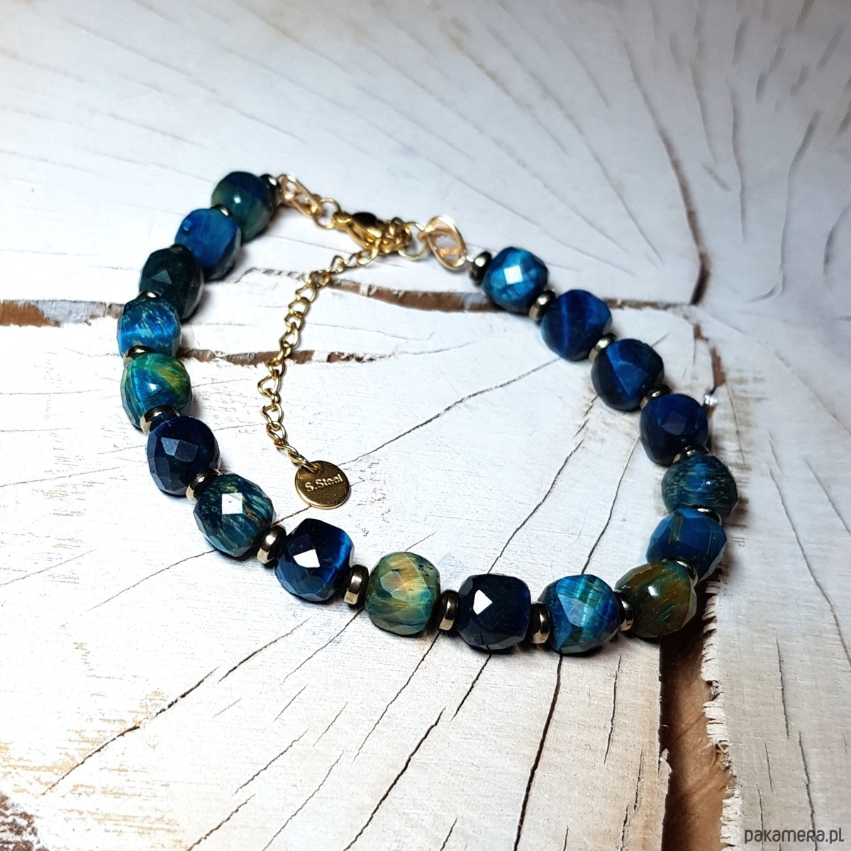 bransoletka wykonana ręcznie z naturalnych fasetowanych kwadratów 8mm tygrysiego oka barwionego na piękny niebieski kolor i przekładek złocistego hematytu. Użyte kostki tygrysiego oka są bardzo wysokiej jakości, pięknie wypolerowane, o dużym połysku . Przedłużka i zapięcie wykonane w stali chirurgicznej pozłacanej 24k złotem. Długość bransoletki wynosi ok. 20 cm plus przedłużka 4,5cm.