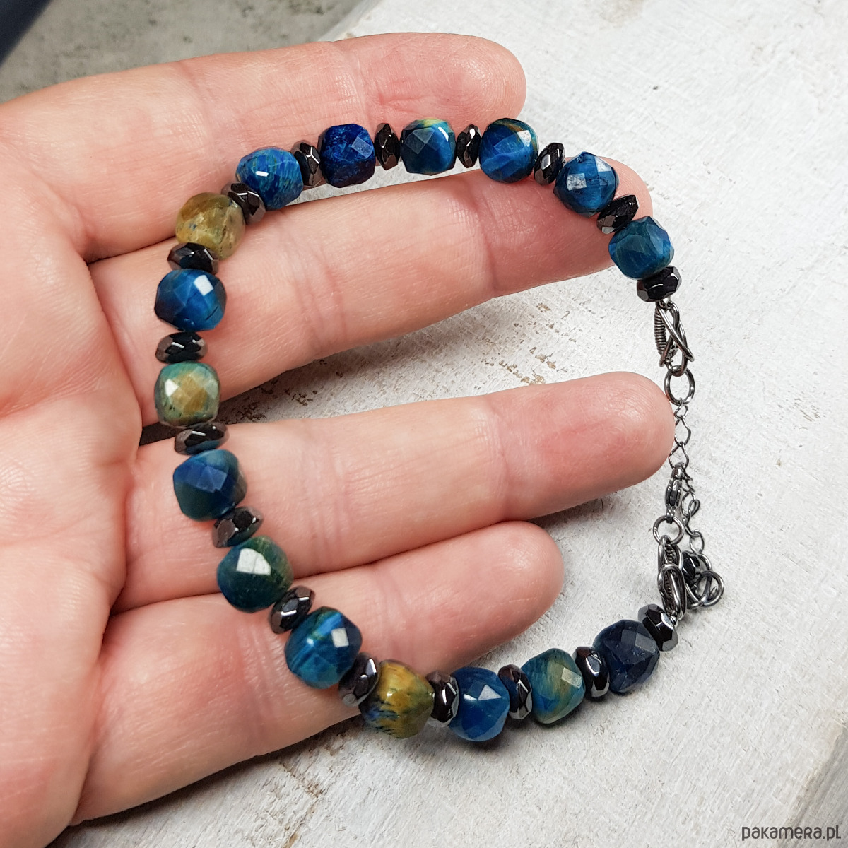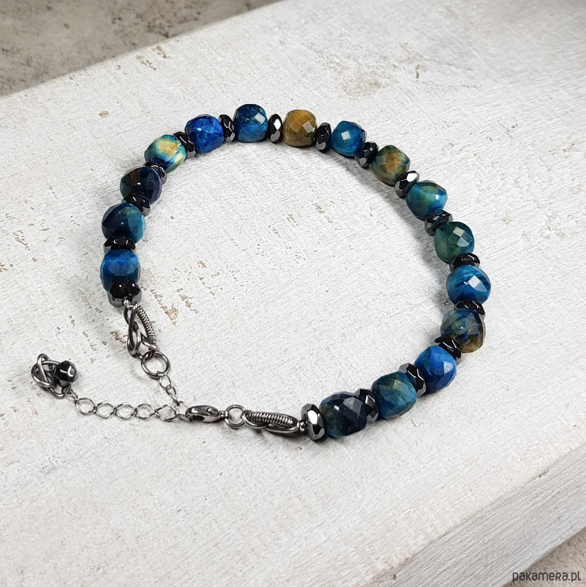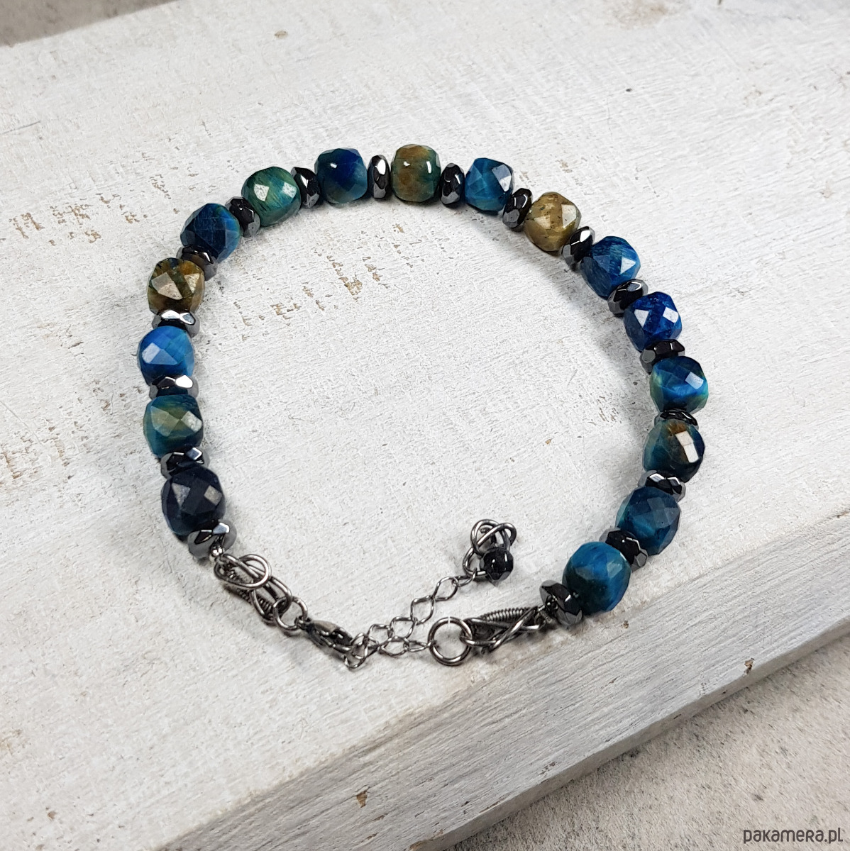 bransoletka wykonana ręcznie z naturalnych fasetowanych kwadratów8mm tygrysiego oka barwionego na piękny niebieski kolor i przekładek hematytu. Użyte kostki tygrysiego oka są bardzo wysokiej jakości, pięknie wypolerowane, o dużym połysku czego nie udało mi się uchwycić na zdjęciach. Wykończenia i zapięcie wykonane w srebrze 925, oksydowanym i wypolerowanym. Długość bransoletki wynosi ok. 20 cm plus przedłużka 2,5cm.