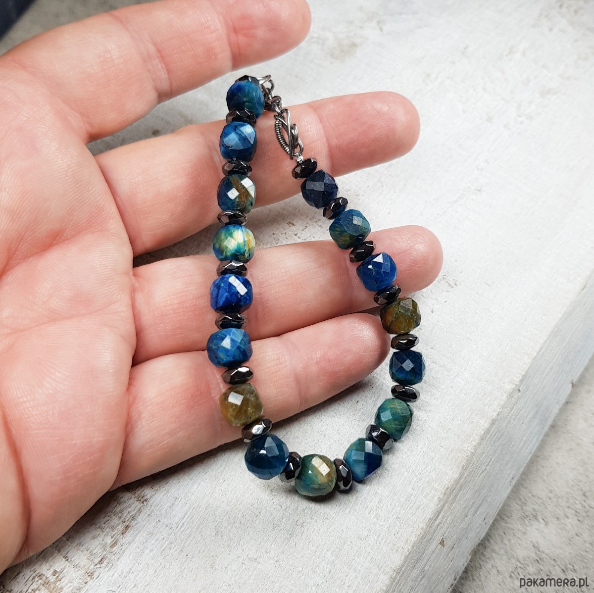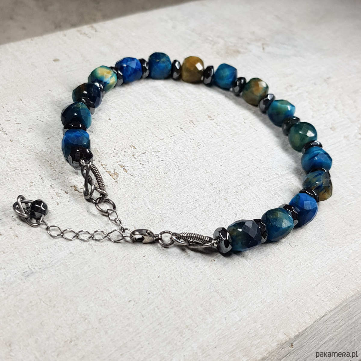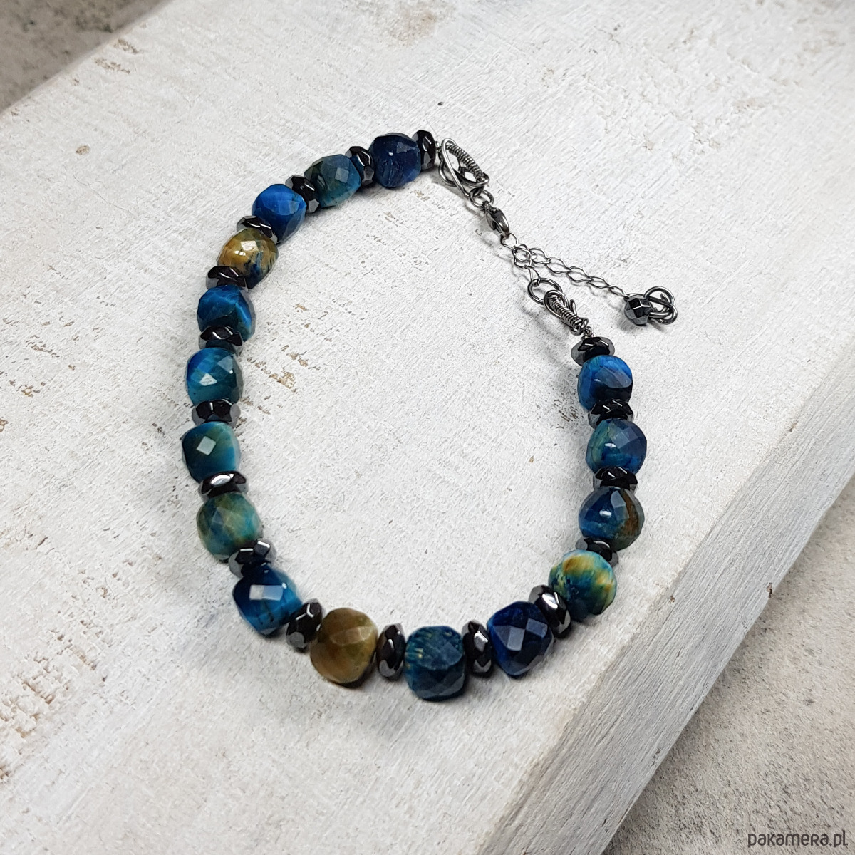 bransoletka wykonana ręcznie z naturalnych fasetowanych kwadratów8mm tygrysiego oka barwionego na piękny niebieski kolor i przekładek hematytu. Użyte kostki tygrysiego oka są bardzo wysokiej jakości, pięknie wypolerowane, o dużym połysku czego nie udało mi się uchwycić na zdjęciach. Wykończenia i zapięcie wykonane w srebrze 925, oksydowanym i wypolerowanym. Długość bransoletki wynosi ok. 20 cm plus przedłużka 2,5cm.