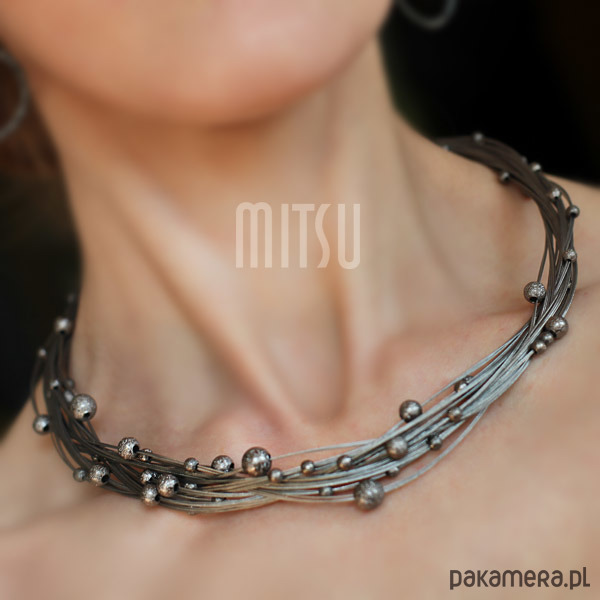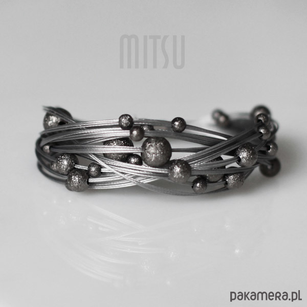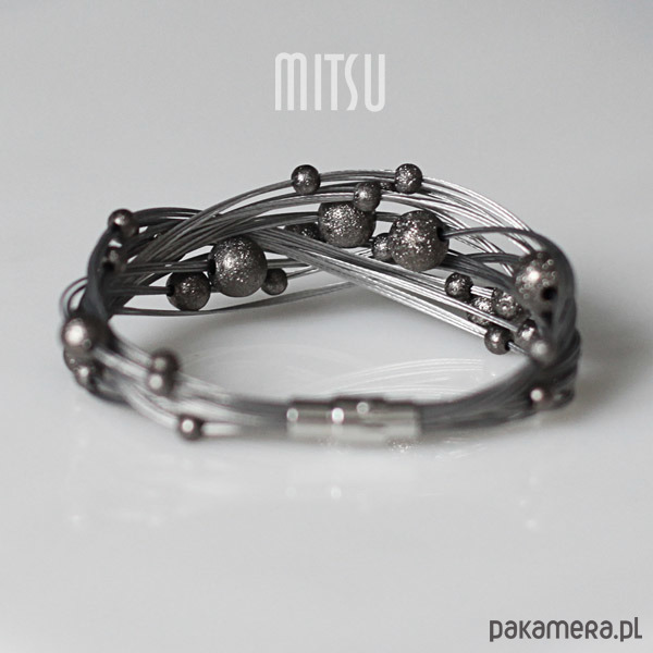 Bransoleta wykonana jest ze stalowych linek pokrytych nylonem oraz metalowych teksturowanych kul.