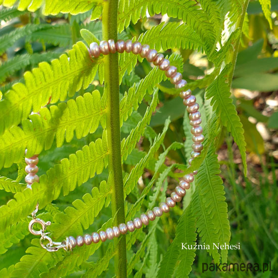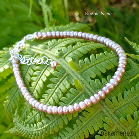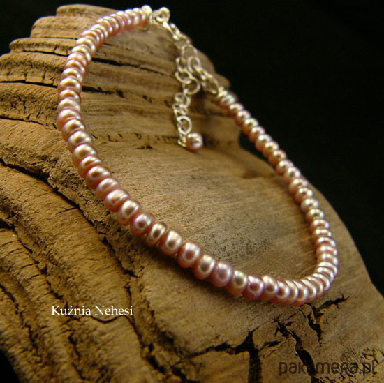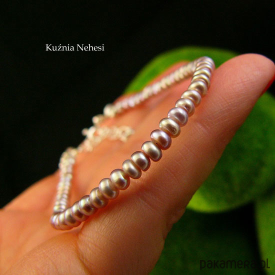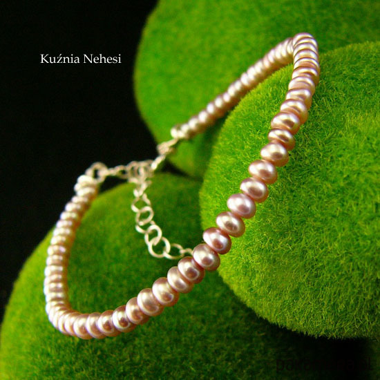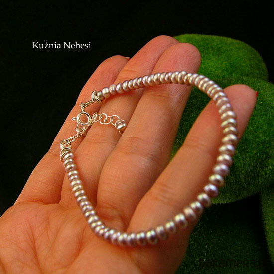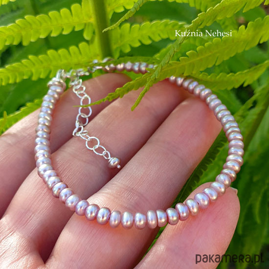 Bransoleta z wyjątkowo pięknych naturalnych Pereł we fioletowym kolorze i intensywnym overtonem. Perły oponki 2,5x3,5 milimetra. Oprawa własnoręcznie w srebro próby 925 oraz naplot na mocną wielosplotową stalową linkę jubilerską. Bransoleta jest z łańcuszkiem regulacyjnym, wiec pasuje na każdy nadgarstek. Perły są klasy AA z wyjątkowym połyskiem. Serdecznie polecam.