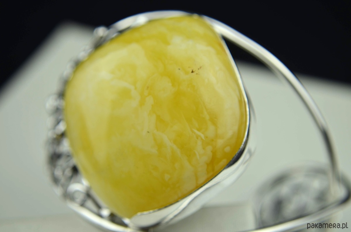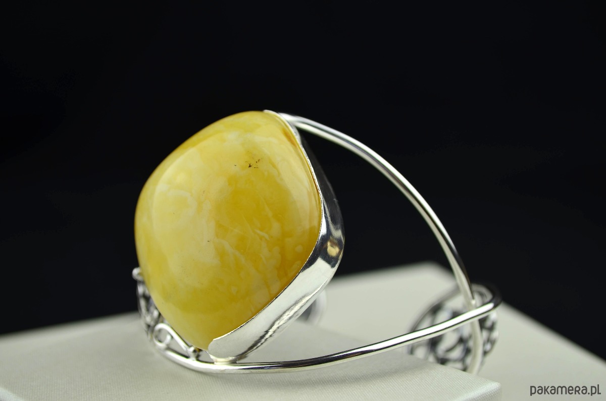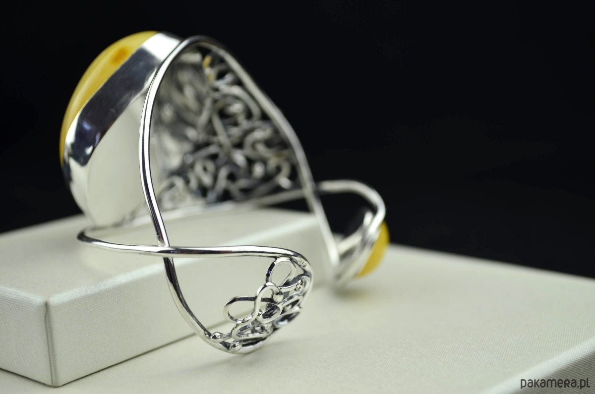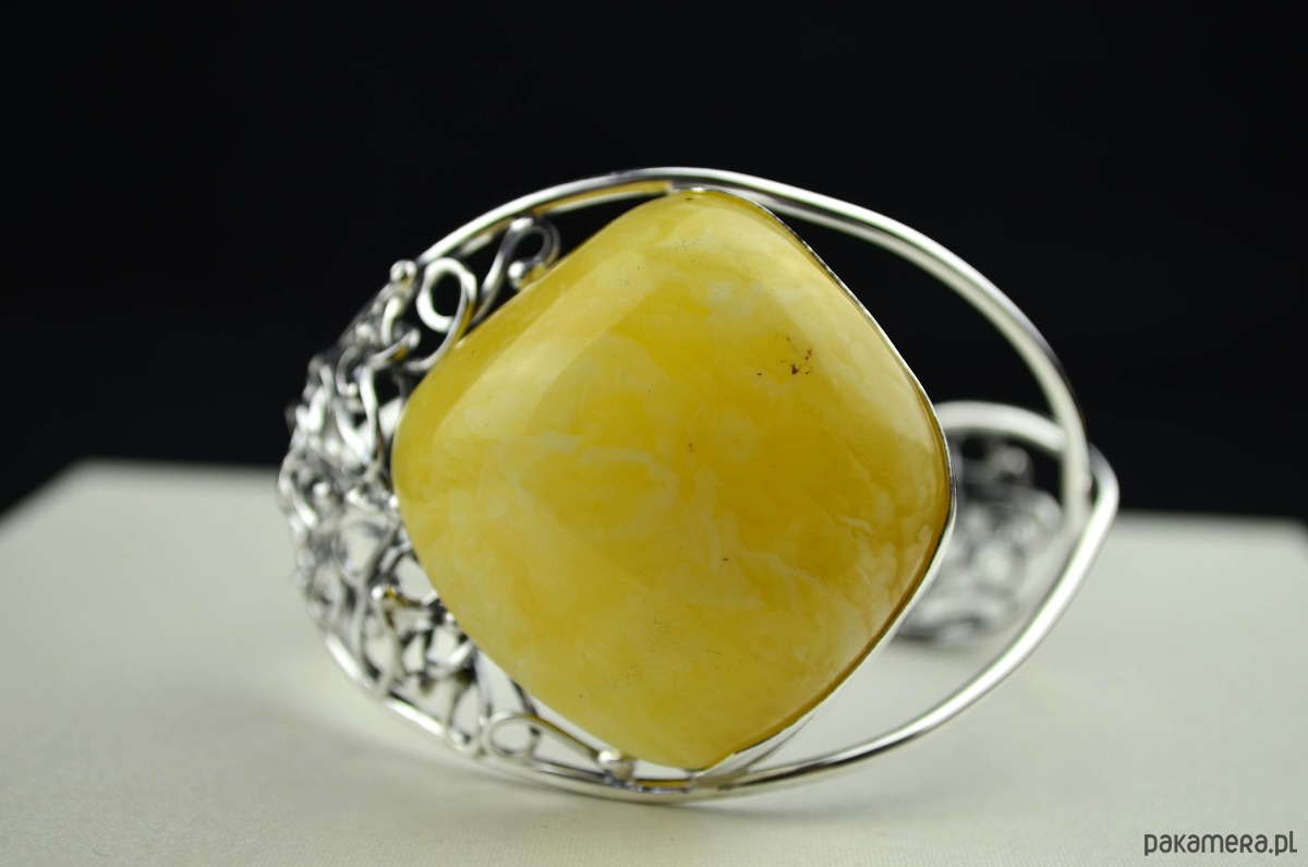 Sztywna masywna bransoleta, w której centrum znajduje się ogromny mleczny bursztyn to moja propozycja dla miłośniczek wyrazistej biżuterii w stylu vintage. Srebrne ramy bransoletki częściowo wypełniłam ozdobnymi zawijasami, a na końcu dodałam jeden okrągły bursztyn idealnie dobrany kolorystycznie do głównego kamienia. Mimo swoich rozmiarów bransoleta dzięki ażurom posiada pewną "lekkość". Waga całości nie przekracza 50 g.