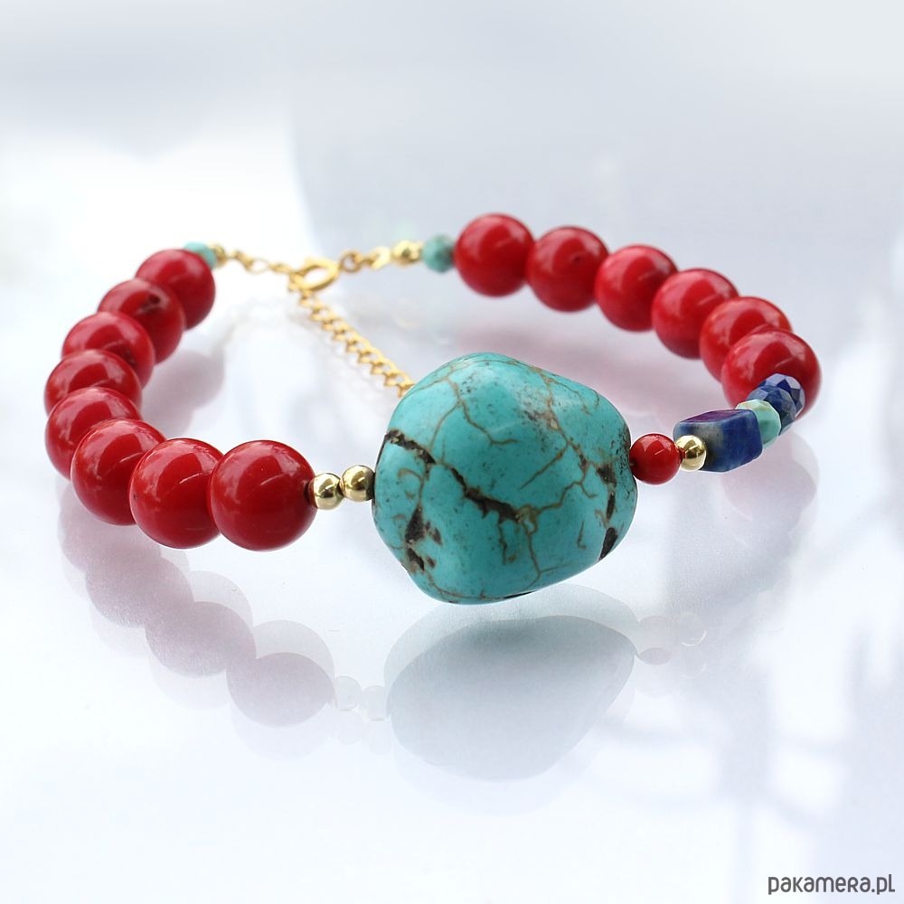 Bransoleta z turkusem, koralem czerwonym, lapis lazuli