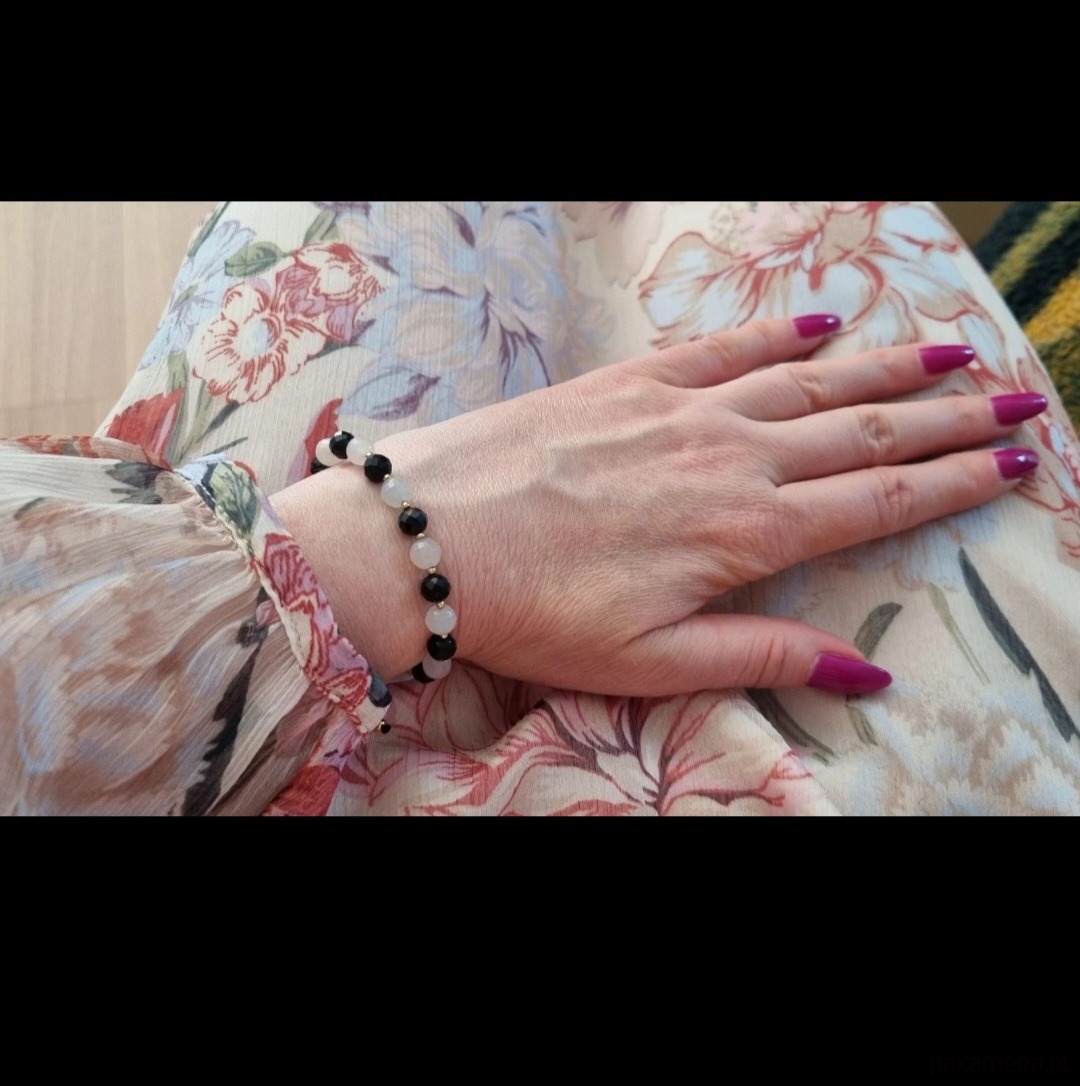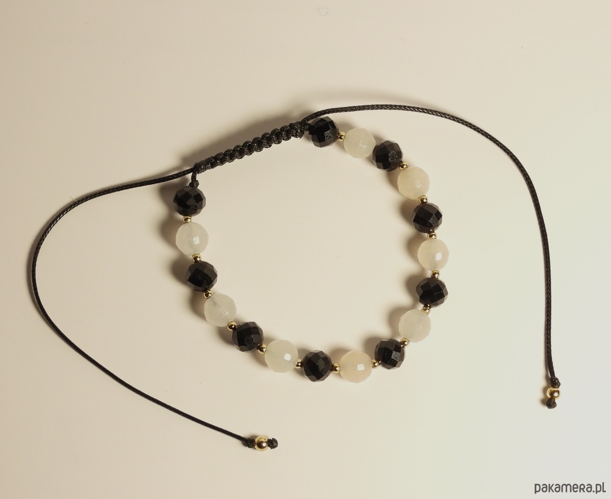 Bransoletka pleciona – czarne turmaliny fasetkowane i jasne awenturyny fasetkowane 6mm na sznureczku w kolorze czarnym, pozłacane koraliki ze stali szlachetnej (nieuczulającej).