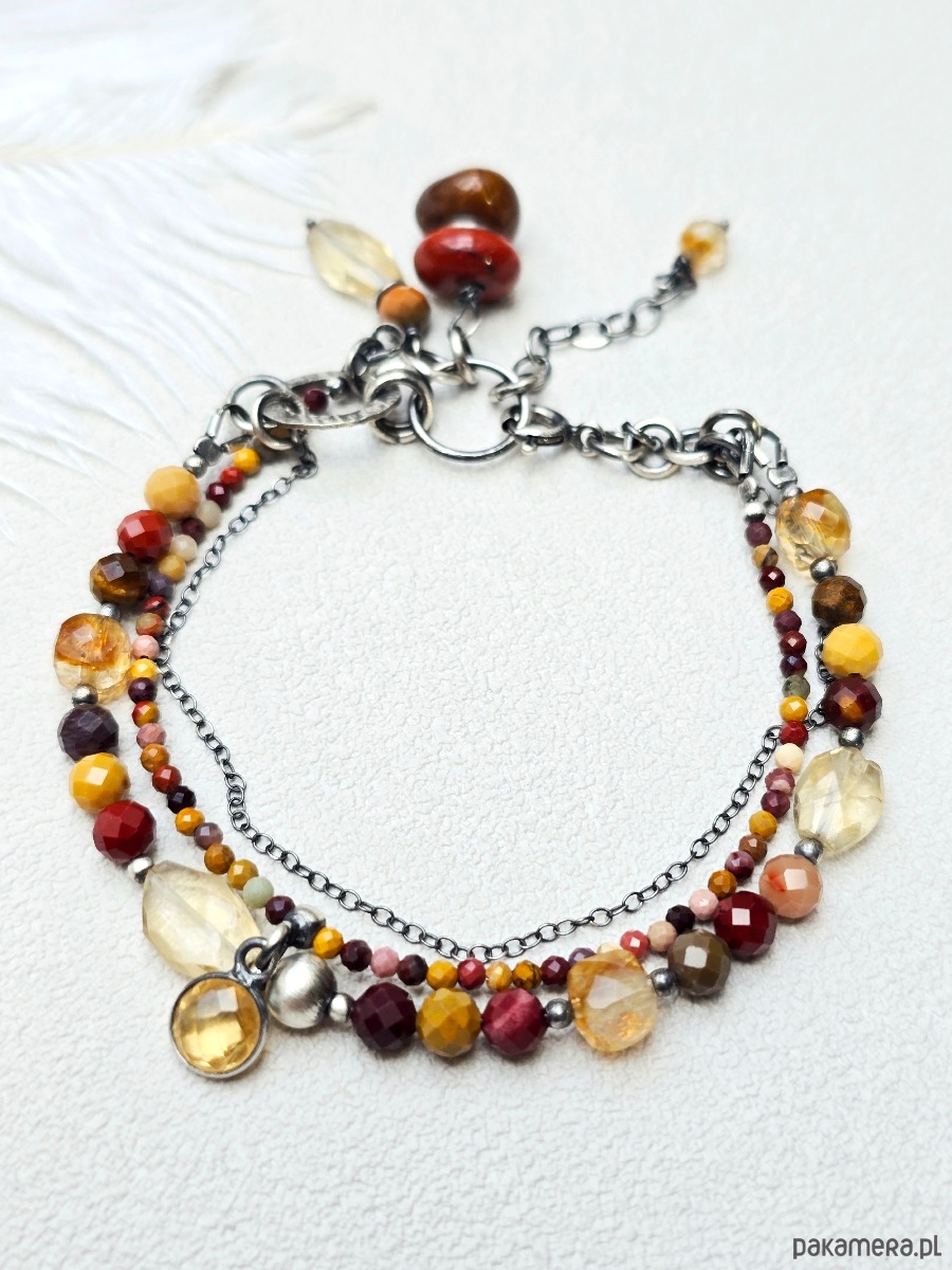 Potrójna bransoletka wykonana z kolorowych mokaitów i cytrynów w przedziale wielkości od 2,5 do 8mm