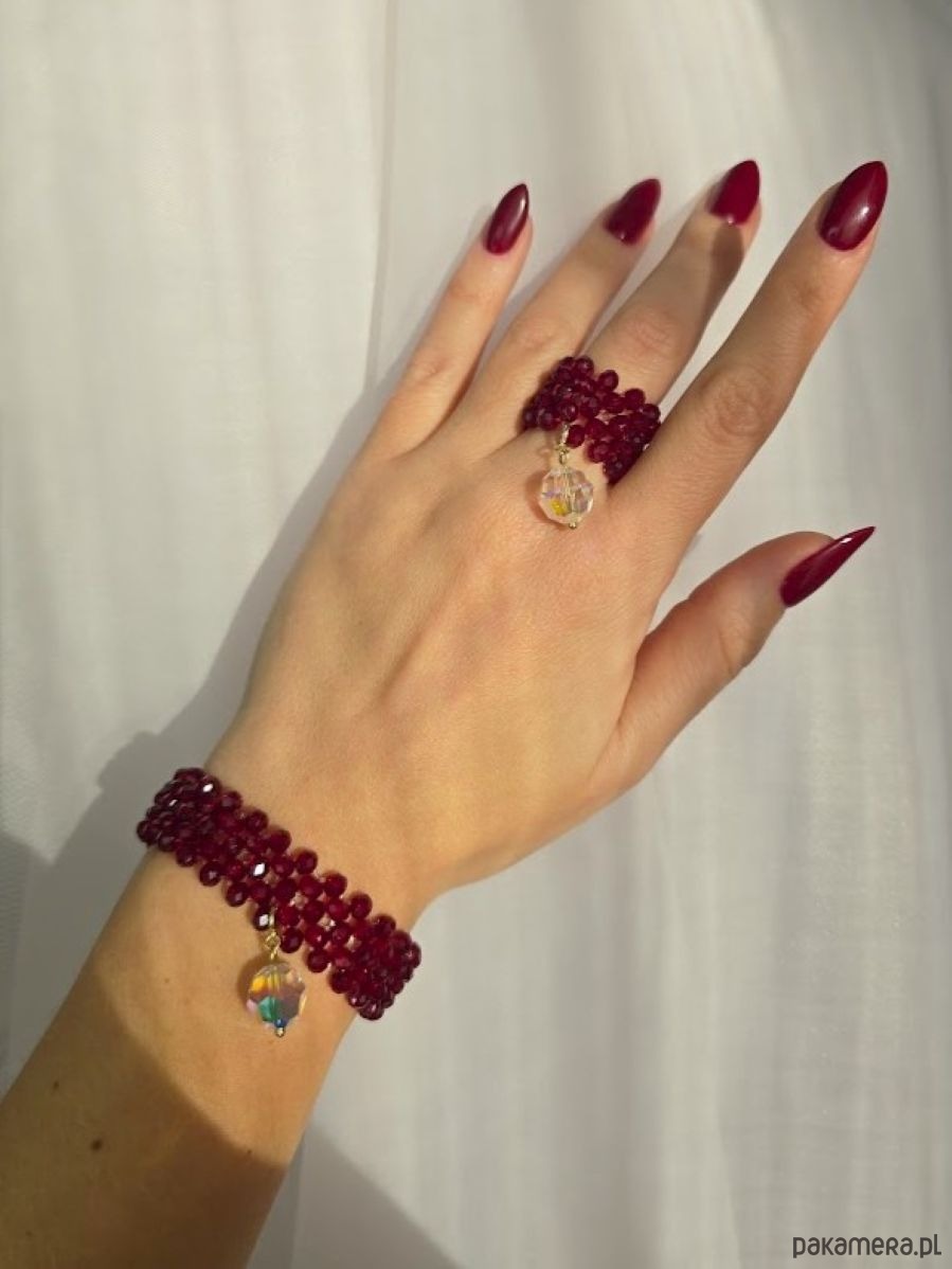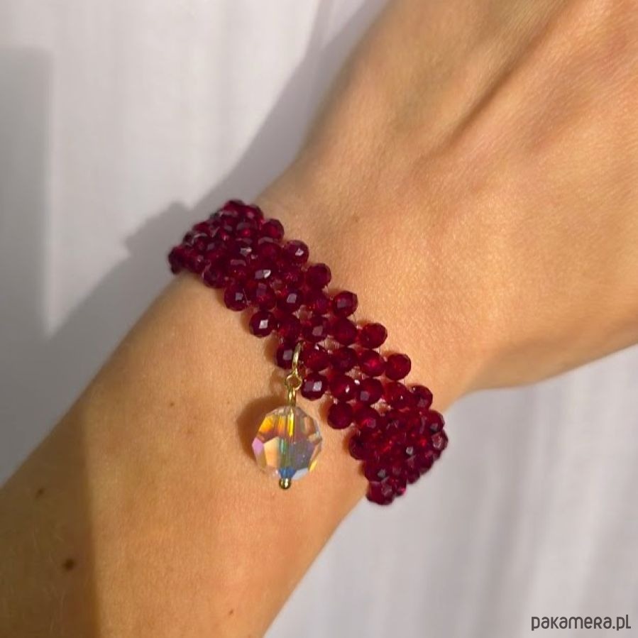 Bransoletka 5-rzędowa ze szkła kryształowego w kolorze burgundowym, z ozdobną zawieszką w postaci kulką kryształu Swarovski. Bransoletka wykonana jest w połączeniu z elementami stali szlachetnej oraz srebra 925 pozłacanego 24k złotem. Zawieszka dopinana jest do bransoletki za pomocą federinga, dzięki czemu można nosić ją w wersji z zawieszką lub bez. Ręcznie pleciona bransoletka nawinięta jest na elastyczną, trwałą gumkę silikonową, dzięki czemu biżuteria dopasowuje się do nadgarstka i pięknie przylega. Kryształki błyszczą pod wpływem światła, co sprawia, że bransoletka prezentuje się okazale i luksusowo.