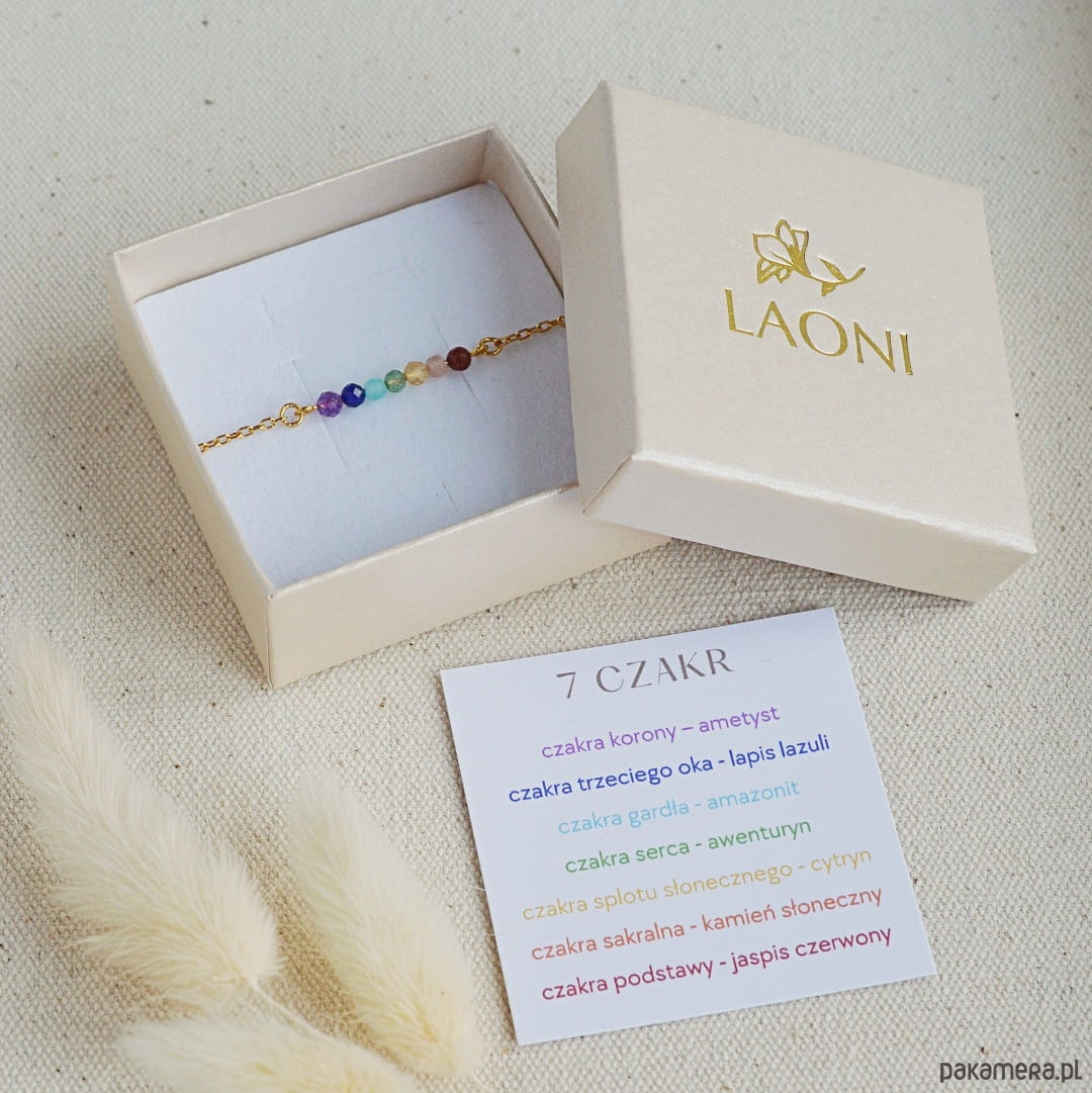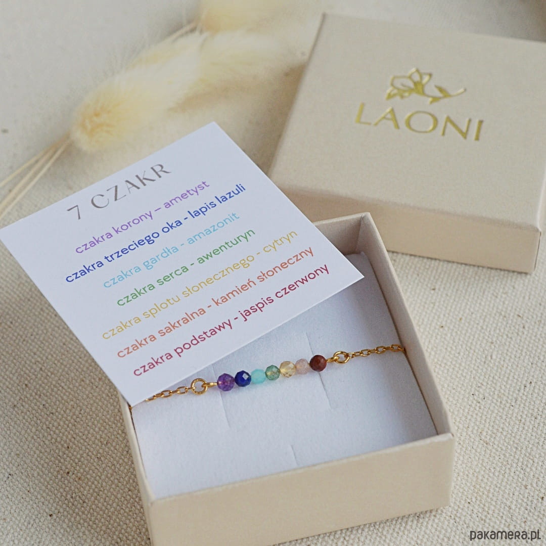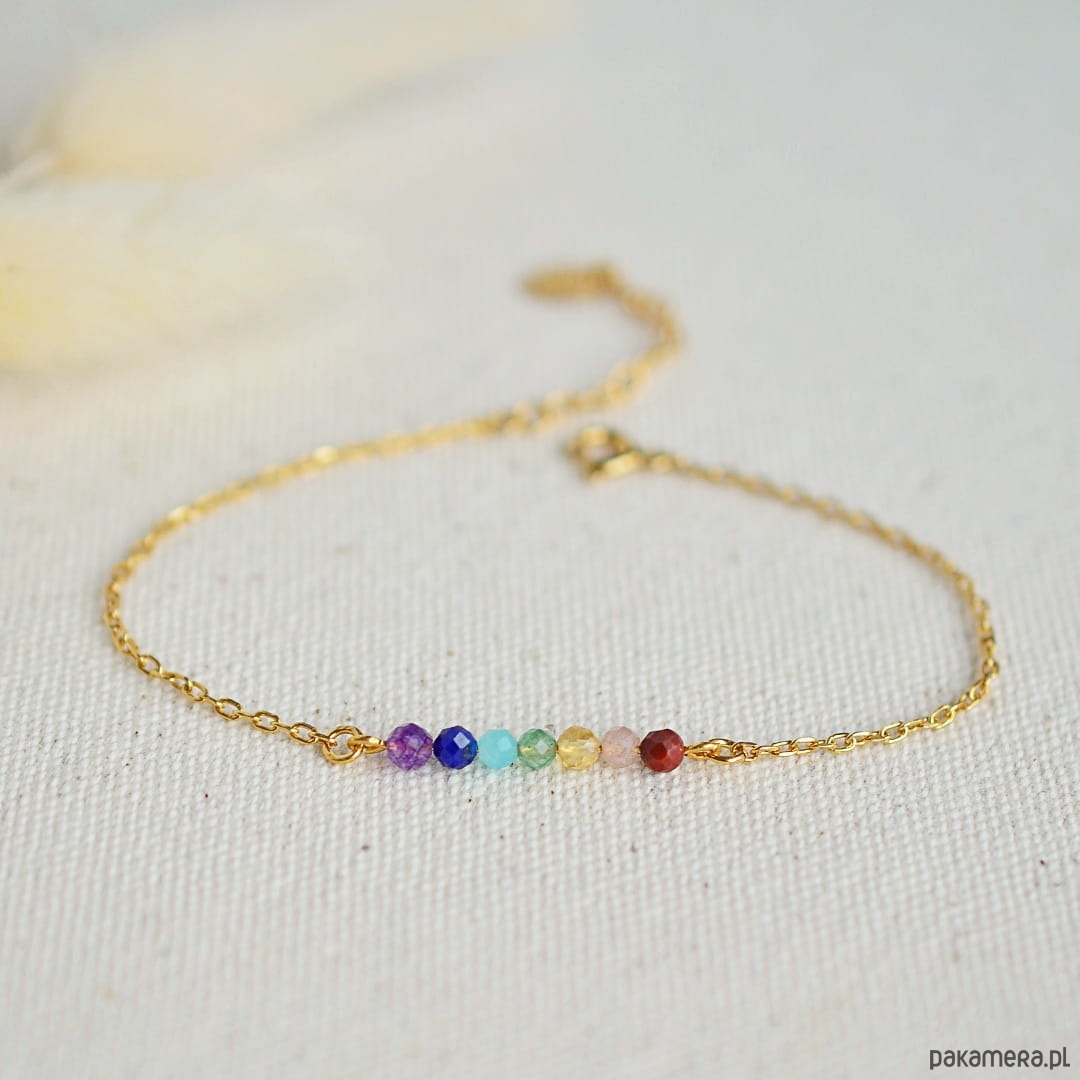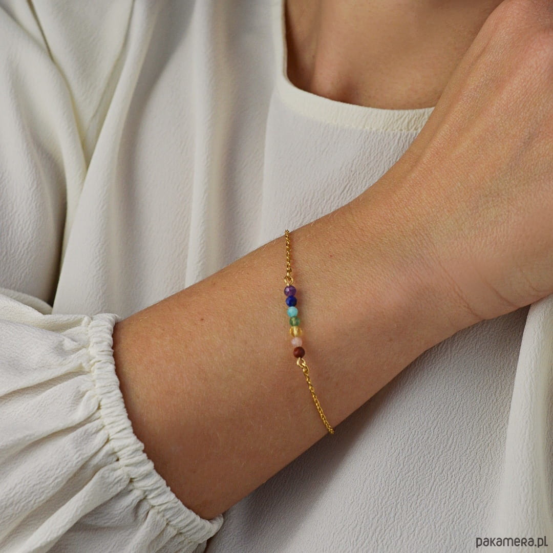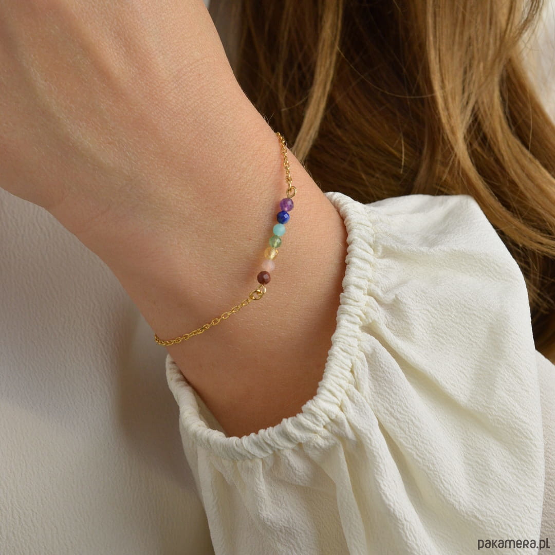 Bransoletka wykonana została z kamieni, których kolory odpowiadają poszczególnym czakrom. Kombinacja kamieni nie jest przypadkowa – ułożone w odpowiedniej kolejności korespondują z wibracjami czakr.