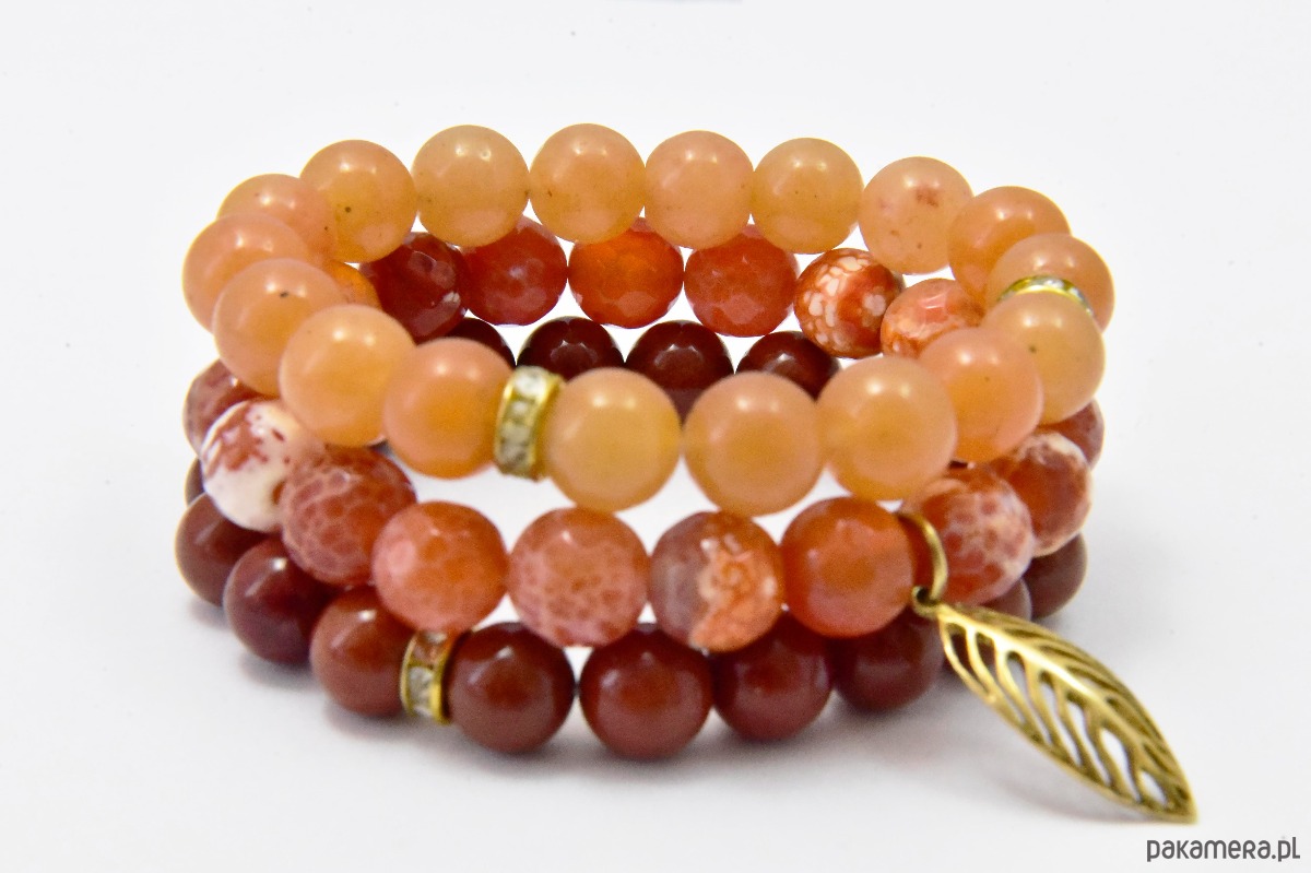 Jeśli lubisz szykowne dodatki to bransoletka ta z pewnością zwróci Twoją uwagę. Urocze bransoletki z jaspisu czerwonego oraz awenturynu ozdobione delikatnymi przekładkami z cyrkoniami a do tego wyjątkowe fasetowane kule agatu tworzą idealne trio. Ciepłe jesienne kolory kamieni sprawiają , że pięknie prezentują się na nadgarstku i oczywiście przyciągają uwagę otoczenia.