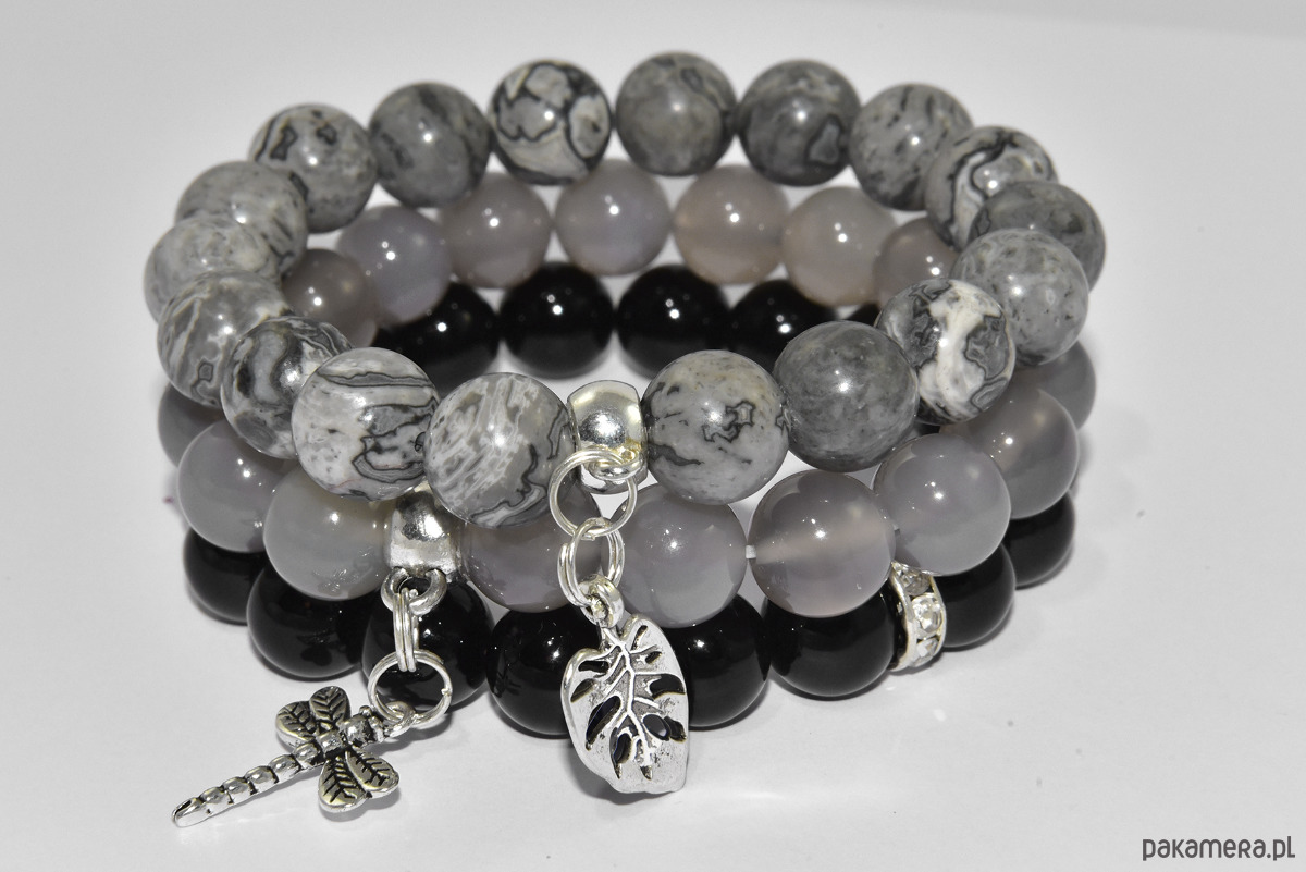 Intrygujący mariaż agatów, jaspisu i onyksu daje razem niezwykły efekt. W połączeniu z uroczymi przekładkami i zawieszkami nabiera wyjątkowego charakteru. Bransoletka pięknie prezentuje się nadgarstku.
