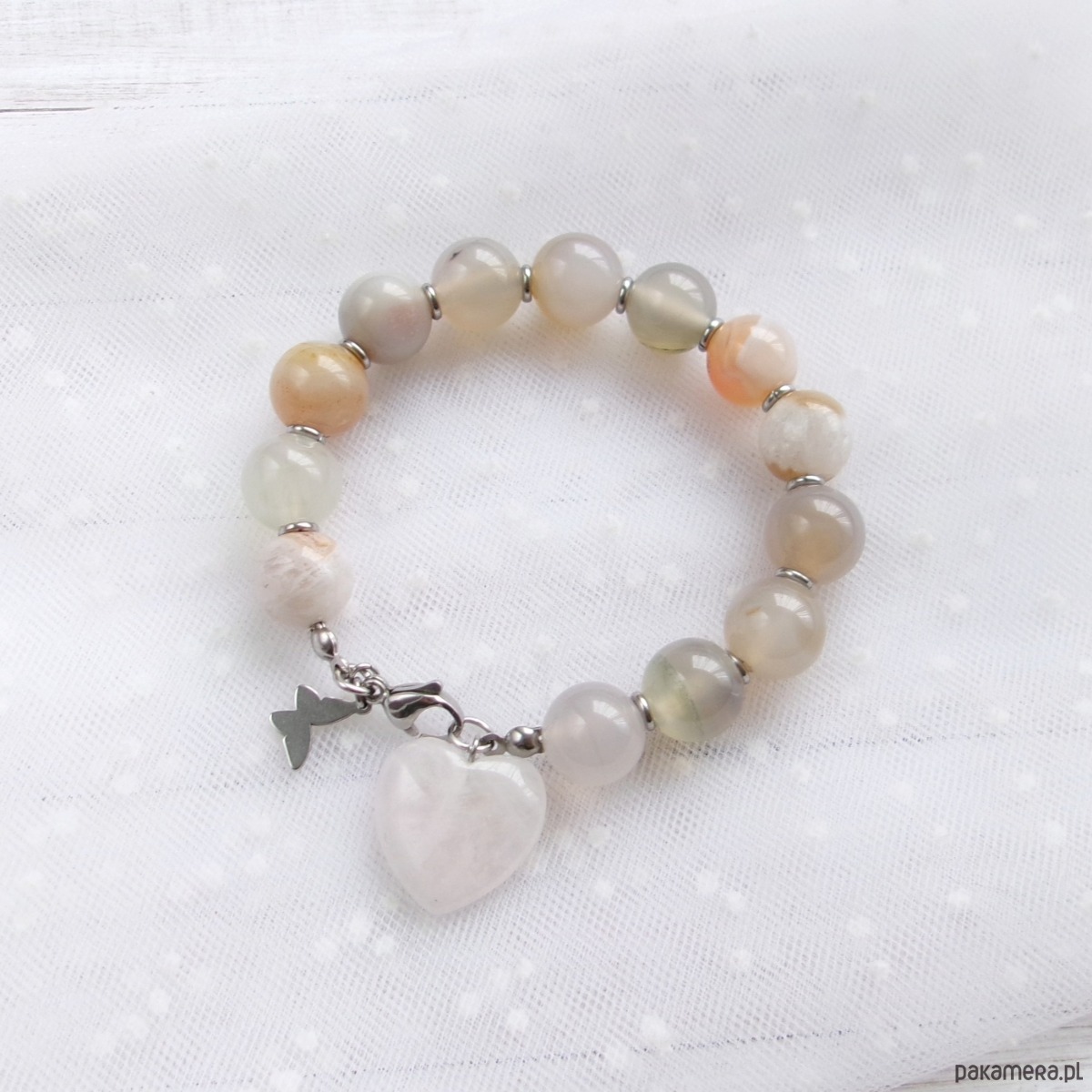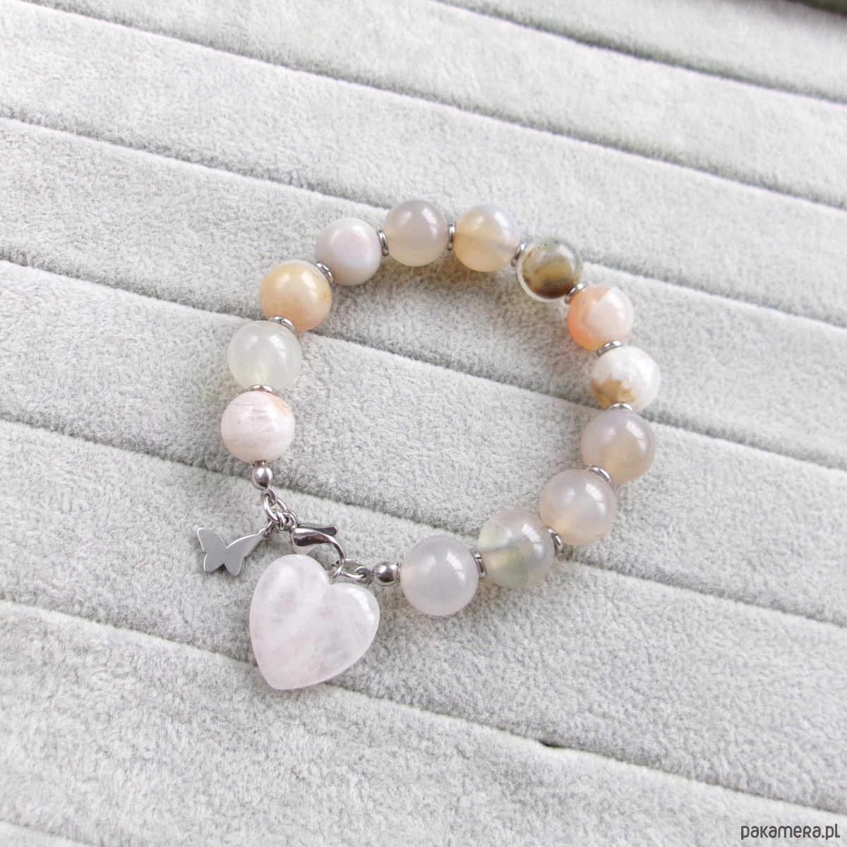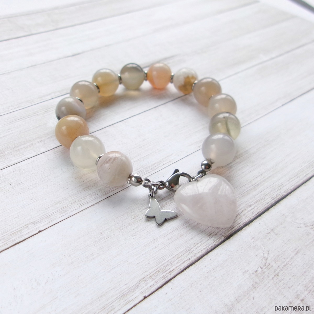 Elegancka bransoletka z kulek agatu szarego w rozmiarze 12mm, ozdobiona sercem z kwarcu i zawieszką w kształcie motylka. Wykonana na lince jubilerskiej.