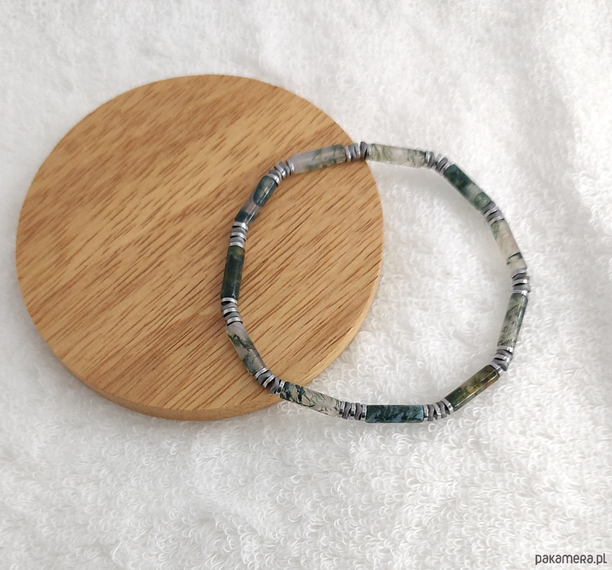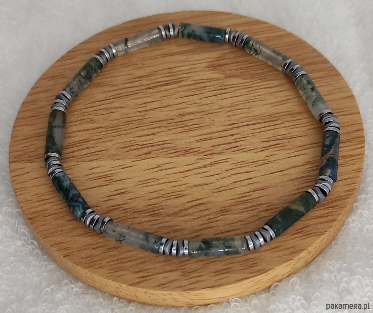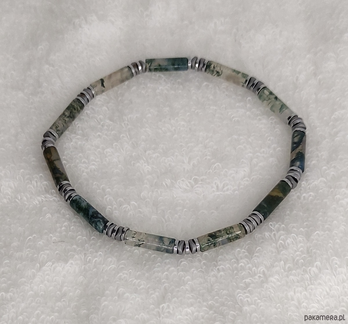 Bransoletka wykonana z walców agatu mszystego oraz krążków hematytu (błyszczący i matowy w odcieniach szarości). Subtelna, stonowana kolorystyka.