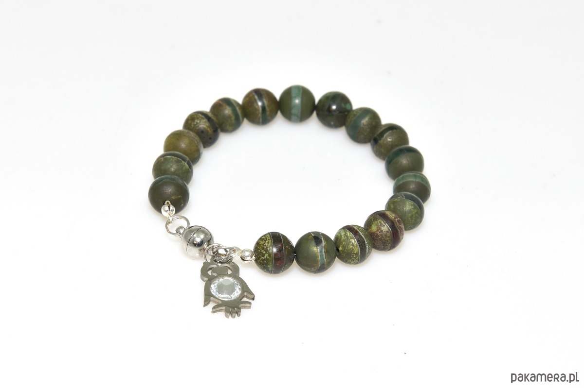 Ładna ,modna ,prosta bransoletka z wyjątkowych kul agatu tybetańskiego prezentuje się idealnie . Ciemnozielone kamienie z delikatnym wzorem pięknie wyglądają, stanowiąc idealny dodatek na każdą okazje.