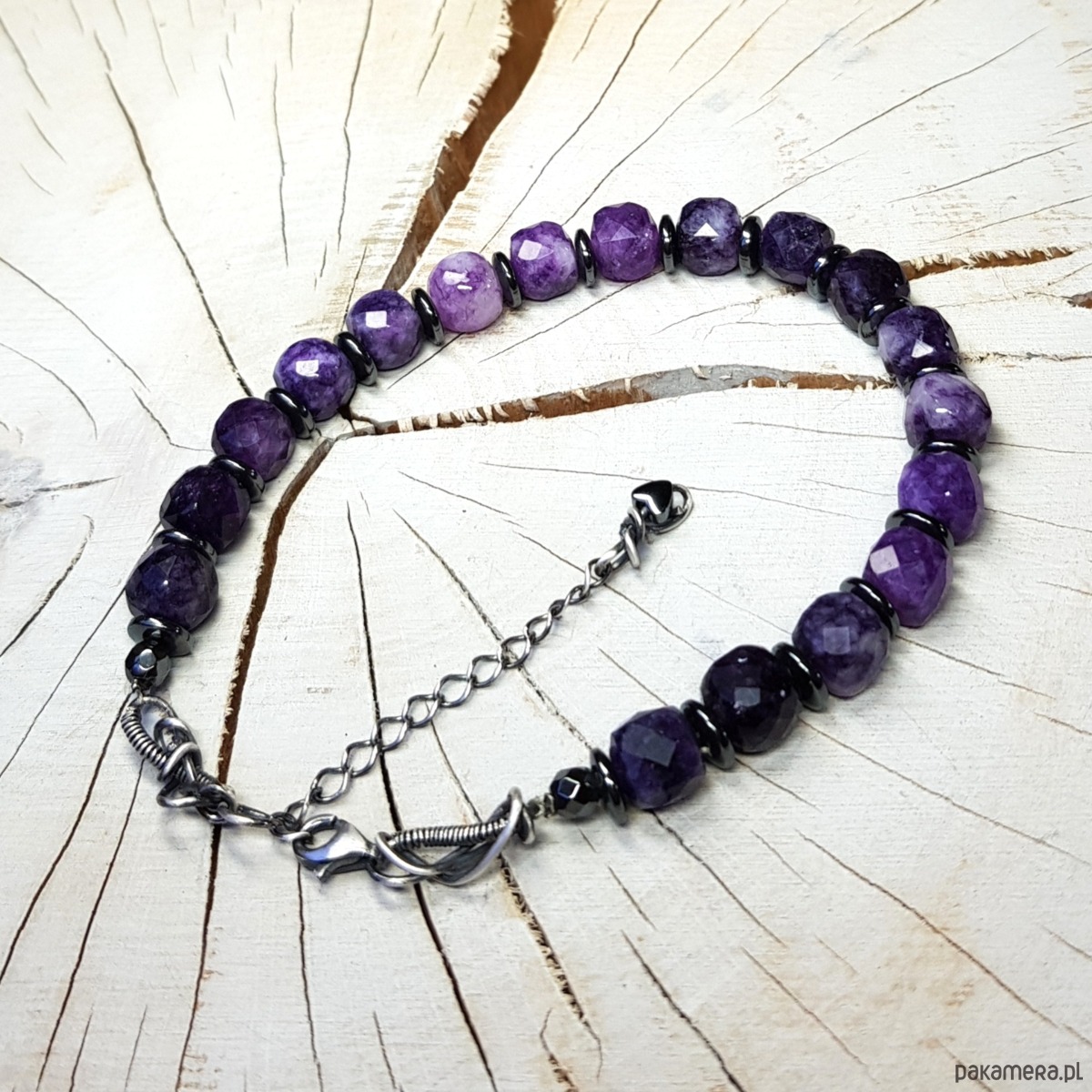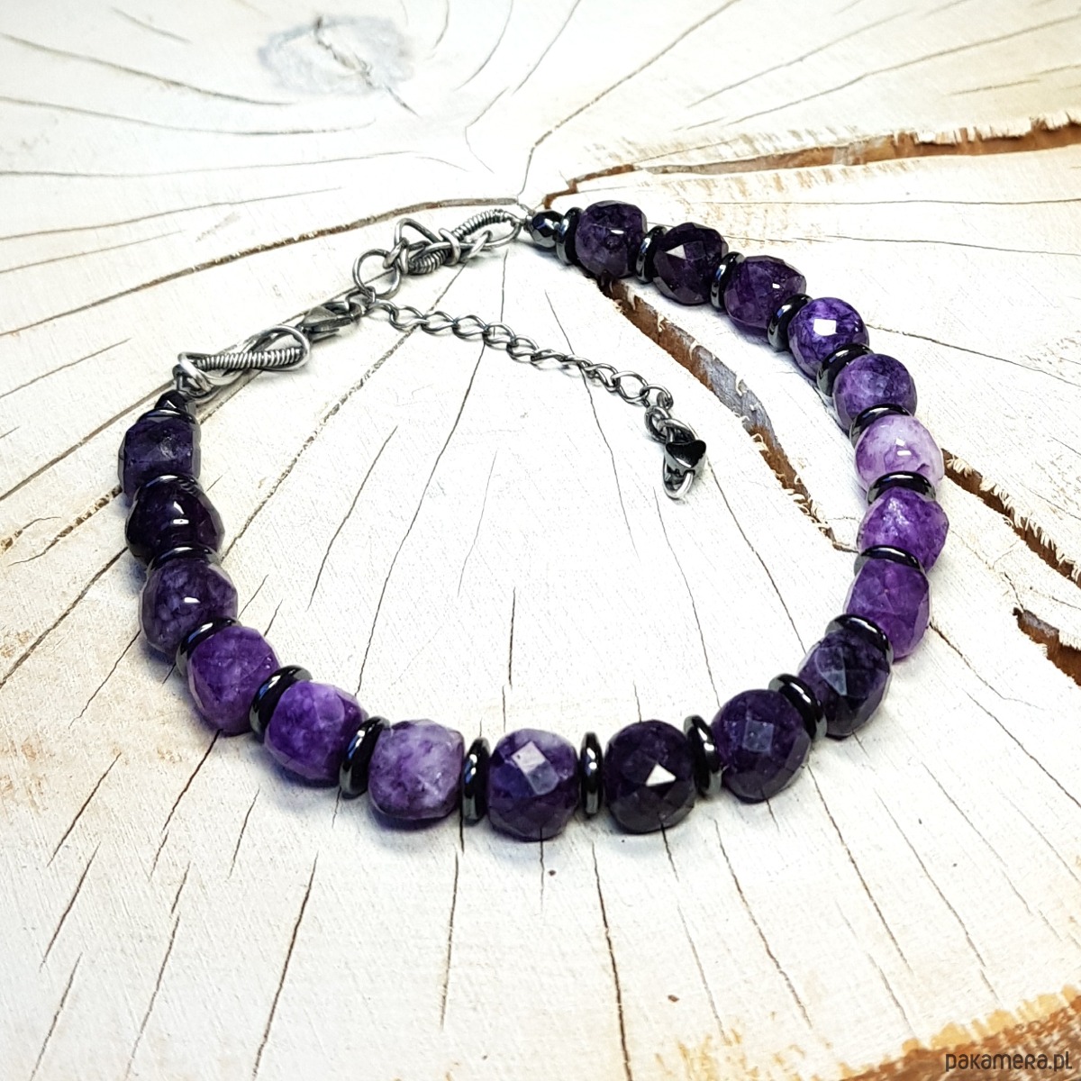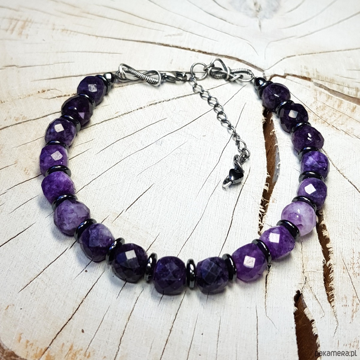 Bransoletka wykonana z naturalnych kwadratowych 7mm kamieni ametystu. Zapięcie i łańcuszek wykonane w srebrze, które zostało przyczernione oksydą i wypolerowane. Długość bransoletki wynosi ok. 20,5 cm, plus łańcuszek regulacyjny 3,5 cm. Na życzenie wykonam w innym rozmiarze