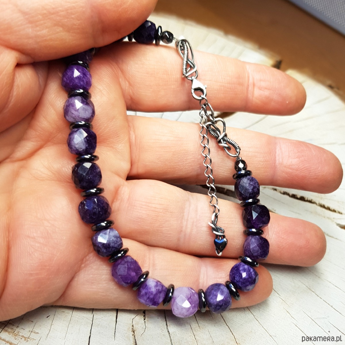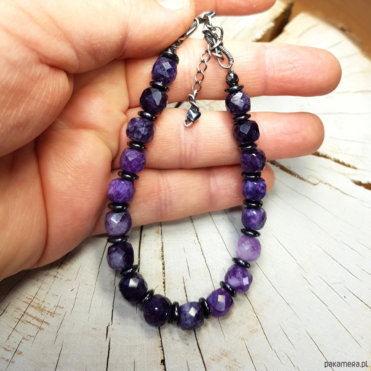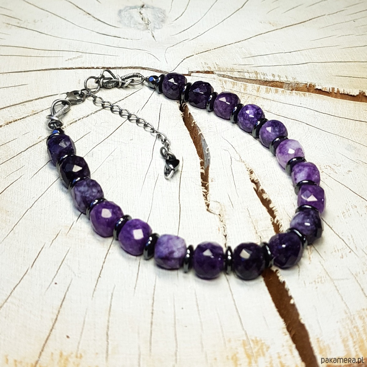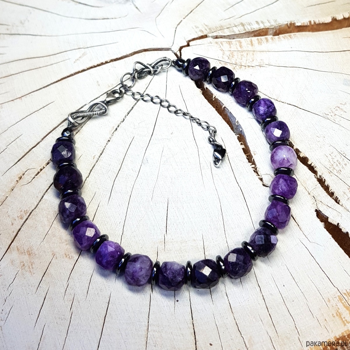 Bransoletka wykonana z naturalnych kwadratowych 7mm kamieni ametystu. Zapięcie i łańcuszek wykonane w srebrze, które zostało przyczernione oksydą i wypolerowane. Długość bransoletki wynosi ok. 20,5 cm, plus łańcuszek regulacyjny 3,5 cm. Na życzenie wykonam w innym rozmiarze
