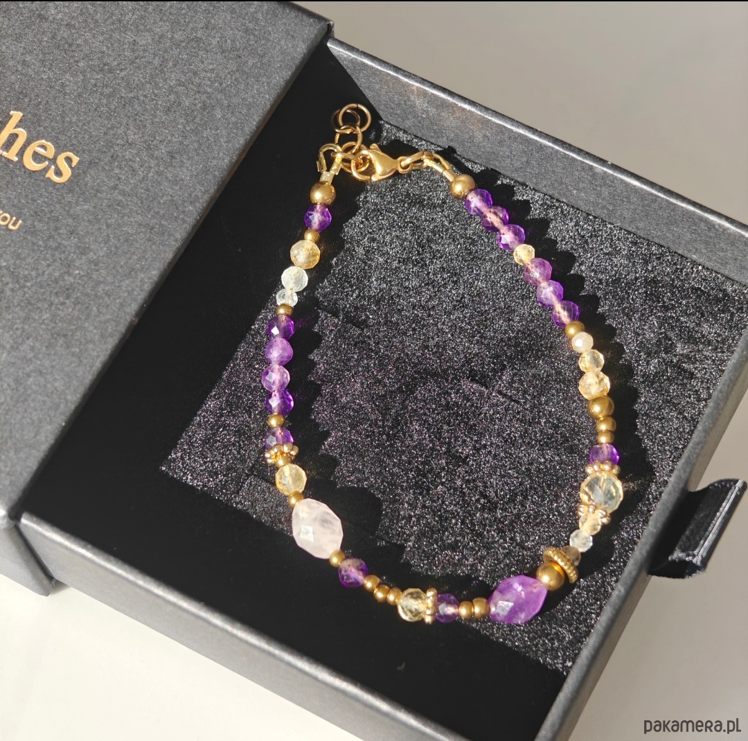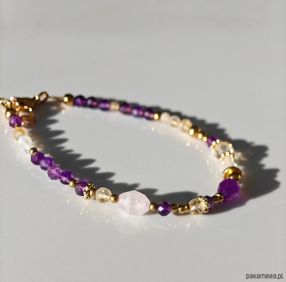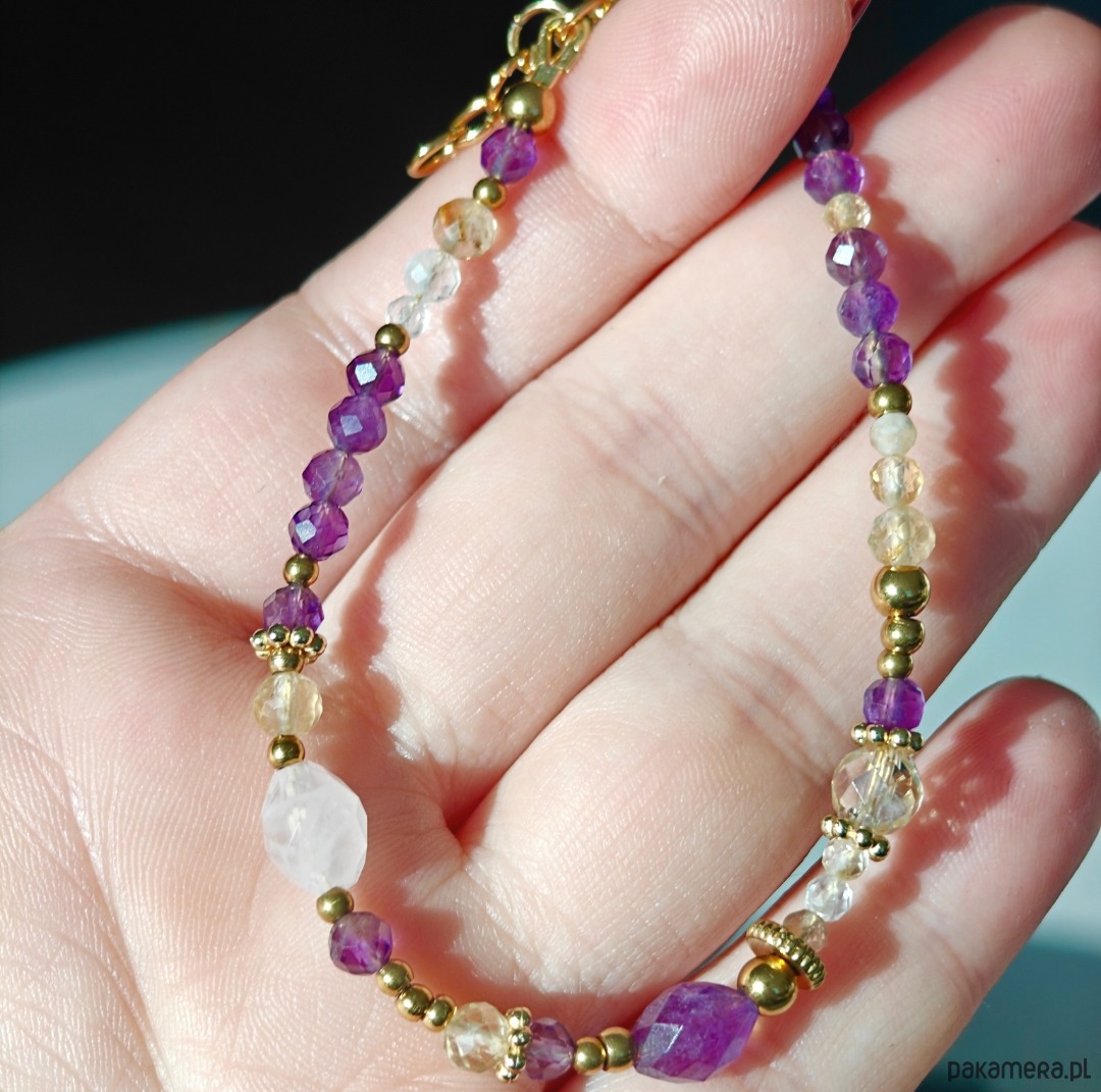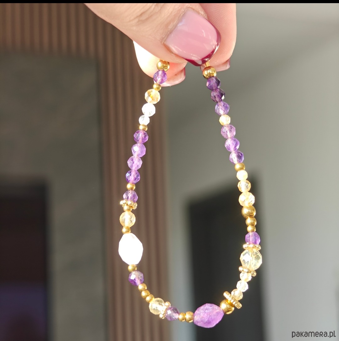 Bransoletka wykonana z ametystu, kryształu górskiego i cytrynu w delikatnym, harmonijnym połączeniu barw. Długość bransoletki to 19 cm + 2 cm regulacji, dzięki czemu wygodnie dopasowuje się do nadgarstka. Całość uzupełniają elementy ze stali chirurgicznej oraz drobne akcenty ze srebra pozłacanego, które dodają subtelnego blasku.