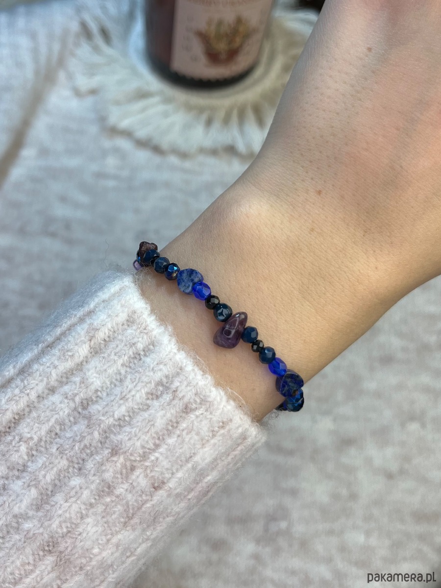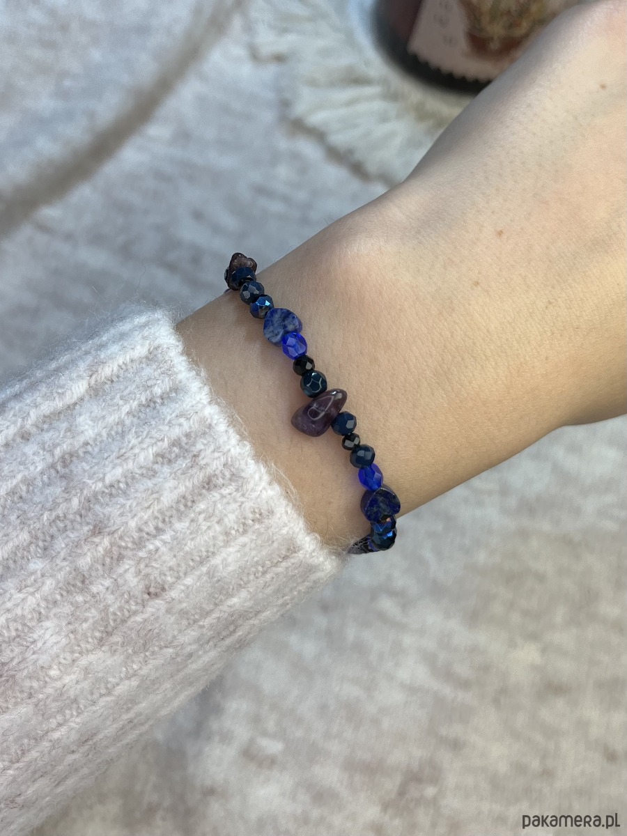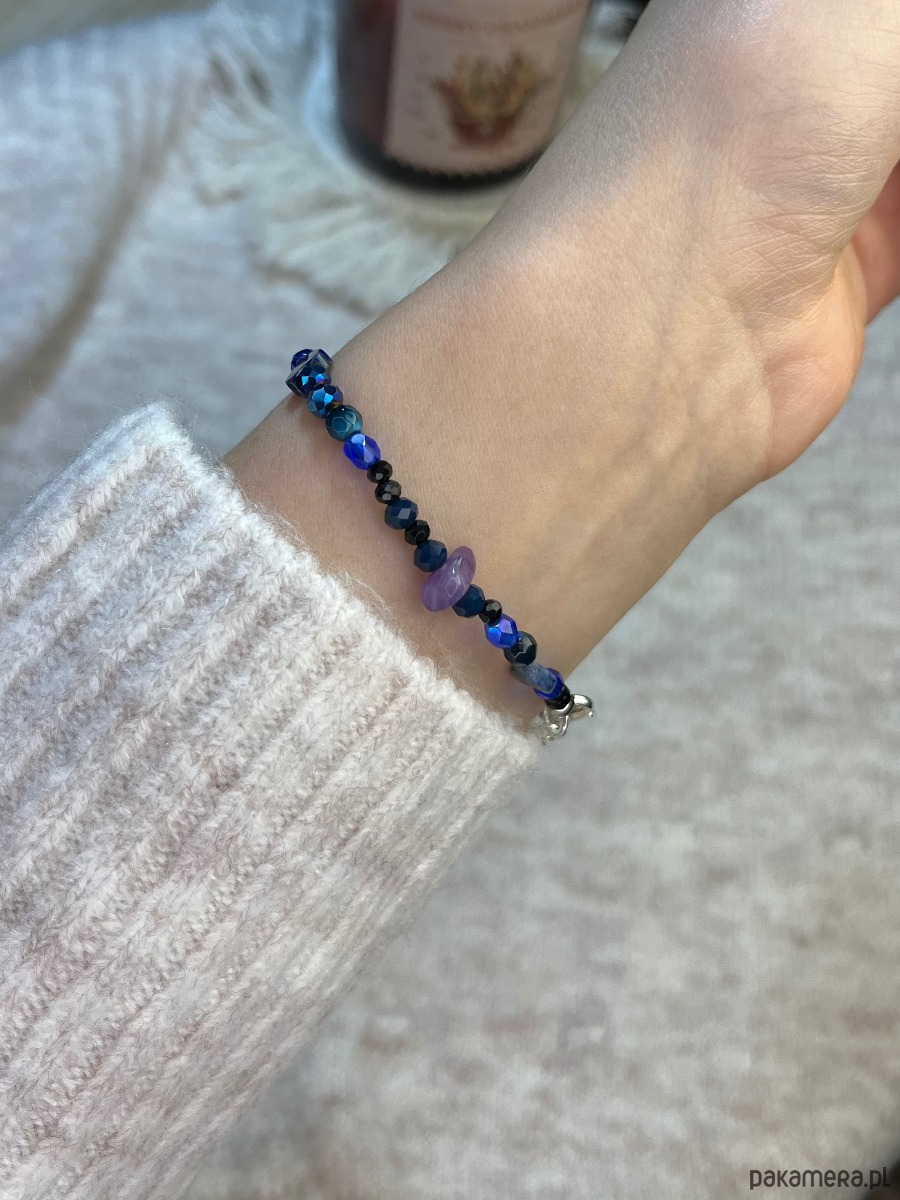 Bransoletka ręcznie wykonana ze szklanych koralików oraz kamieni naturalnych - ametystu, agatu i lapis lazuli.