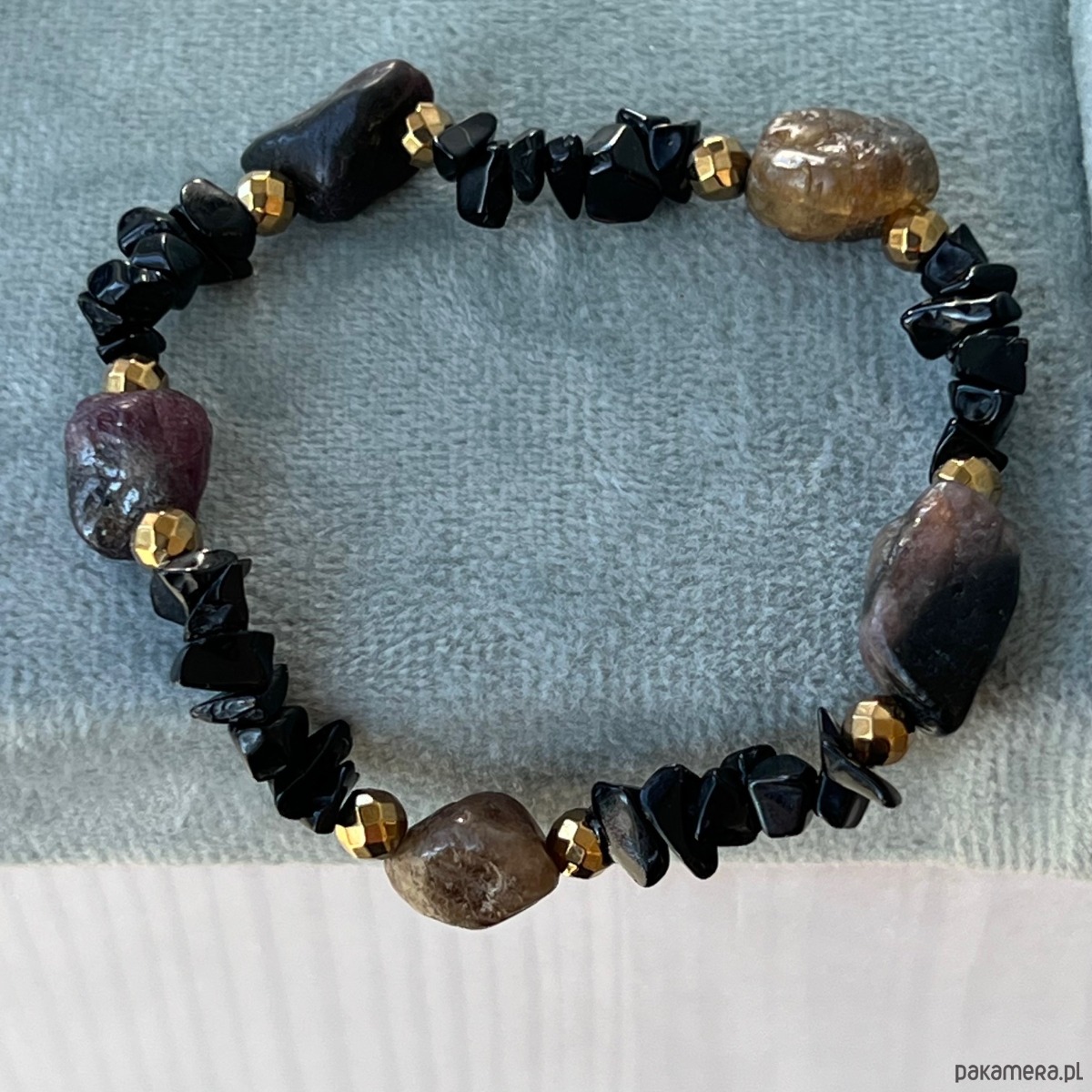 BRANSOLETKA - AMULET - Czarne turmaliny, onyks, złote kulki