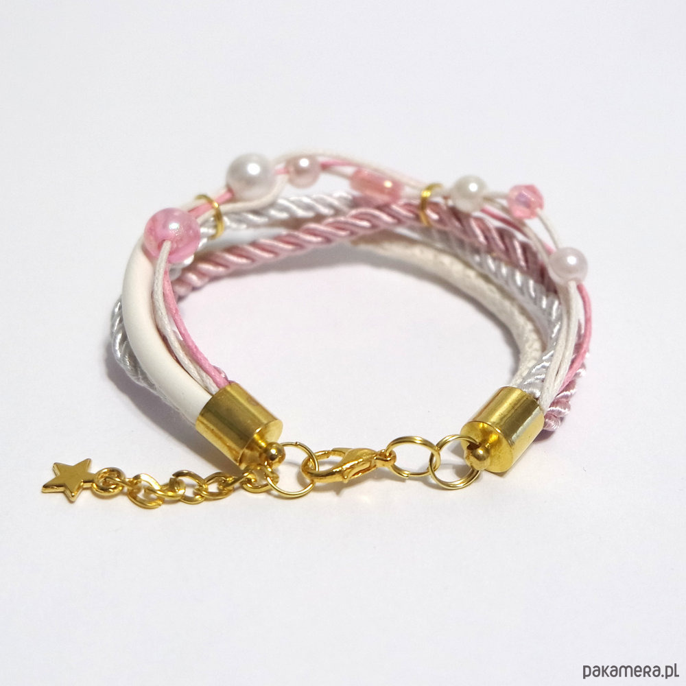 Bransoletka zrobiona jest z rzemieni z eko-skóry, sznurka, koralików oraz zawieszek.