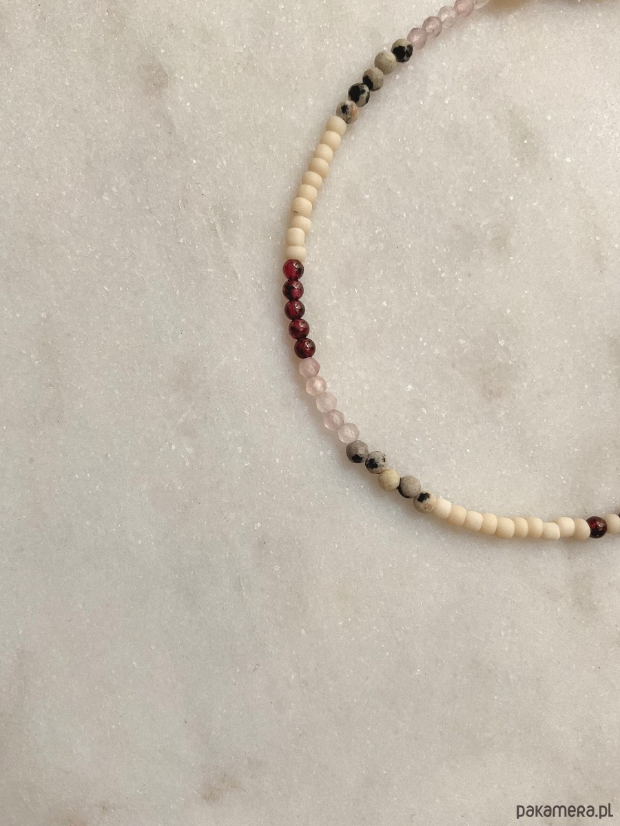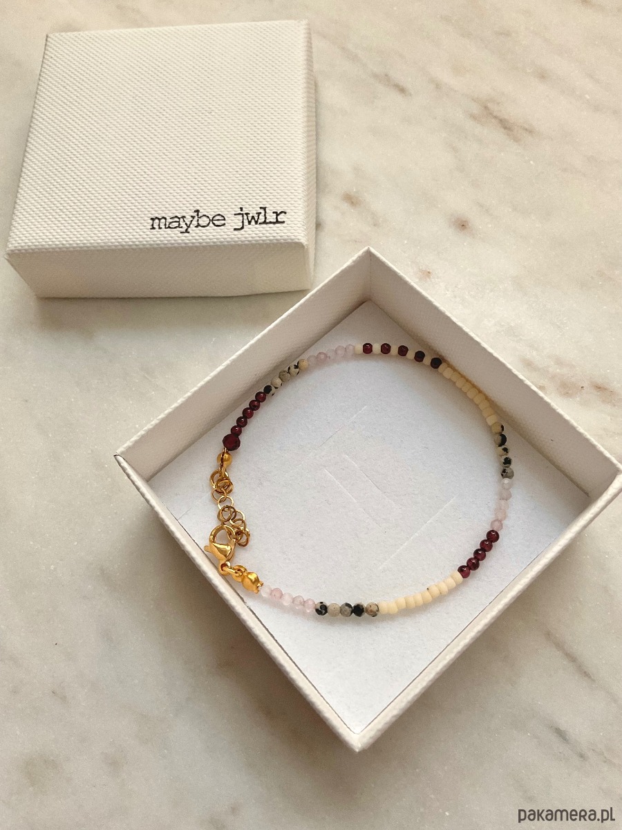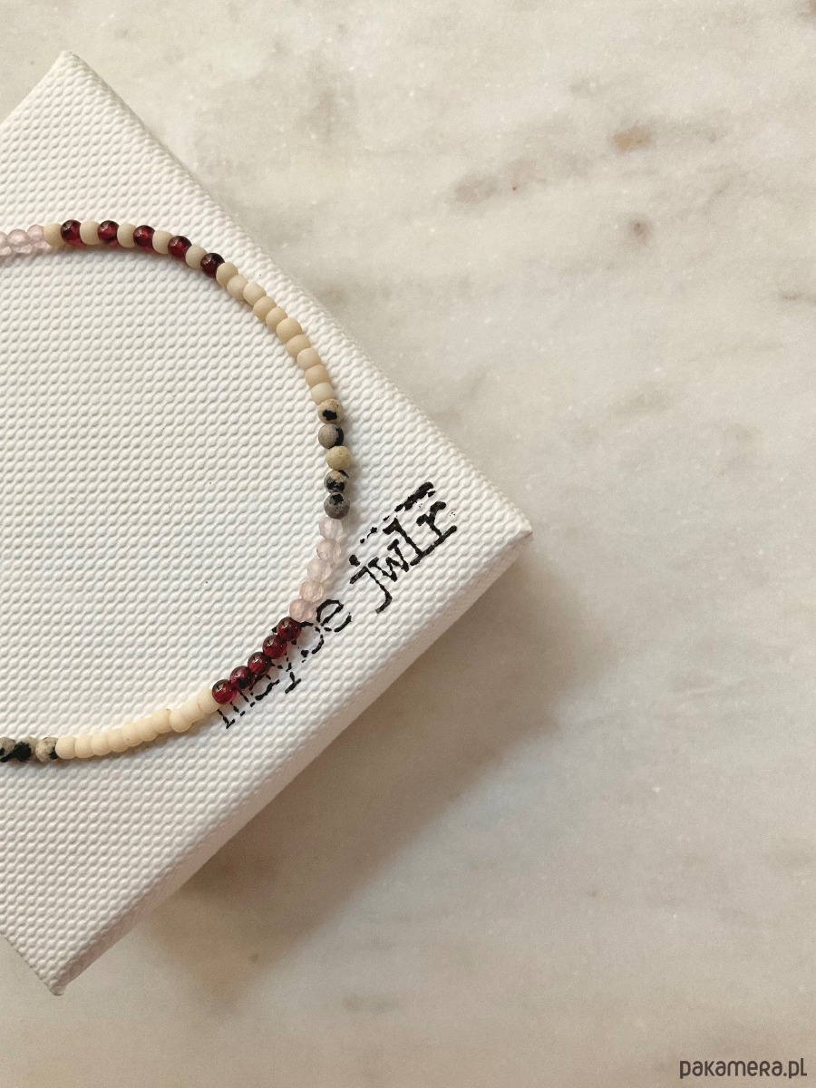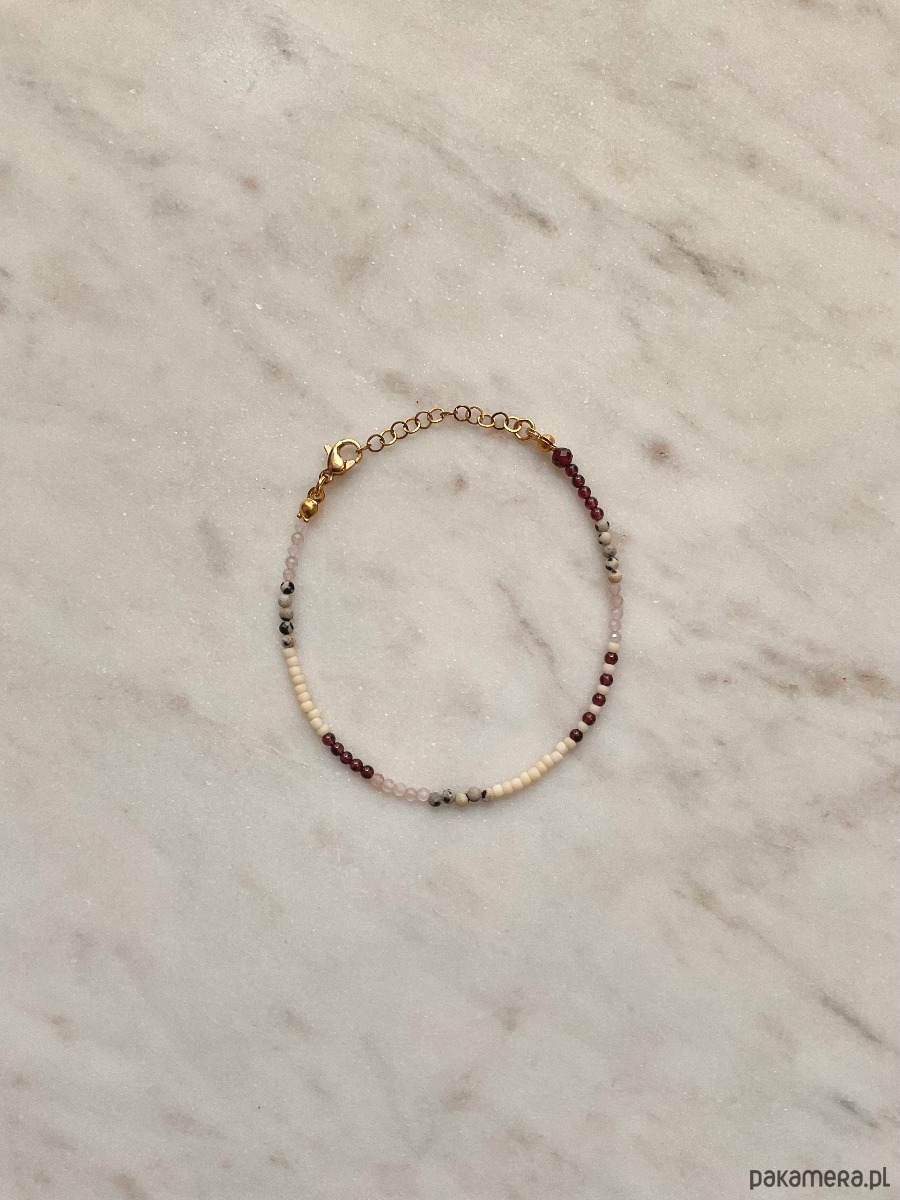 Delikatna bransoletka z koralików Toho i kamieni naturalnych granat, cyrkonia, jaspis dalmatyński.