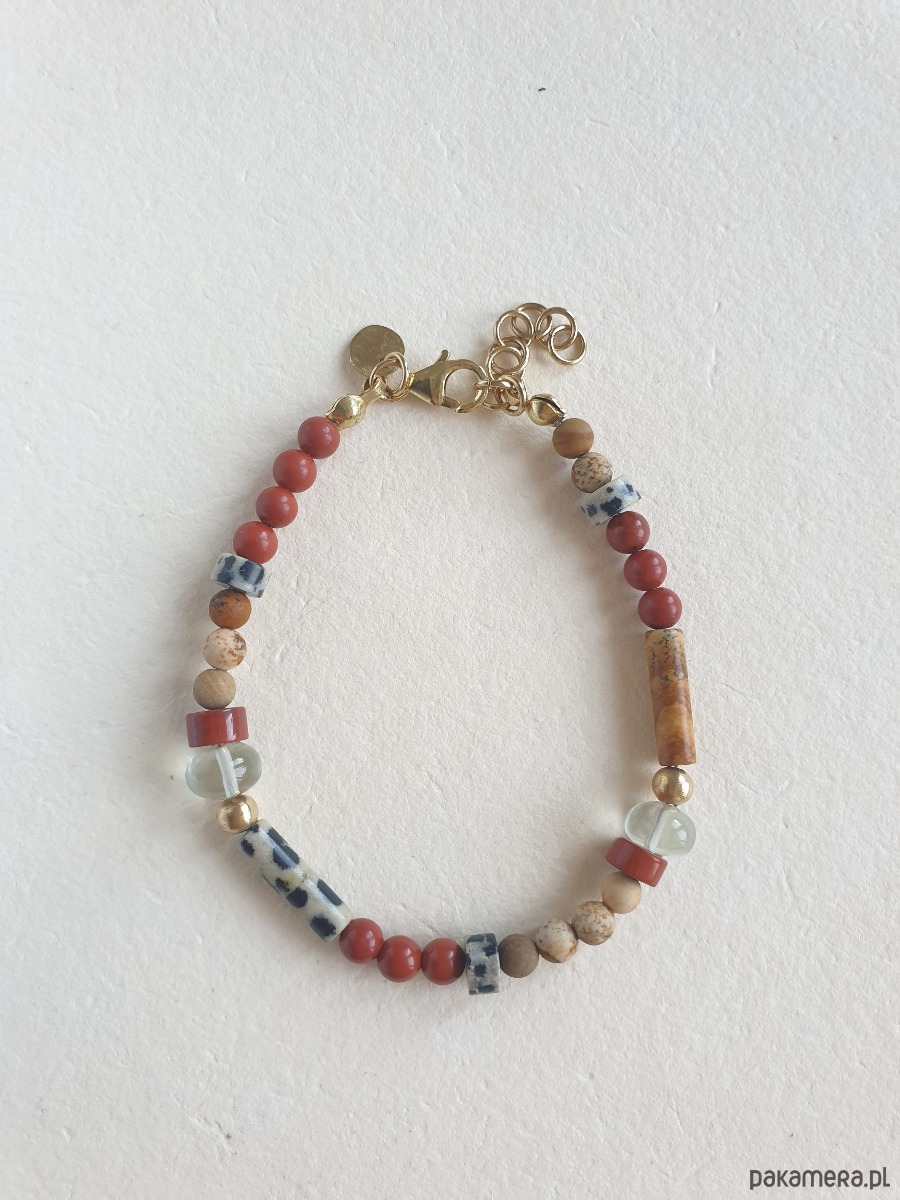Minimalistyczna delikatna bransoletka z kolekcji ANTYK inspirowanej antykiem. Tworzona ręcznie z kamieni naturalnych, elementów z surowego mosiądzu i kamieni naturalnych. W tej - jaspis dalmatyński, prasiolit, jaspis czerwony, jaspis obrazkowy