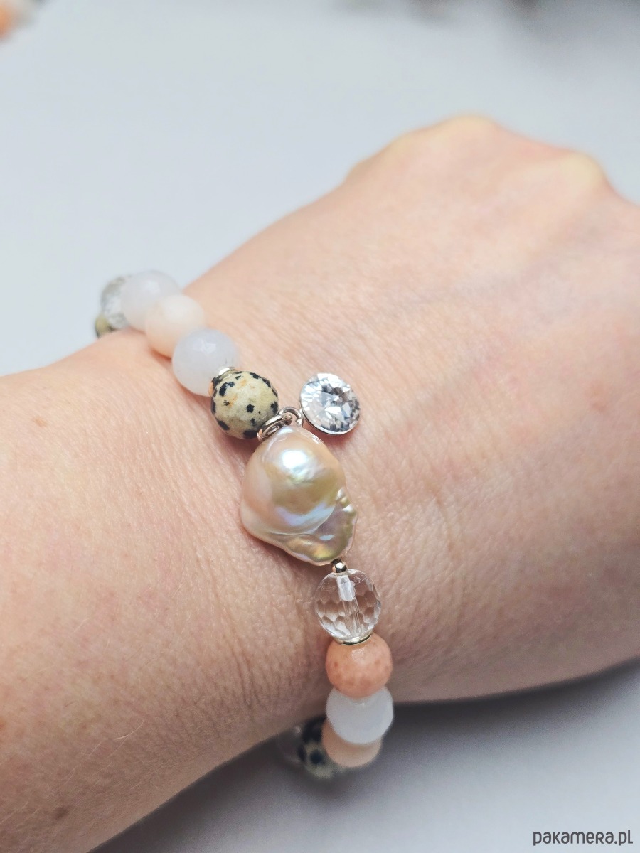 Wyjątkowa bransoletka z kamieni naturalnych tj.: awenturyn brzoskwiniowy, jaspis dalmatyński, kryształ górski.