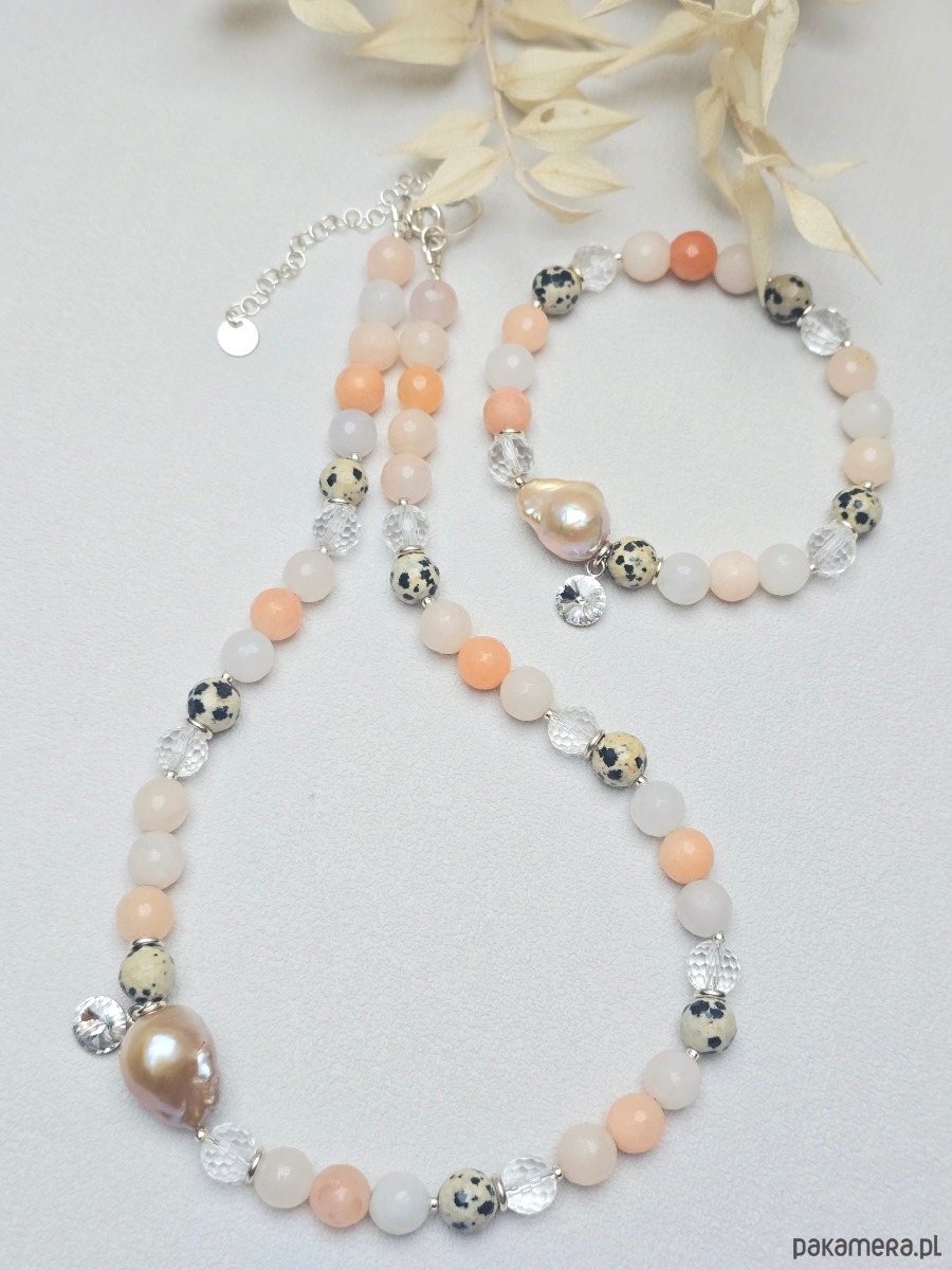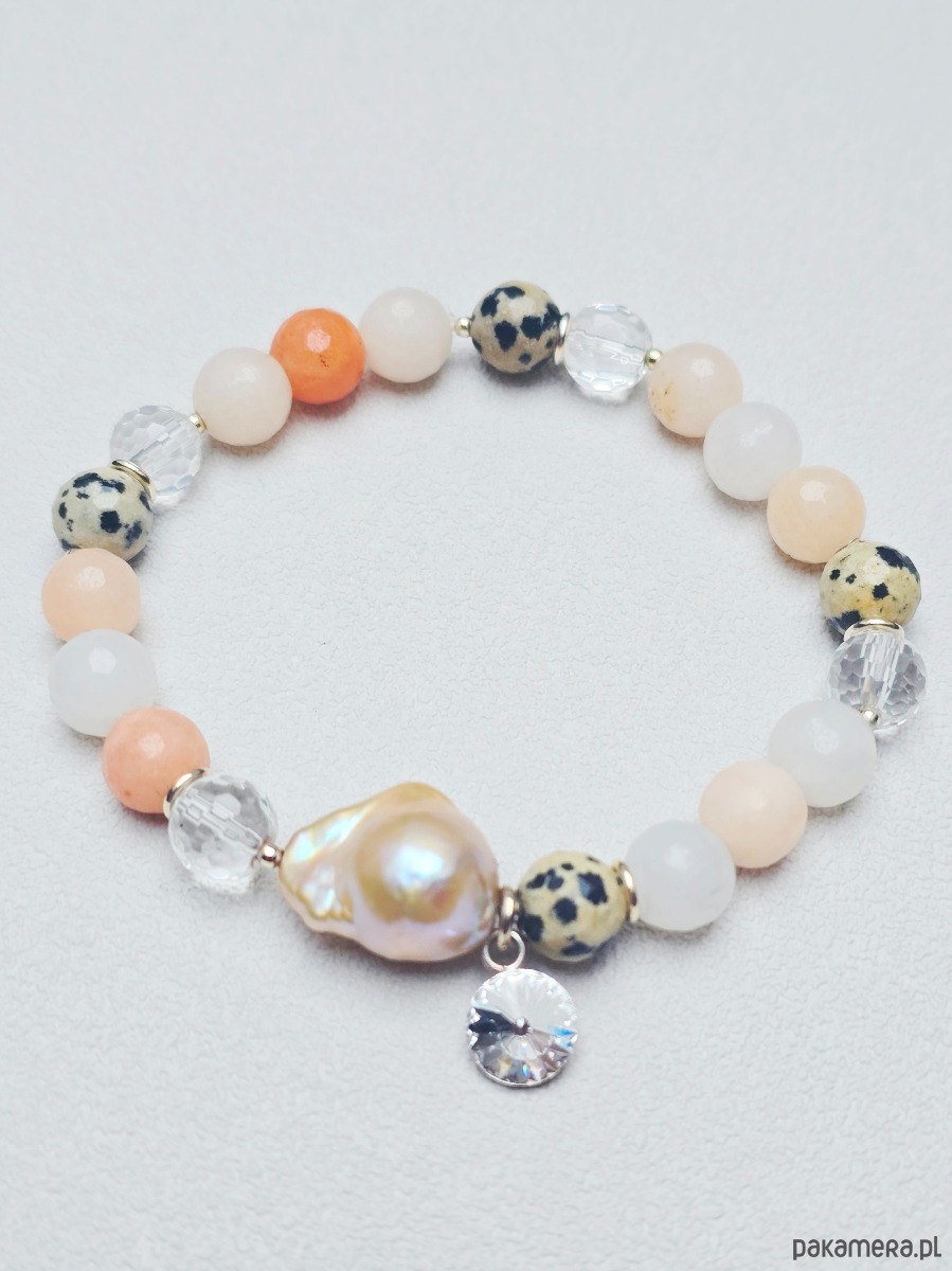 Wyjątkowa bransoletka z kamieni naturalnych tj.: awenturyn brzoskwiniowy, jaspis dalmatyński, kryształ górski.