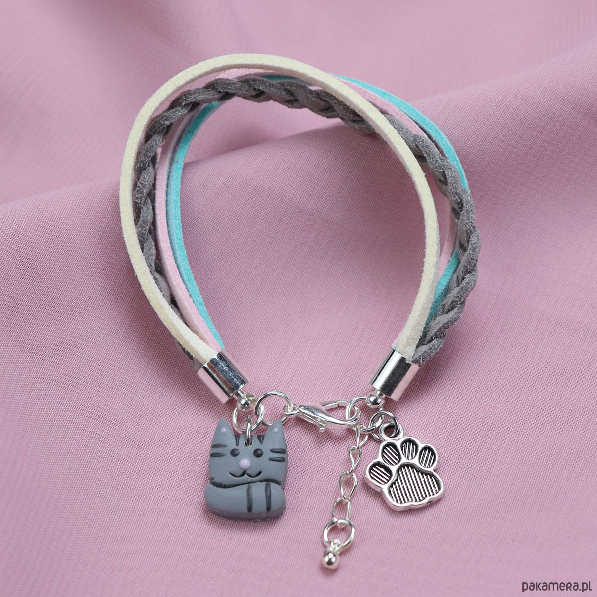 Bransoletka została wykonana z sznurków i rzemieni. Jej główną ozdobę stanowi szary kot. Miniaturowe figurki zostały wykonane ręcznie z masy Fimo.