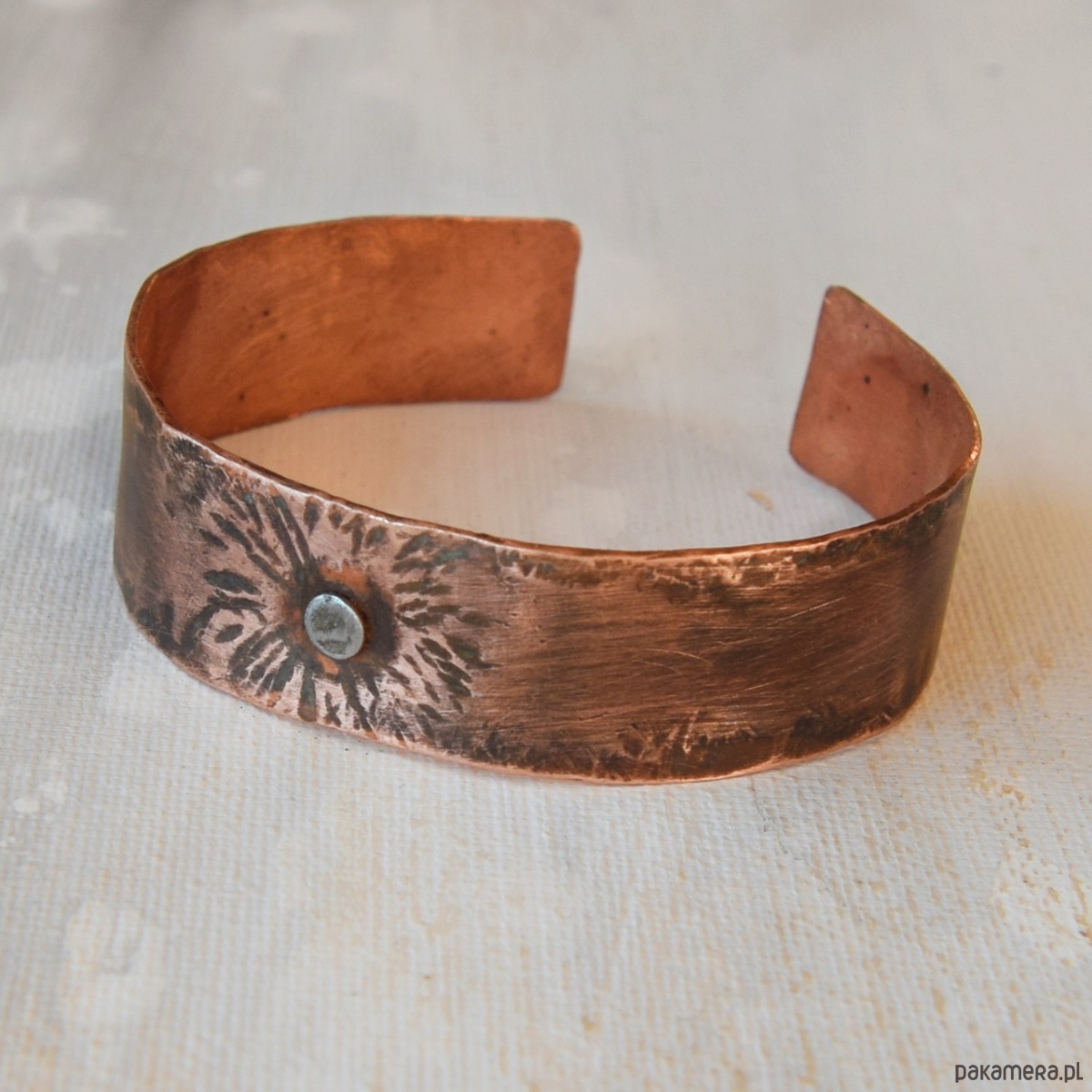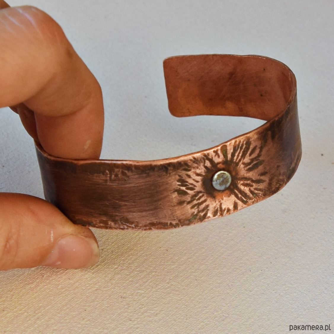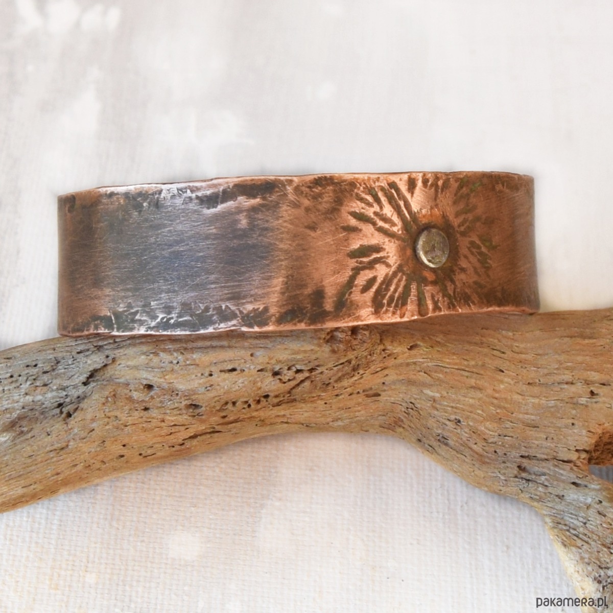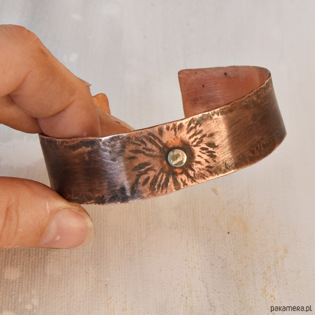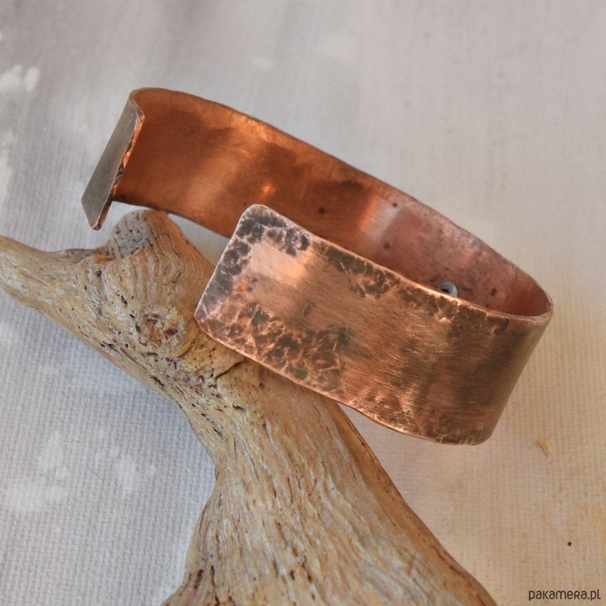 Bransoletka bangla wykonana z ręcznie kutej i oksydowanej miedzi, częściowo przecieranej papierem ściernym, o surowym charakterze stylizowanym na stary, "wykopaliskowy" metal.