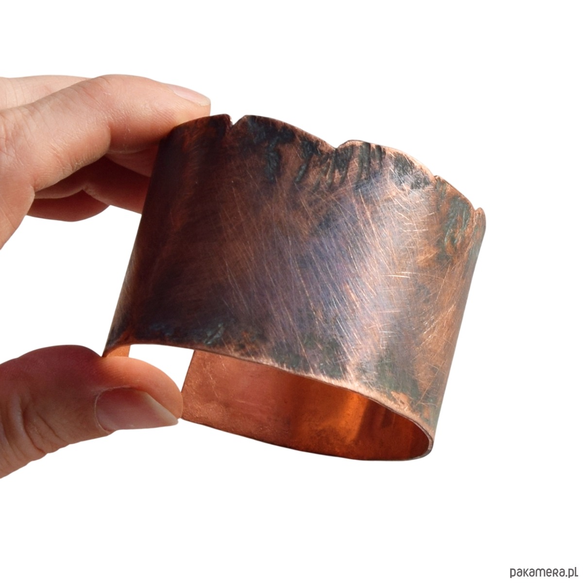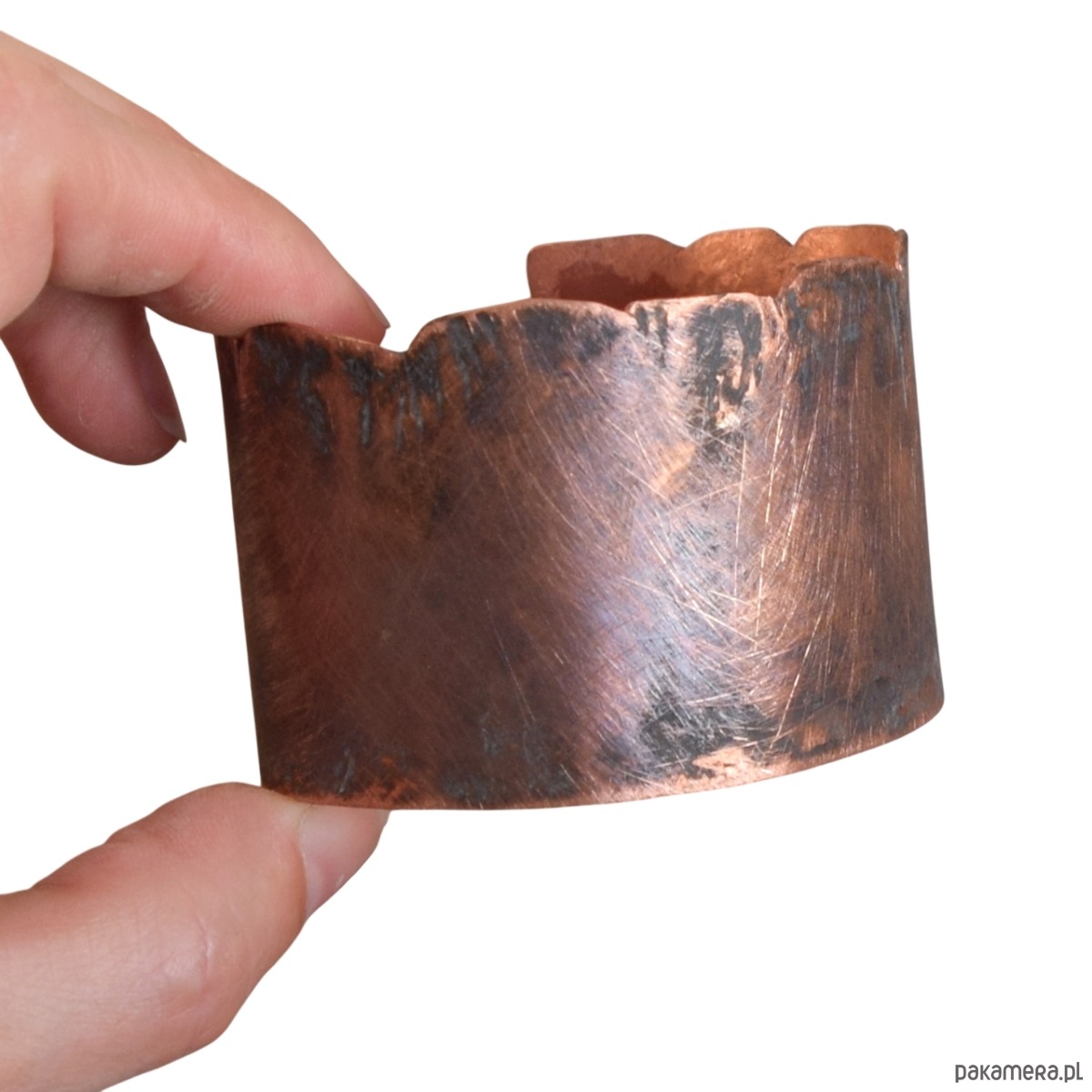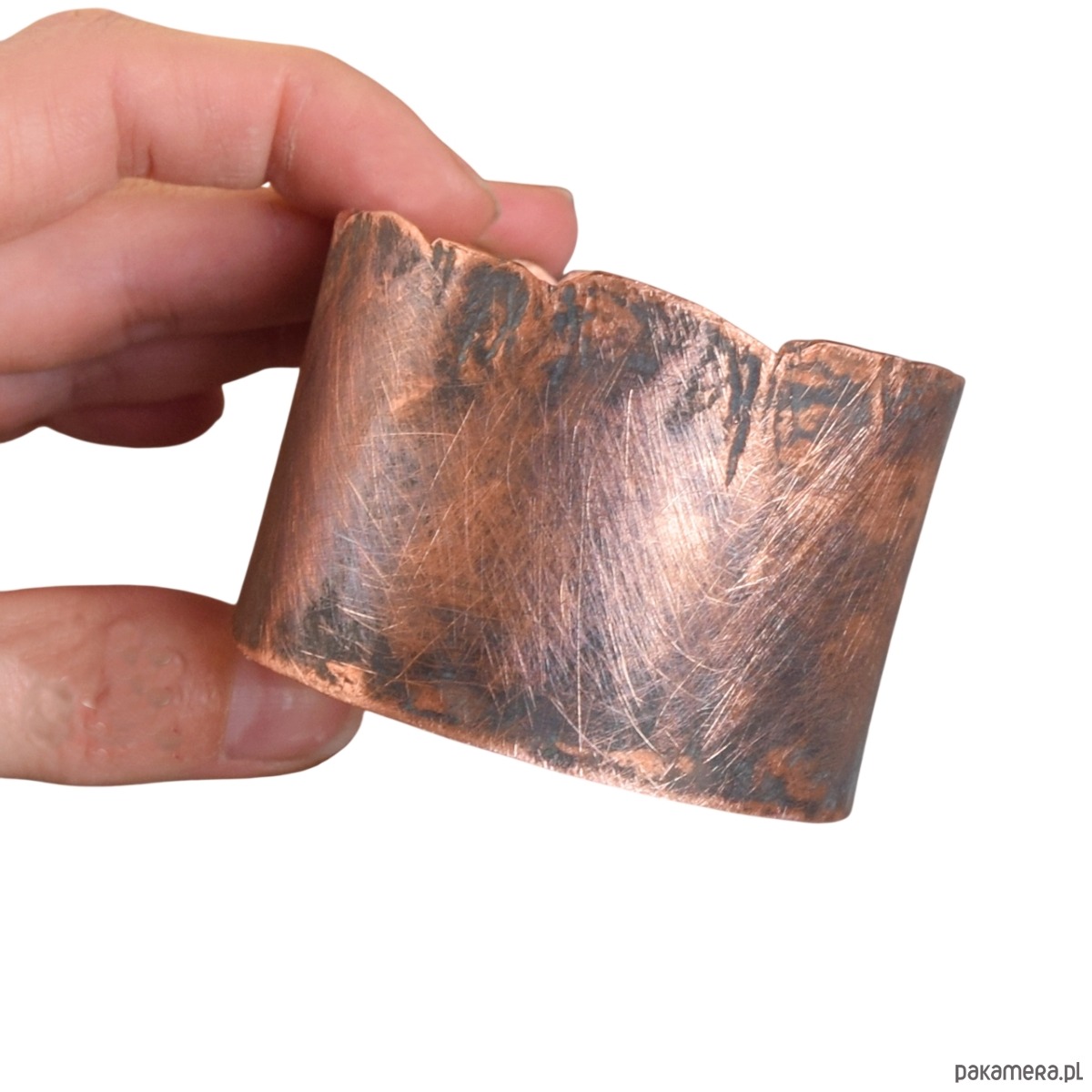 Bransoletka bangla wykonana z ręcznie kutej i oksydowanej miedzi, częściowo przecieranej papierem ściernym, o surowym charakterze stylizowanym na stary, "wykopaliskowy" metal.
