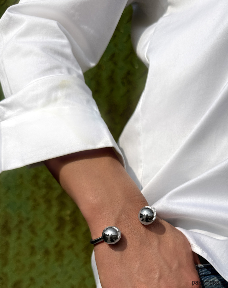Wewnątrz srebrnej rurki znajduje się miedziane umocnienie. Dzięki temu możemy swobodnie wyginać bransoletkę bez obaw o jej złamanie.