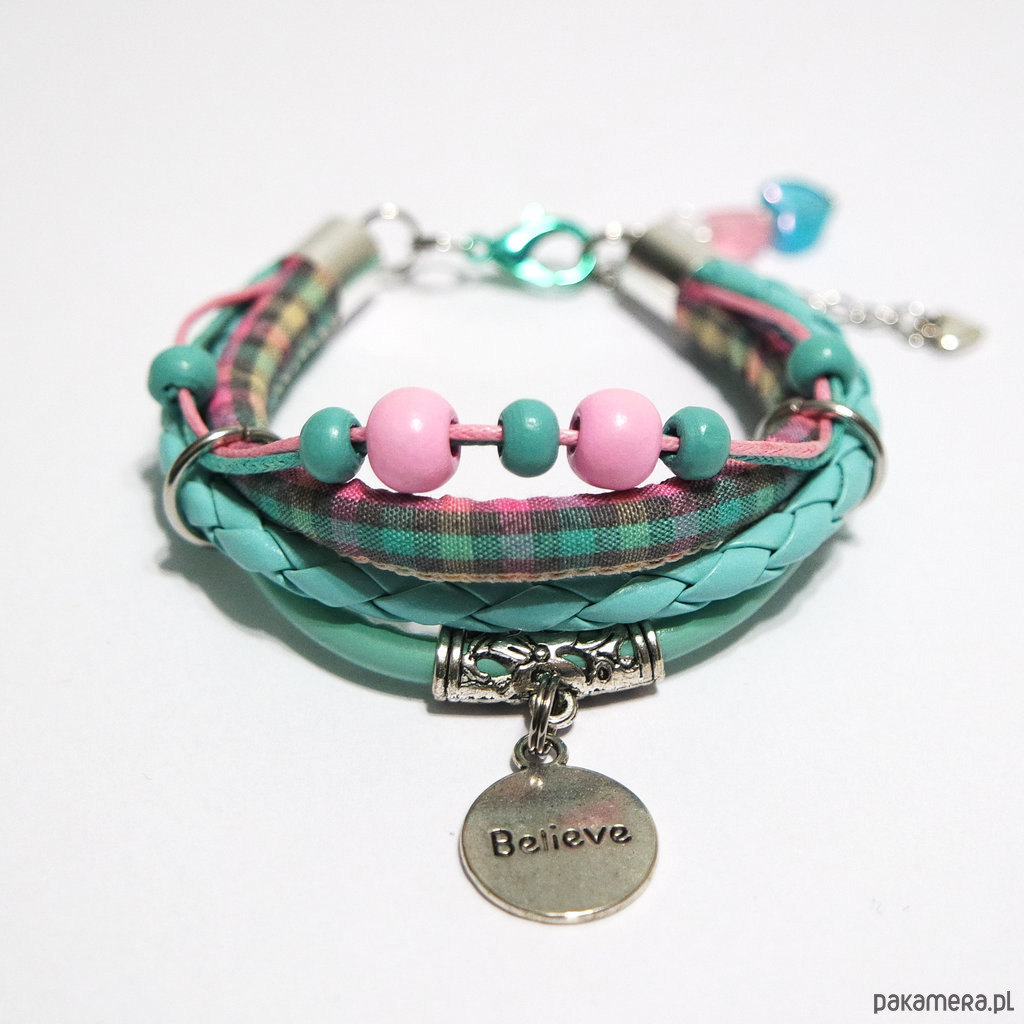 Bransoletka - Believe, inspire - rzemienie, turkus, róż