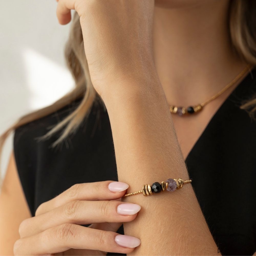 Podkreśl swój styl naszą bestsellerową bransoletką z Hematytu, Turmalinu czarnego i Ametystu. Ten wyjątkowy model łączy w sobie elegancję, nowoczesność i naturalne piękno kamieni, tworząc kompozycję, która przyciąga spojrzenia i doskonale dopełnia każdą stylizację. Centralnym elementem bransoletki są trzy naturalne kamienie o wyjątkowej energii. Turmalin czarny to kamień ochrony i siły – neutralizuje negatywną energię, wzmacnia poczucie bezpieczeństwa i pomaga zachować wewnętrzny spokój. Ametyst to kamień harmonii, duchowej równowagi i klarowności myśli – wspiera intuicję, łagodzi stres i pomaga odnaleźć spokój w codziennym życiu. Hematyt natomiast stabilizuje emocje, dodaje odwagi i podkreśla elegancki charakter biżuterii swoim metalicznym blaskiem.