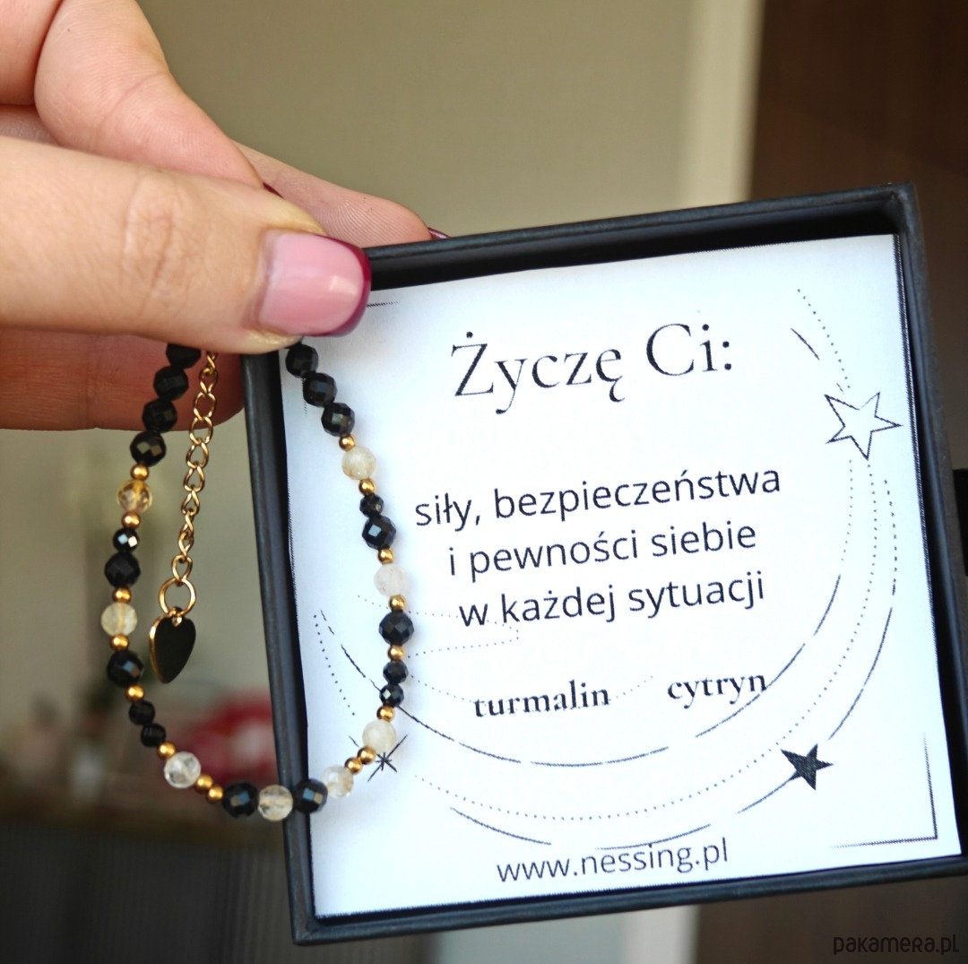 Czarny turmalin to symbol ochrony i spokoju, a cytryn dodaje energii, odwagi i lekkości. Razem tworzą intencję siły, bezpieczeństwa i pewności siebie.