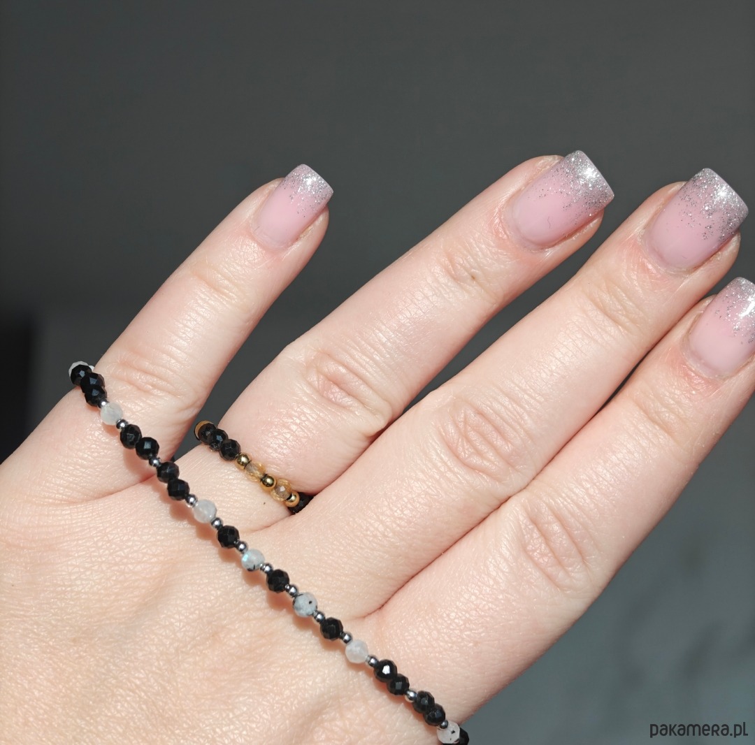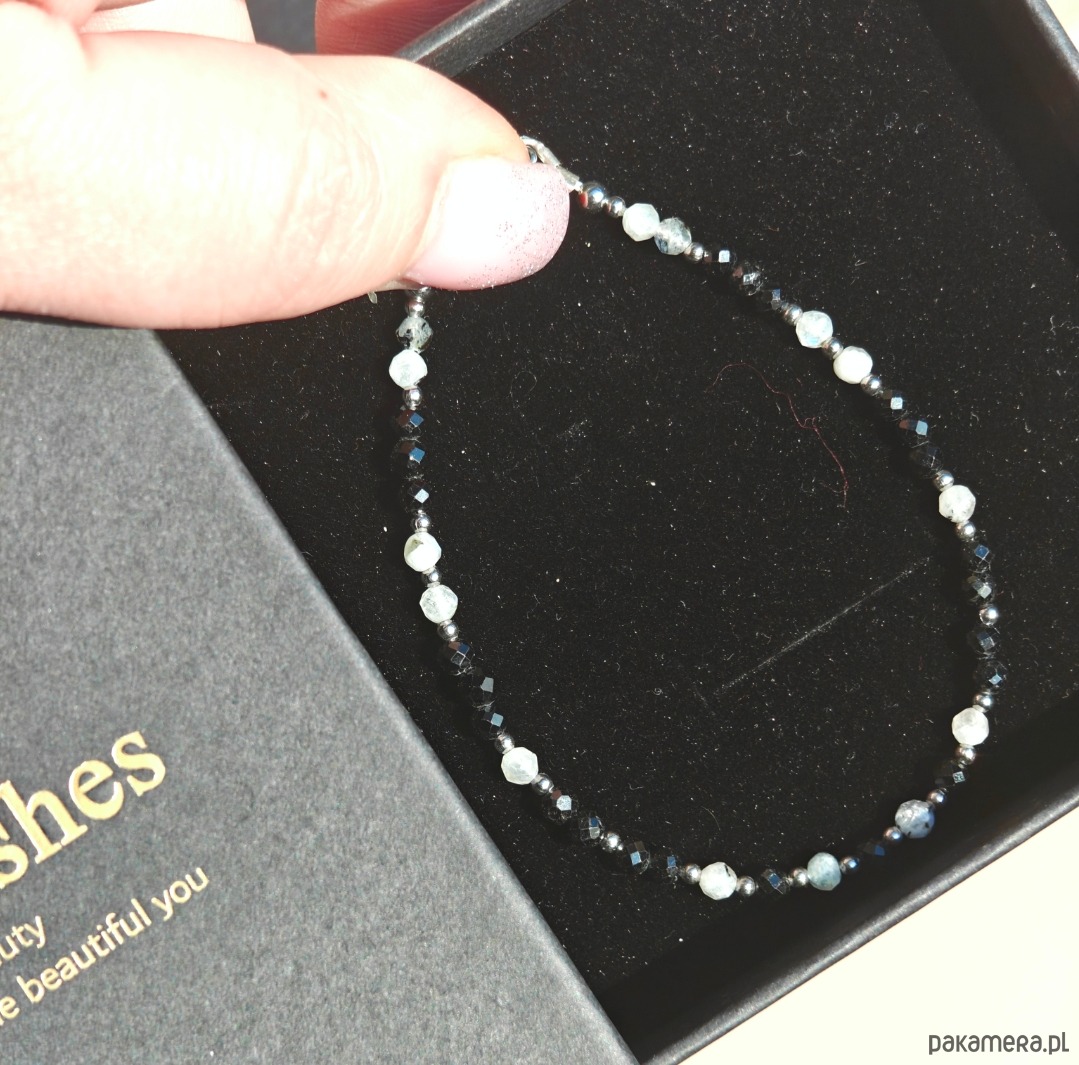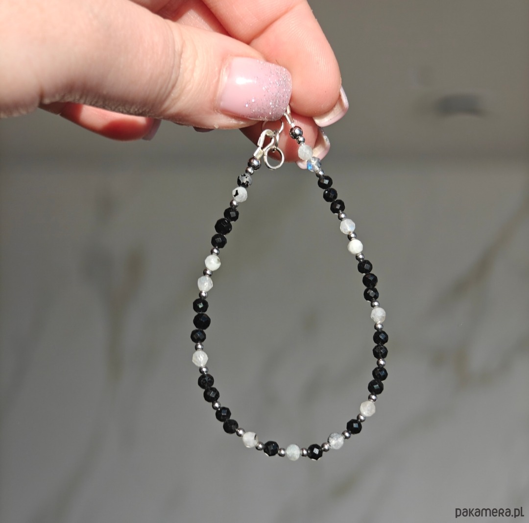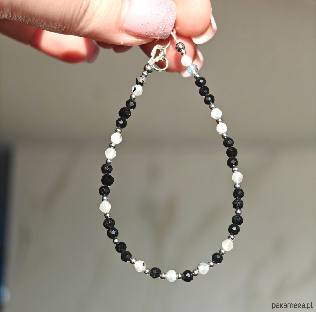 Bransoletka o długości 18 cm z dodatkową regulacją 1 cm, wykonana z naturalnych kamieni: turmalinu oraz kamienia księżycowego. Całość uzupełniają elementy ze stali chirurgicznej oraz drobne elementy ze srebra pozłacanego, które nadają biżuterii subtelny blask i elegancki charakter. Delikatna, a jednocześnie wyrazista, doskonale sprawdzi się zarówno w codziennych stylizacjach, jak i na wyjątkowe okazje.
