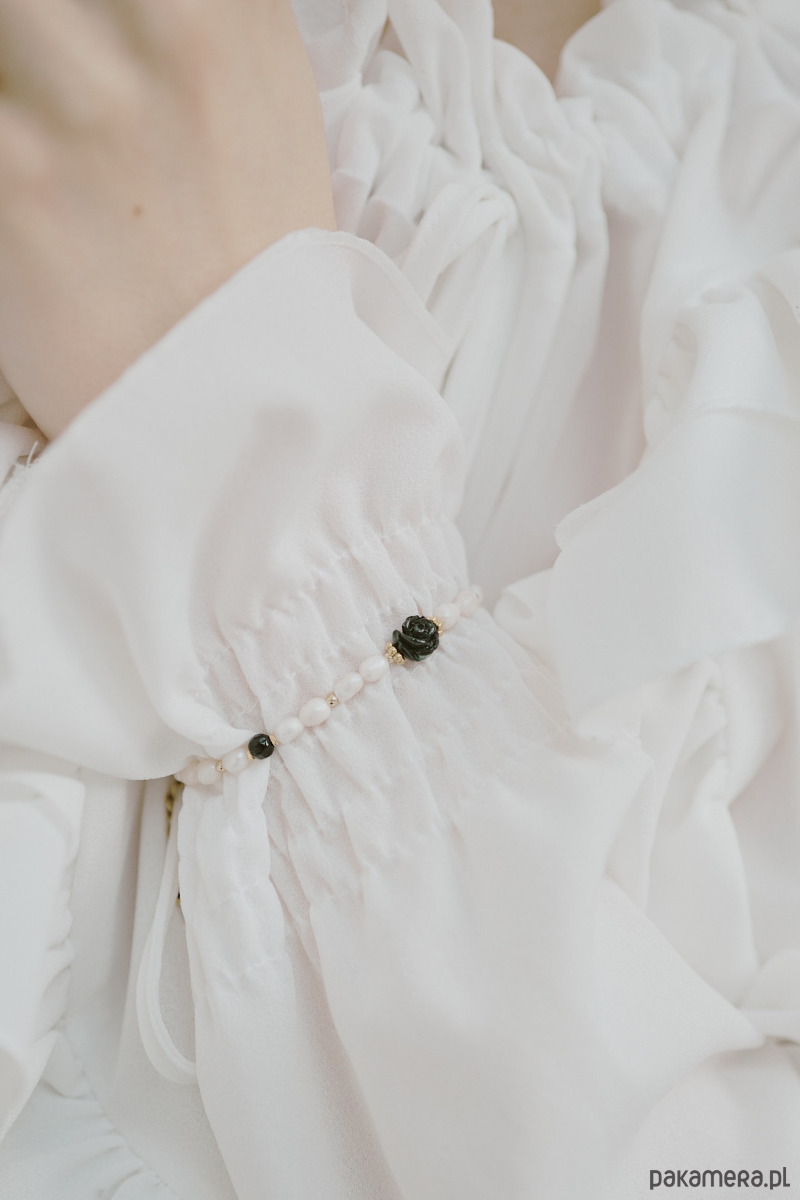 Wykonana została z naturalnych pereł, czarnego onyksu i róży z żywicy akrylowej.