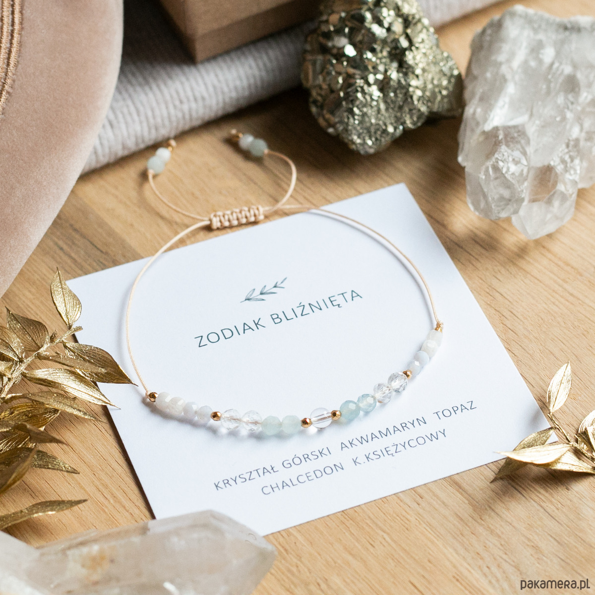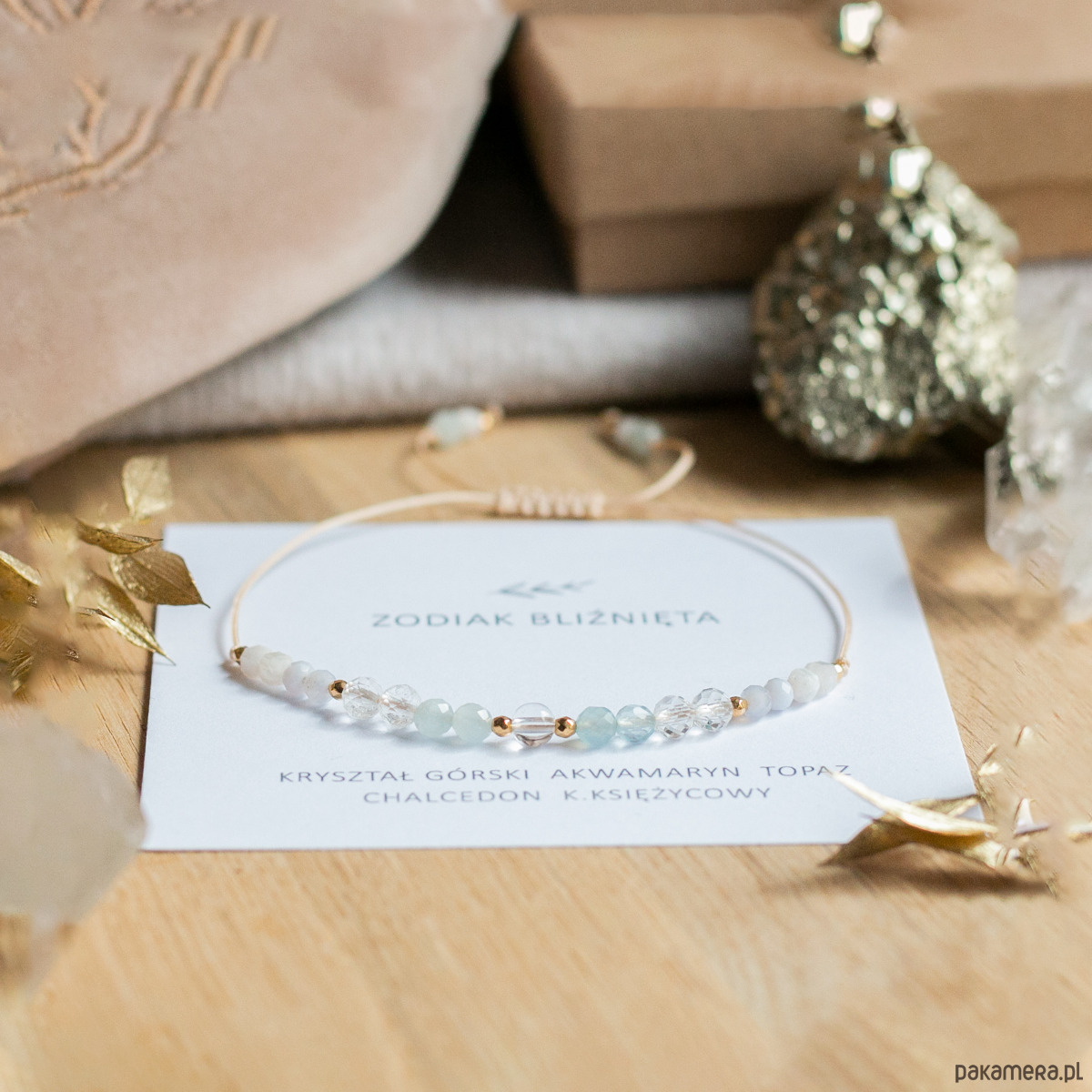 Zodiak Bliźnięta - Ta piękna bransoletka damska została wykonana z kamieni naturalnych dla zodiakalnych Bliźniąt: Kryształ Górski, Akwamaryn, Topaz, Chalcedon i Kamień Księżycowy.