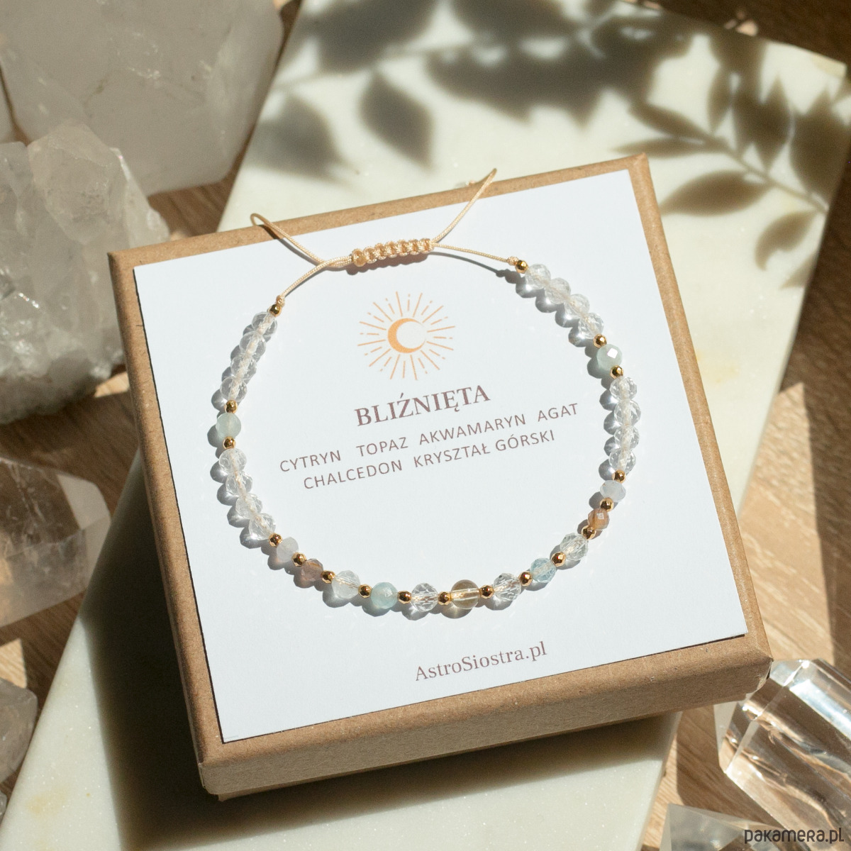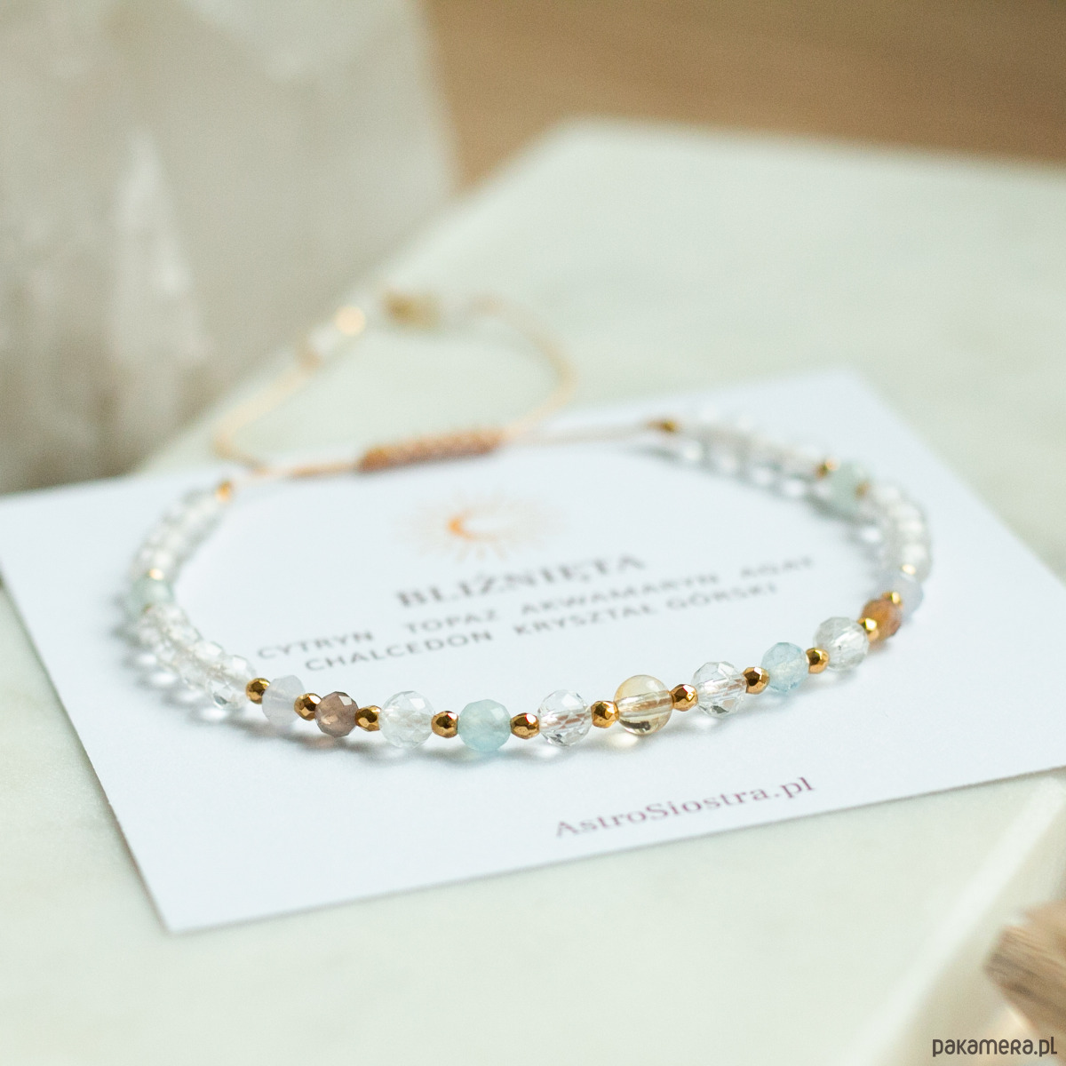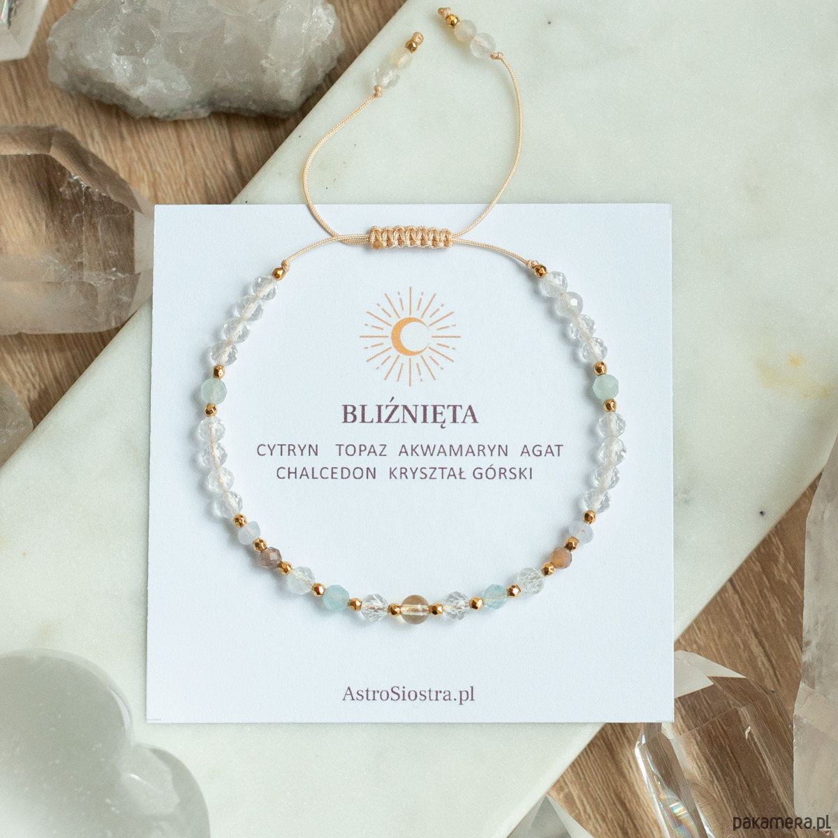 Zodiak Bliźnięta - Bransoletka z dopasowanymi szczęśliwymi kamieniami dla zodiakalnych bliźniąt: Kryształ Górski, Cytryn, Topaz, Akwamaryn Agat i Chalcedon.