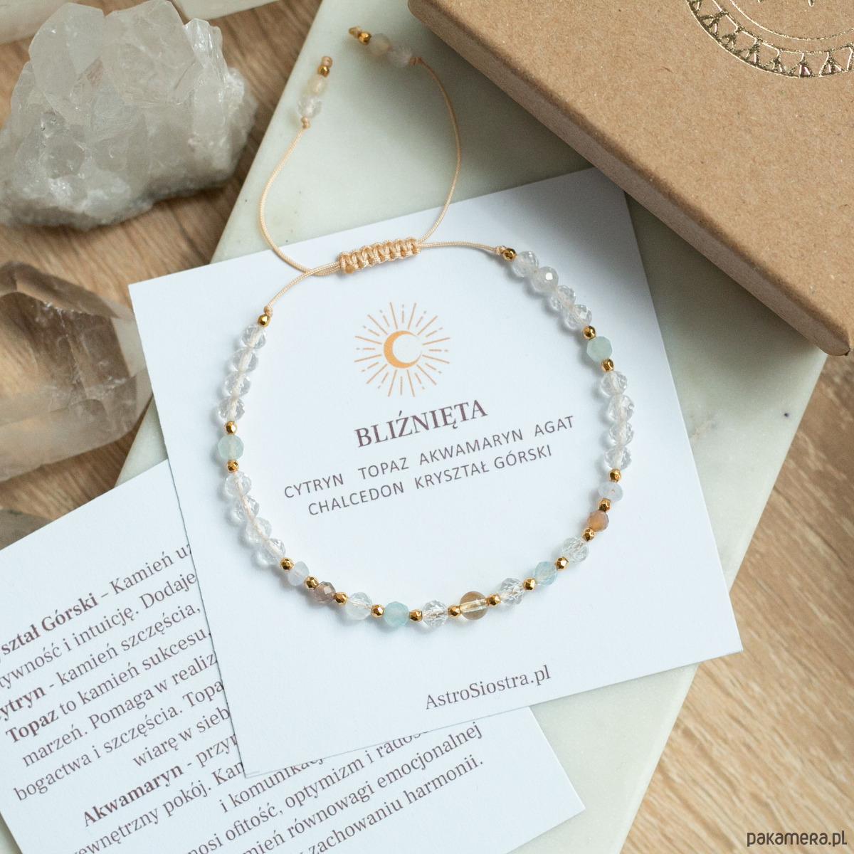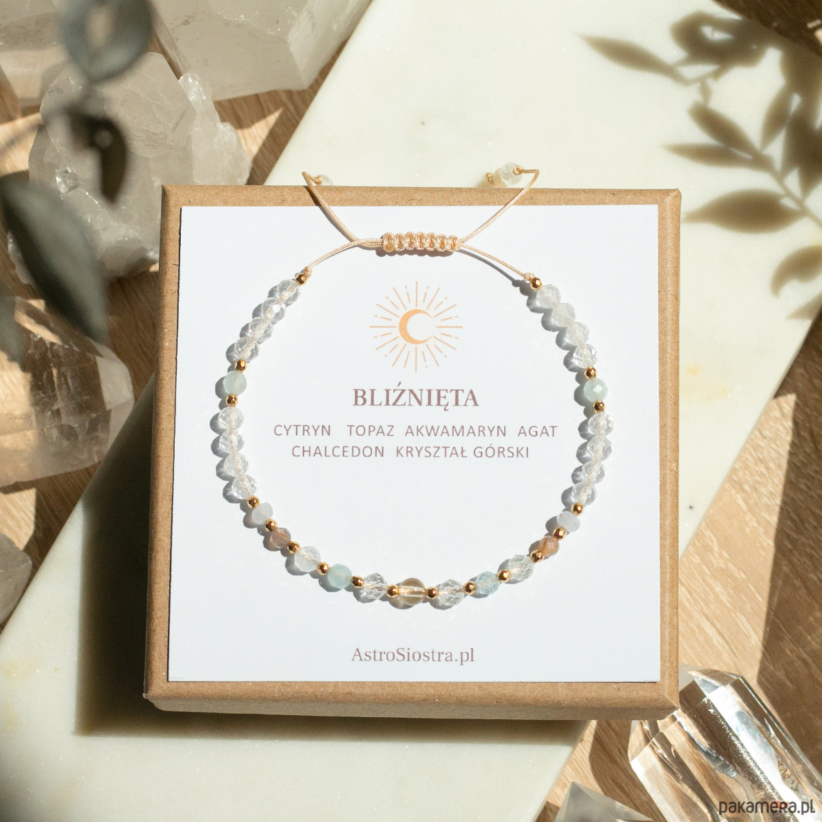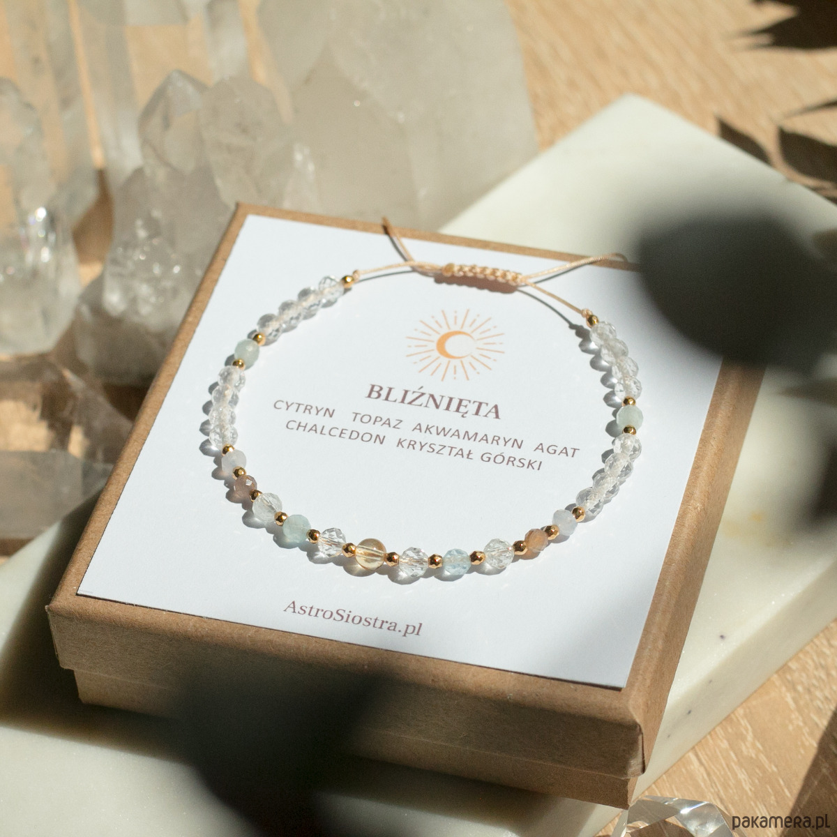 Zodiak Bliźnięta - Bransoletka z dopasowanymi szczęśliwymi kamieniami dla zodiakalnych bliźniąt: Kryształ Górski, Cytryn, Topaz, Akwamaryn Agat i Chalcedon.