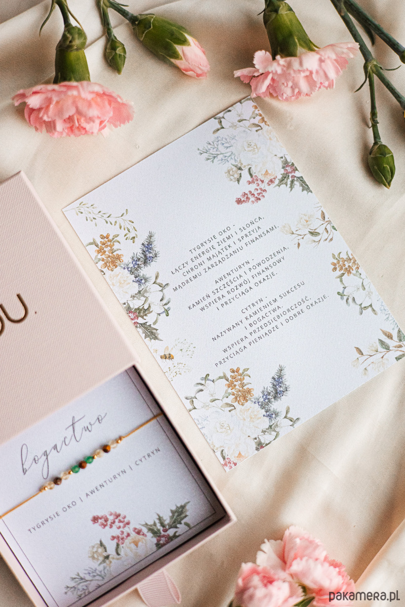 -karteczka z nazwami użytych kamieni oraz osobna karta z opisem ich symboliki.