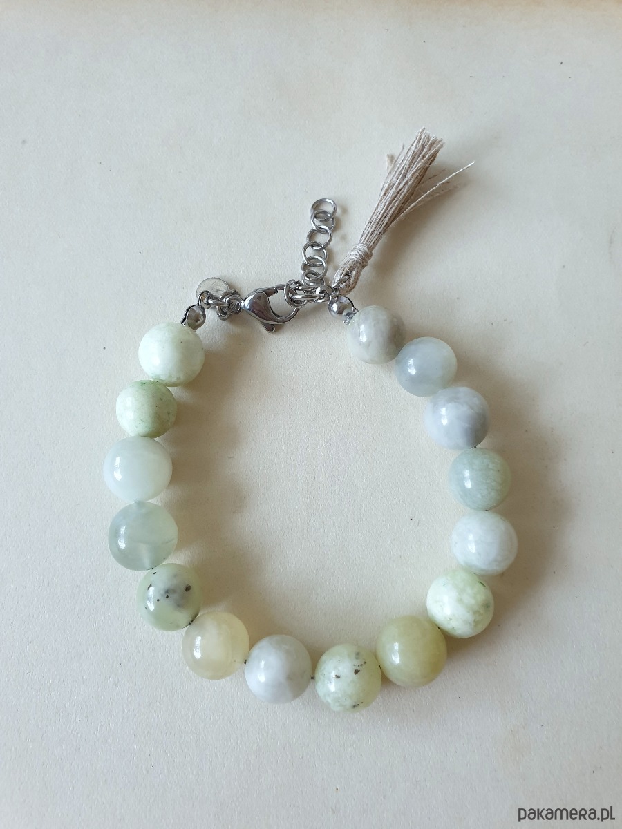 Minimalistyczna wiosenna bransoletka z kolekcji SPRING z dużymi kamieniami. Tworzona ręcznie z kamieni naturalnych, elementów ze stali szlachetnej (antyalergicznej) i lnianego chwosta. W tej - kulka naturalny jadeit. Bransoletka w stylu boho, idealna na lato do pastelowych stylizacji.