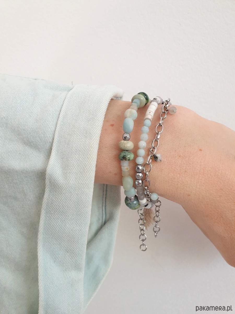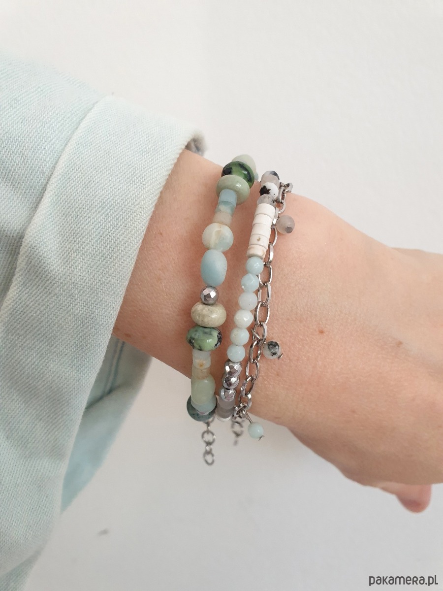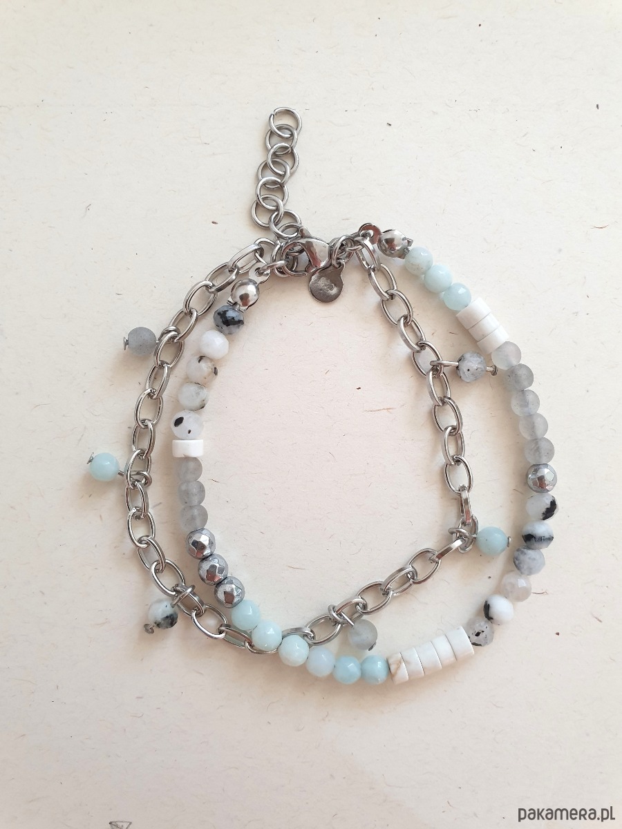 Bransoletka podwójna z łańcuszkiem i kulkami, tworzona ręcznie z kamieni naturalnych, elementów ze stali szlachetnej (antyalergicznej) W tej - fasetowany amazonit, kamień księżycowy, labradoryt matowa kulka, howlit, hematyt. Na zdjęciu przykładowa bransoletka, ta którą kupujesz będzie się minimalnie różnić bo każdy kamień jest wyjątkowy.
